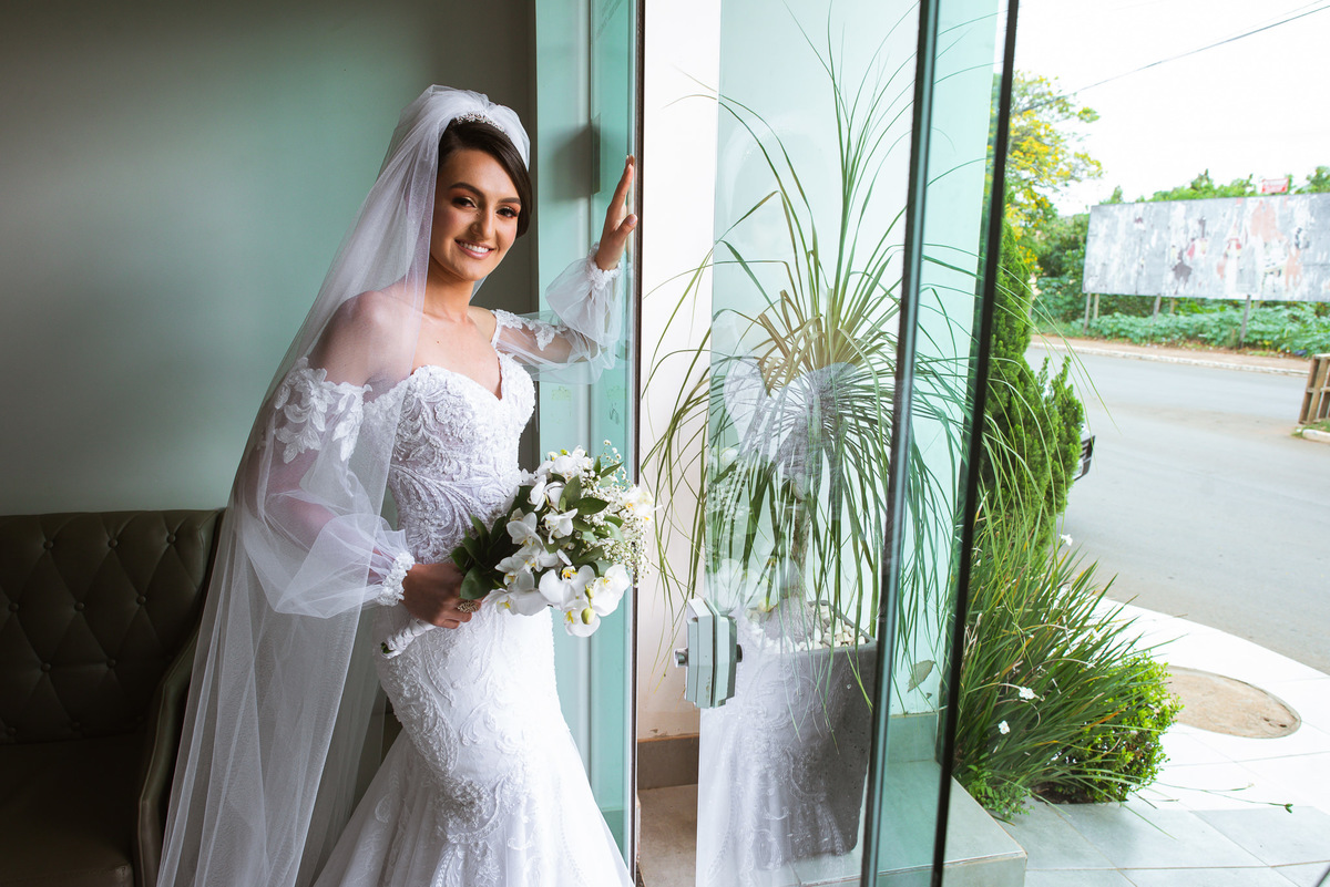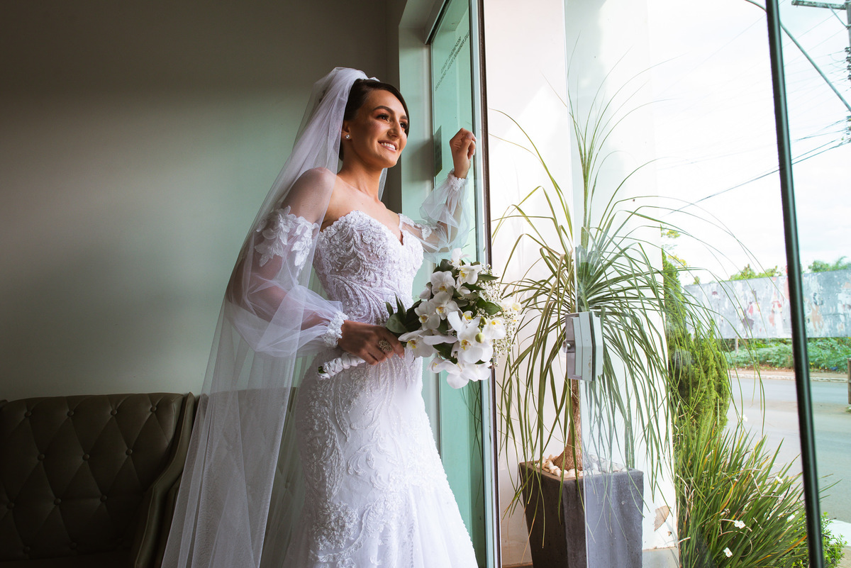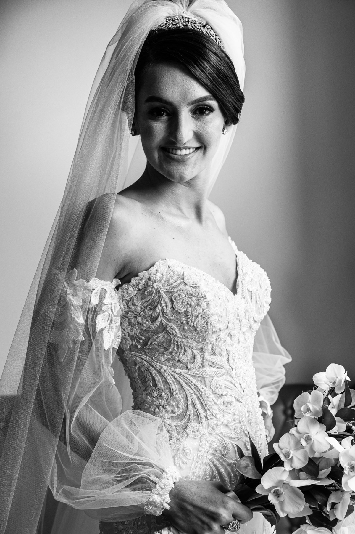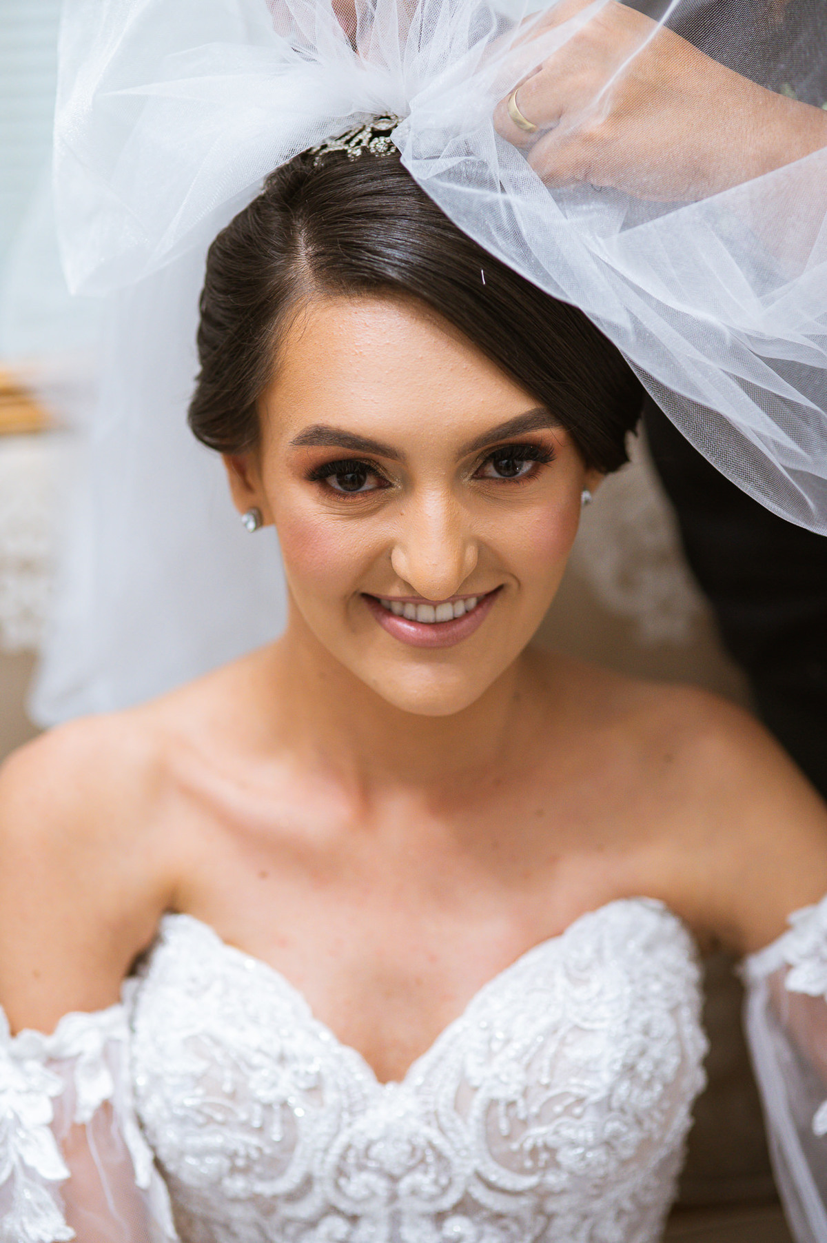 Agora com a produção completa, Camila estava pronta para colocar seu vestido maravilhoso. Em poucos minutos, ela surgiu deslumbrante com toda a produção finalizada e o vestido nos trinques. Passou seu perfume, colocou o véu e estava ali prontinha para casar. Fizemos uma mini sessão de fotos dela enquanto seu motorista chegava e conseguimos várias fotos lindas. Nessa hora o sorriso da noiva estava de canto a canto do rosto, misturando felicidade e anseio pelo seu momento de brilhar. Enfim, sua carruagem chegou e partimos para a cerimônia.