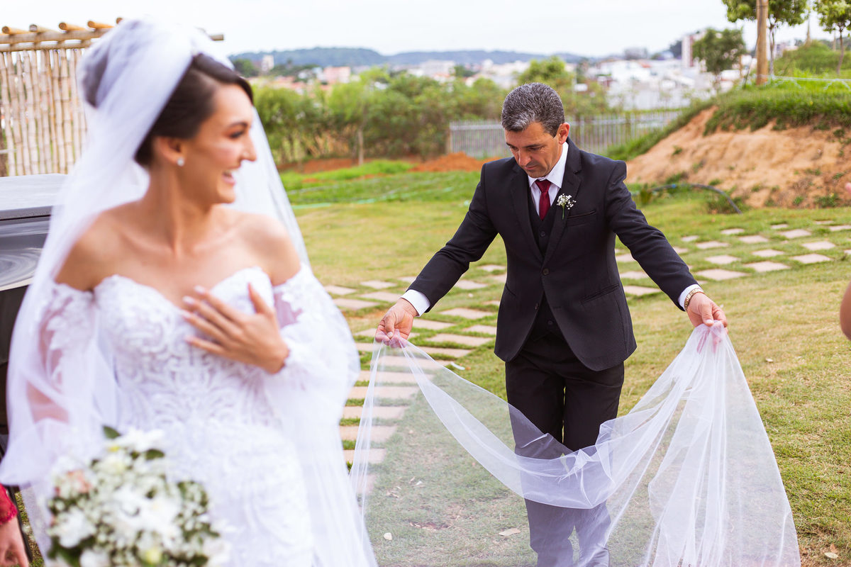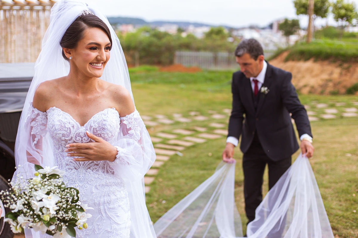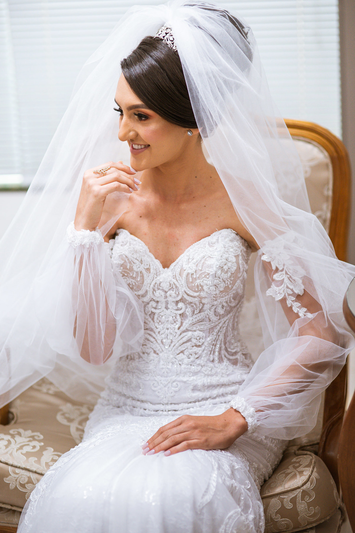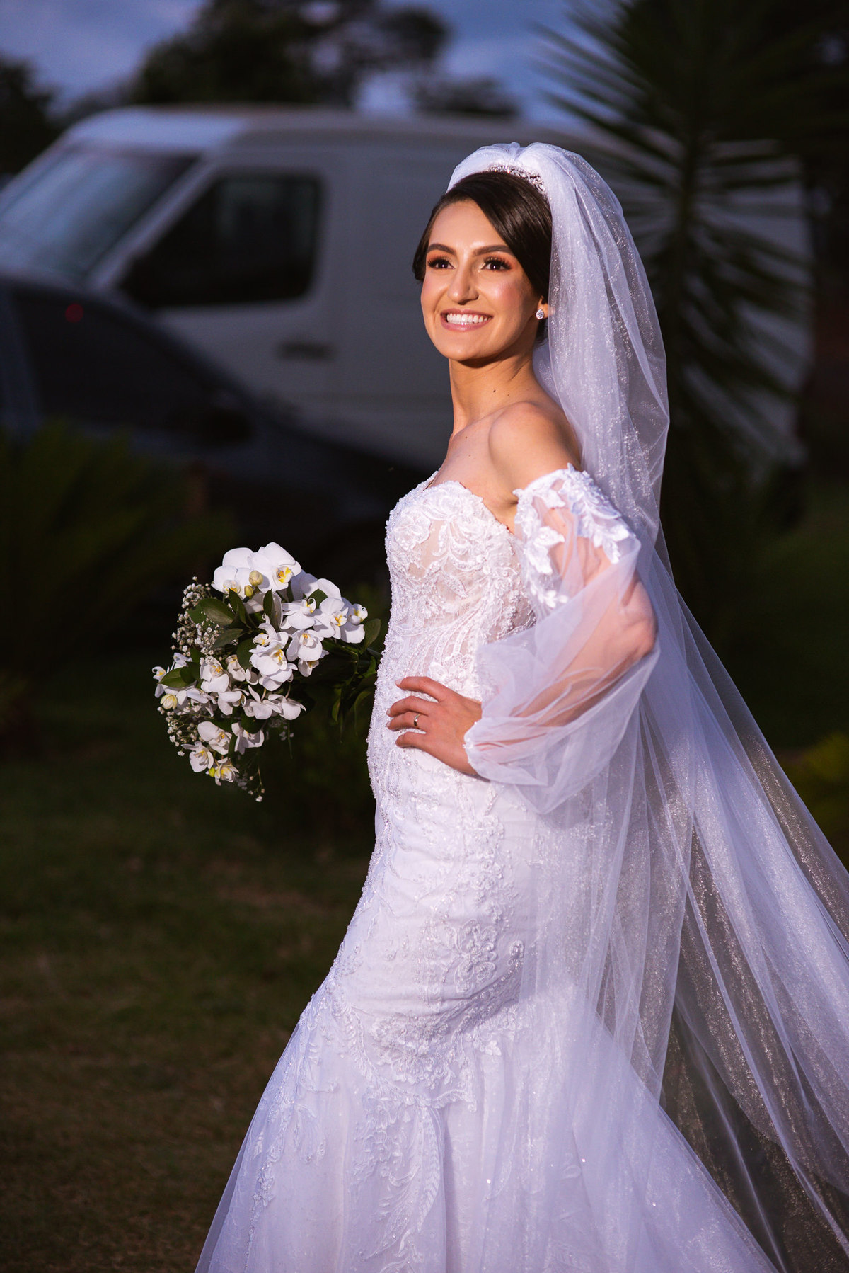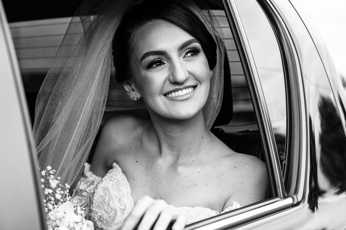 Agora com a produção completa, Camila estava pronta para colocar seu vestido maravilhoso. Em poucos minutos, ela surgiu deslumbrante com toda a produção finalizada e o vestido nos trinques. Passou seu perfume, colocou o véu e estava ali prontinha para casar. Fizemos uma mini sessão de fotos dela enquanto seu motorista chegava e conseguimos várias fotos lindas. Nessa hora o sorriso da noiva estava de canto a canto do rosto, misturando felicidade e anseio pelo seu momento de brilhar. Enfim, sua carruagem chegou e partimos para a cerimônia.