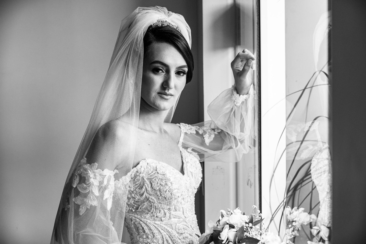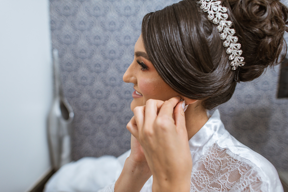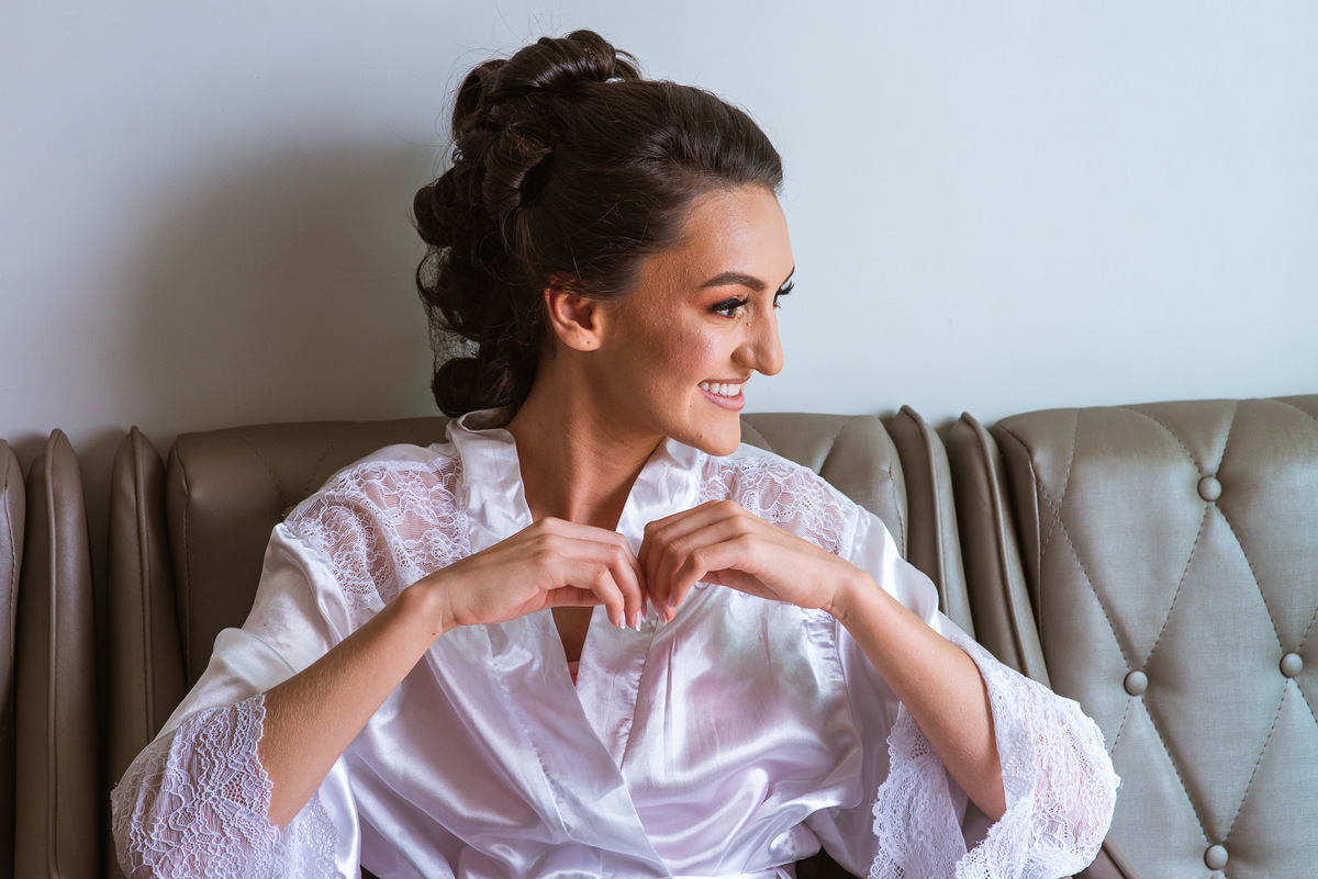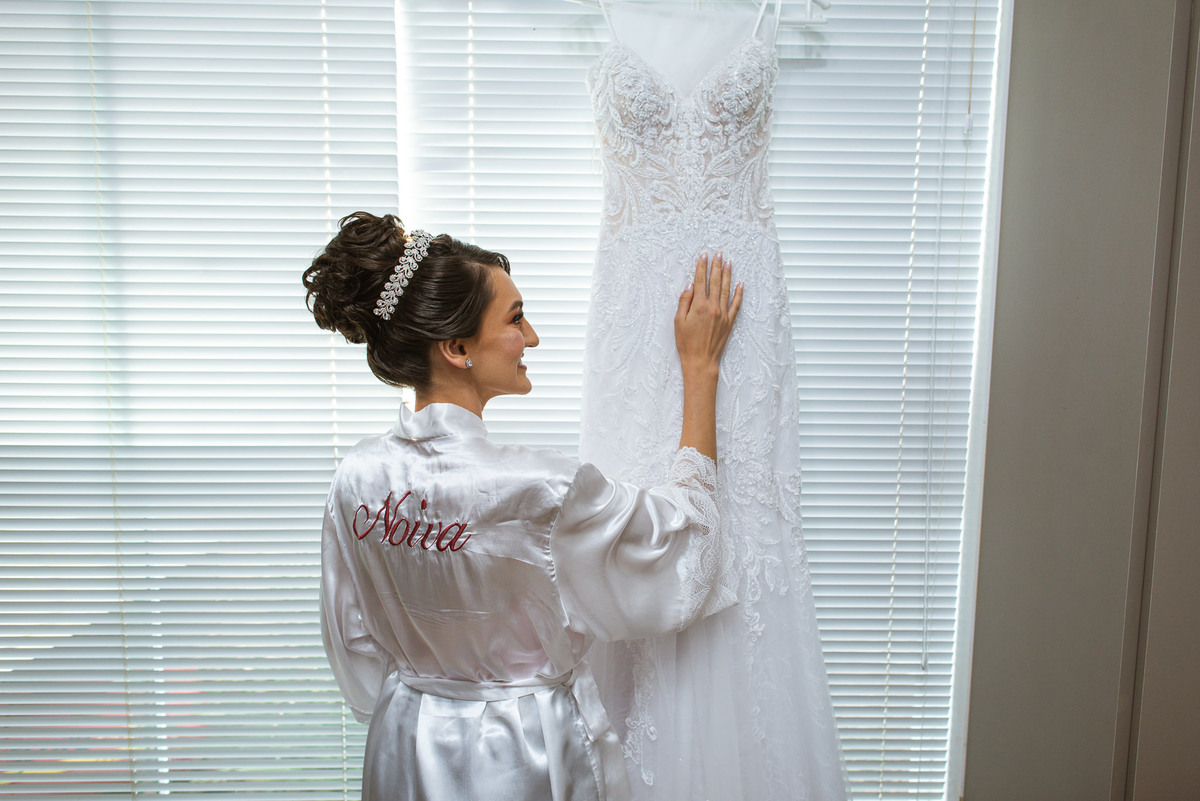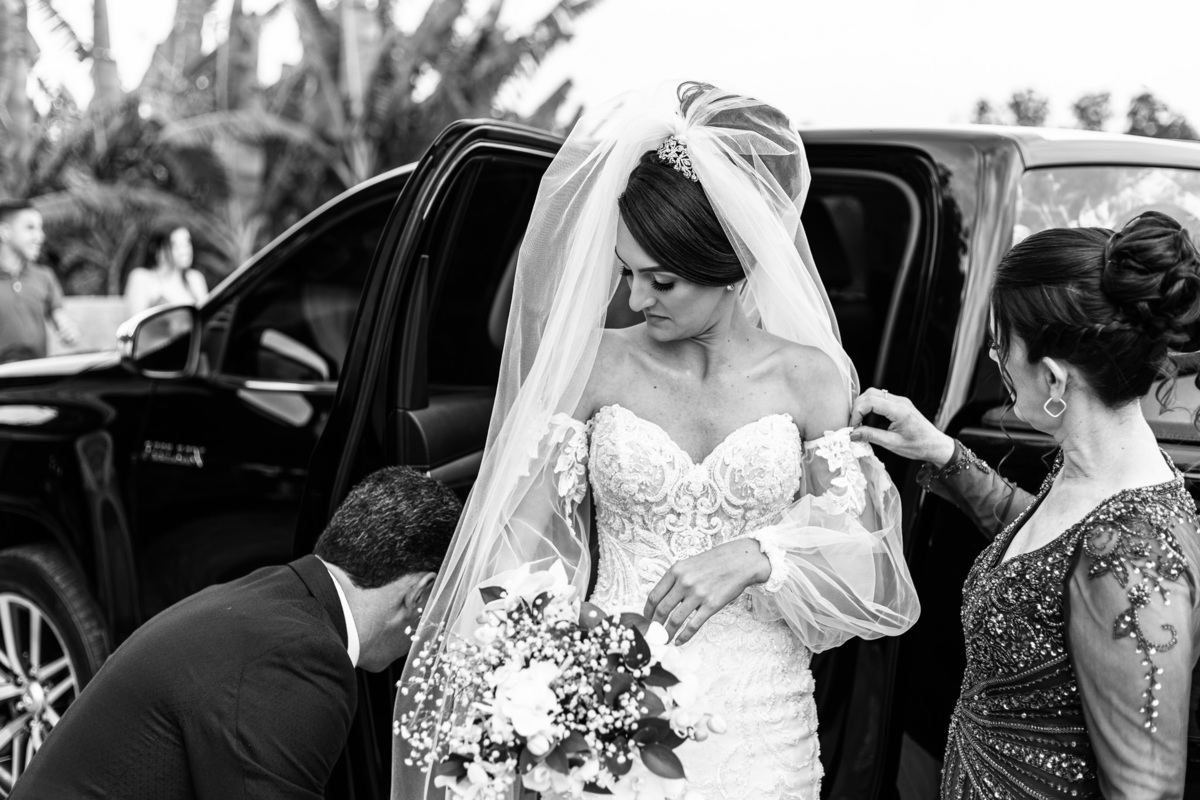Agora com a produção completa, Camila estava pronta para colocar seu vestido maravilhoso. Em poucos minutos, ela surgiu deslumbrante com toda a produção finalizada e o vestido nos trinques. Passou seu perfume, colocou o véu e estava ali prontinha para casar. Fizemos uma mini sessão de fotos dela enquanto seu motorista chegava e conseguimos várias fotos lindas. Nessa hora o sorriso da noiva estava de canto a canto do rosto, misturando felicidade e anseio pelo seu momento de brilhar. Enfim, sua carruagem chegou e partimos para a cerimônia.