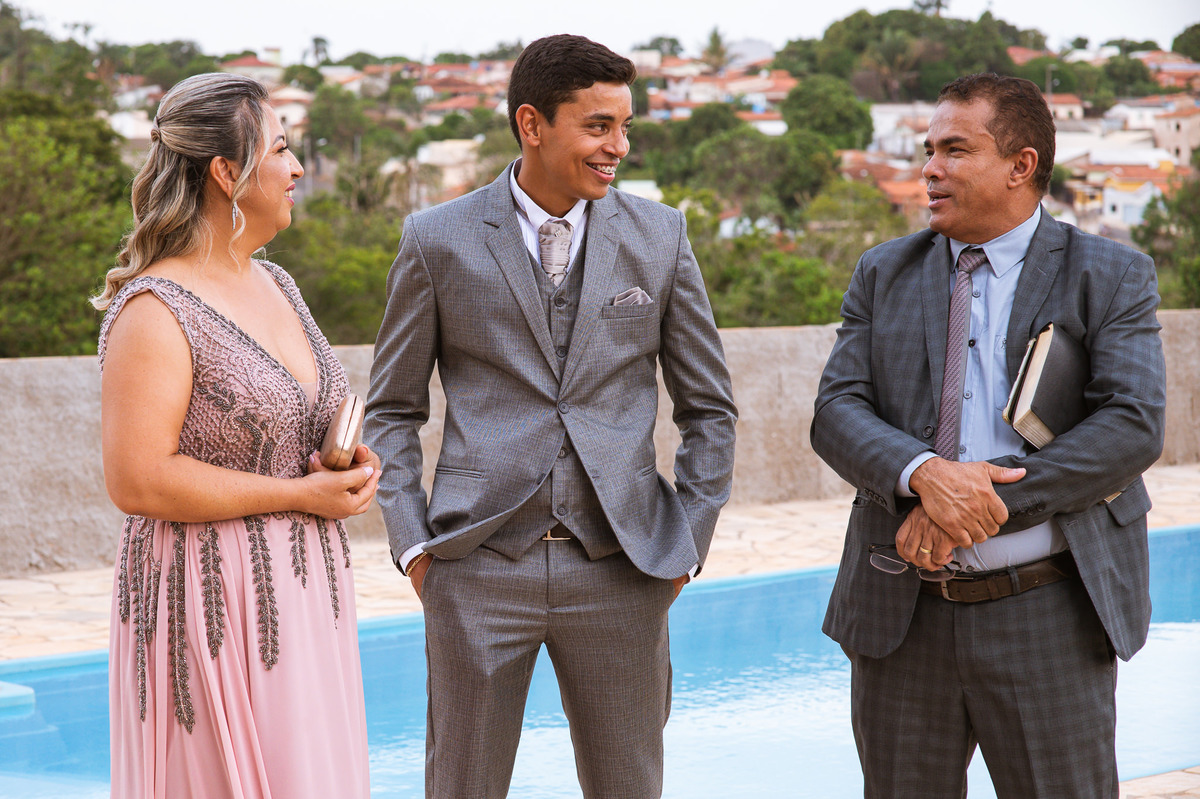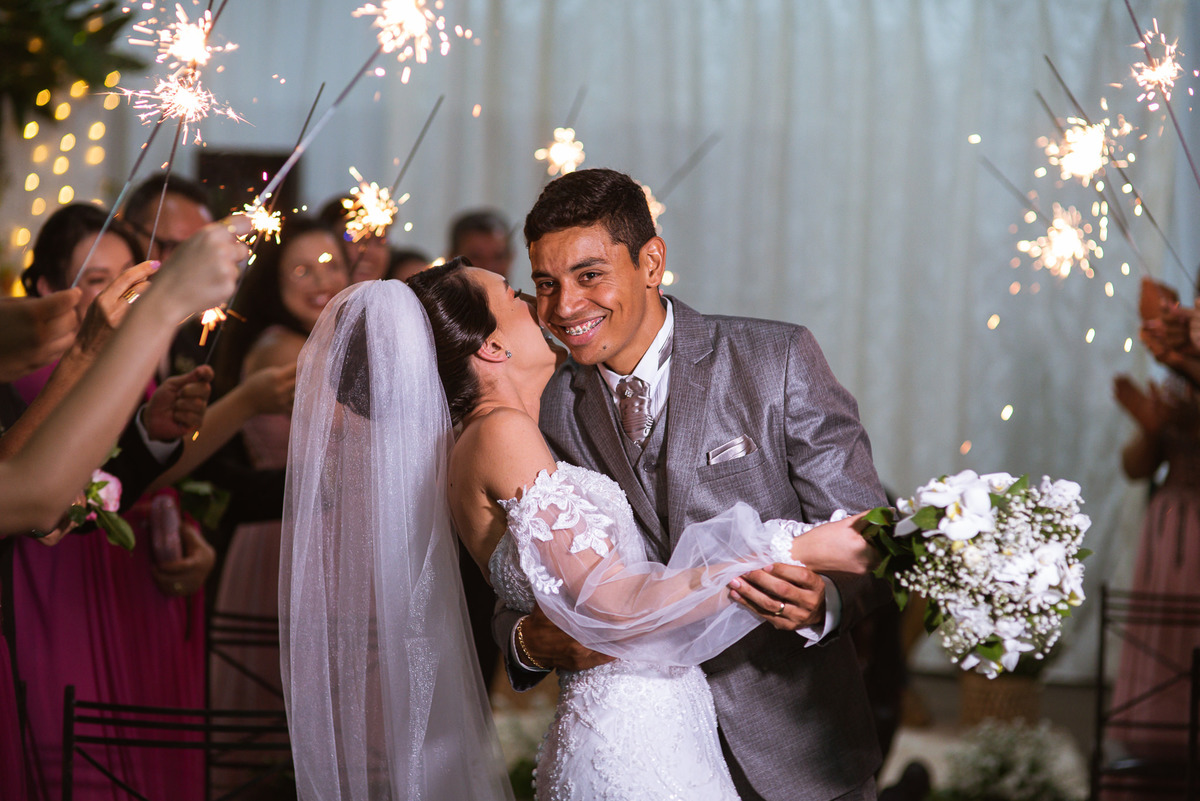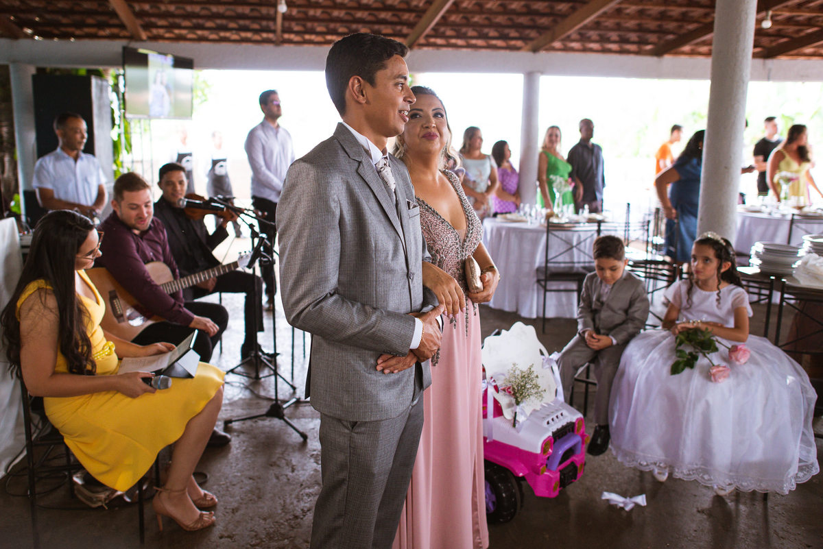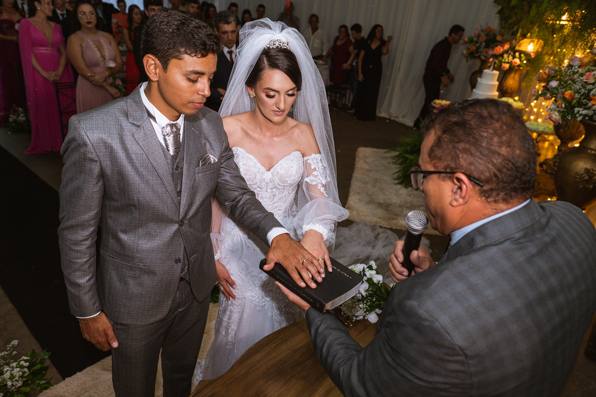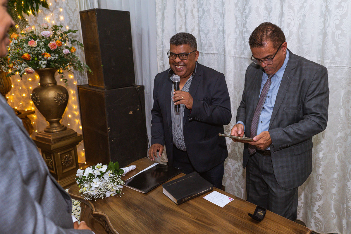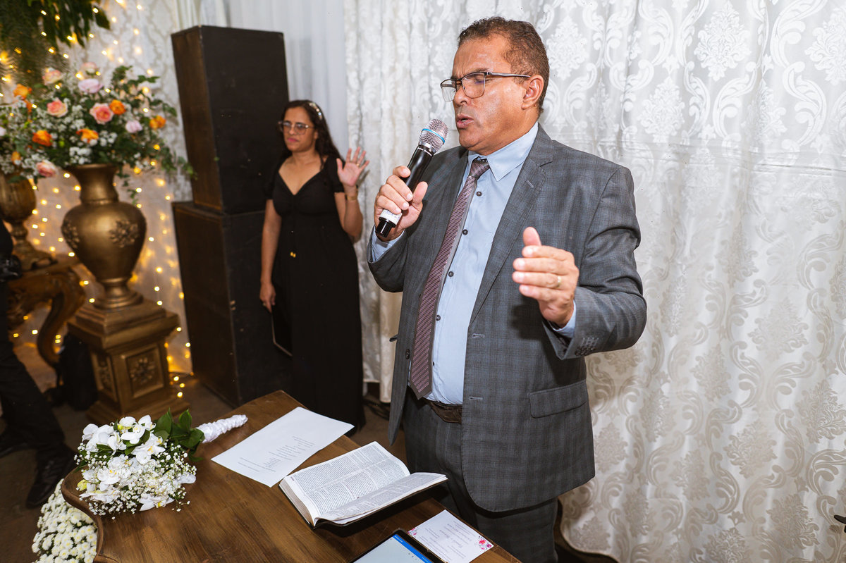 O Pastor os recepcionou e trouxe uma palavra muito edificante para os dois. Em muitos momentos, eles sorriram e se sentiram muito confortáveis com toda a pregação. Após a palavra, era chegada a hora de abençoar os noivos e fazer a troca de alianças e votos. Assim, os dois o fizeram. Perante Deus e as testemunhas, Camila e Weverson se declararam um ao outro e foram declarados casados e abençoados por todos. Finalizamos a celebração com as fotos e partimos para a recepção. Fizemos as fotos tradicionais no bolo e com todos que desejaram ser fotografados com os noivos. Eles curtiram aquele resto de noite e encerramos nossa participação no casamento.