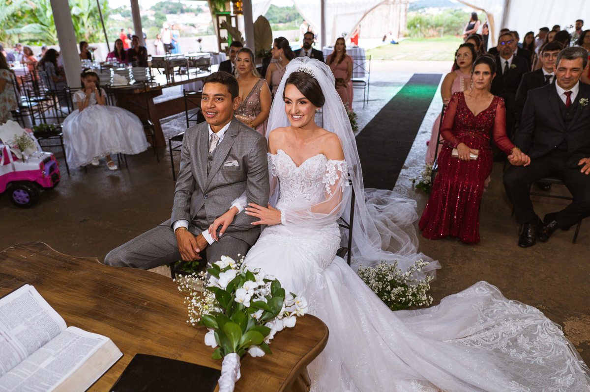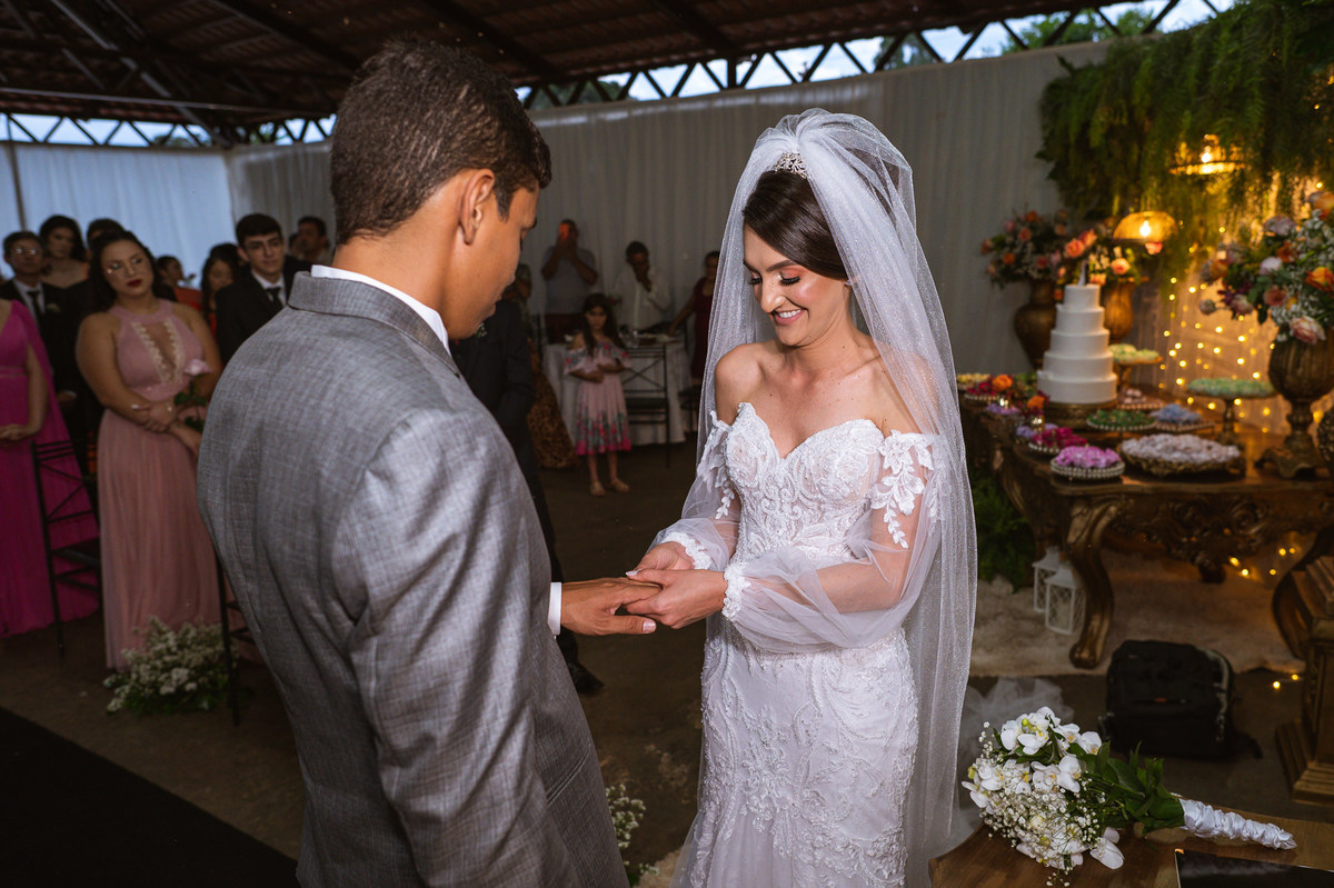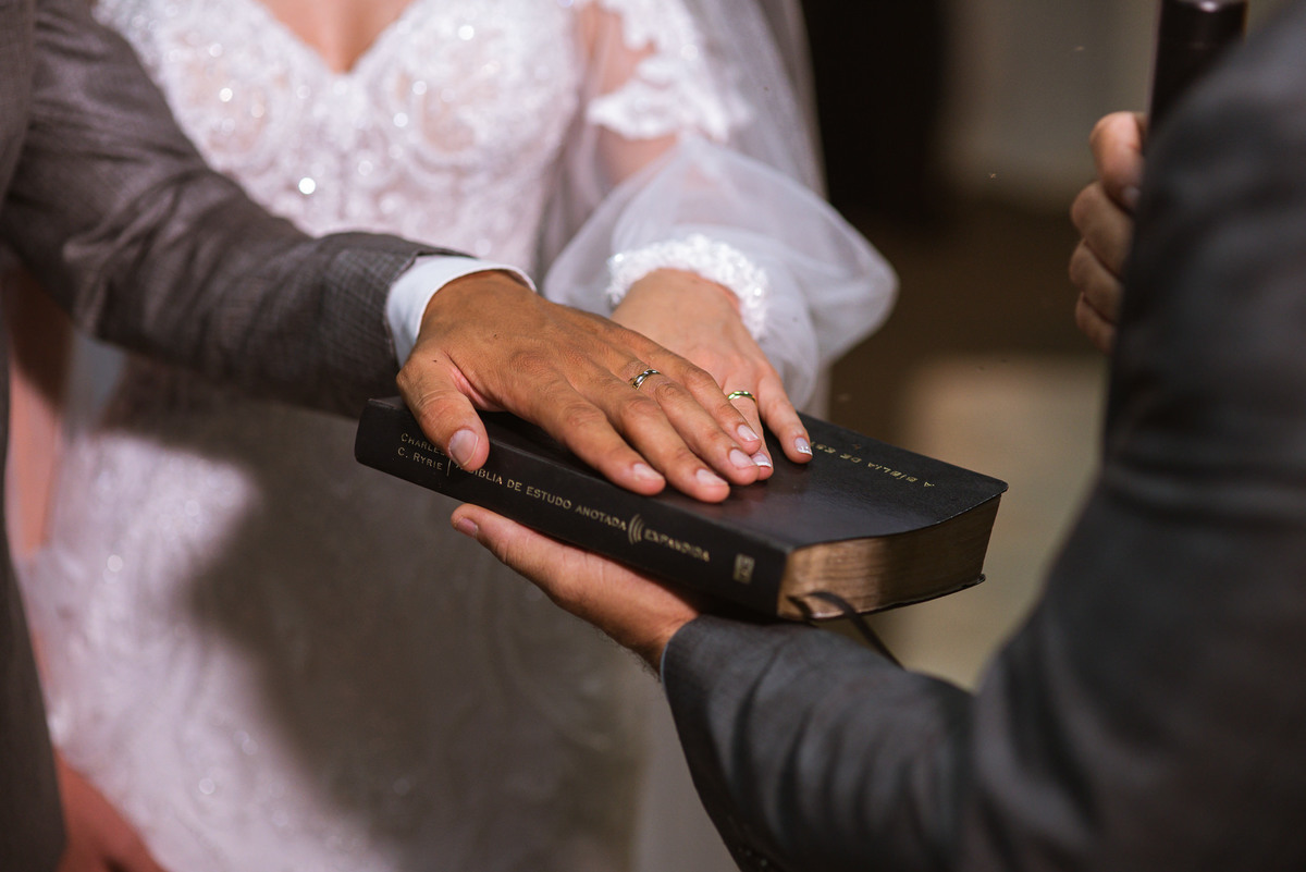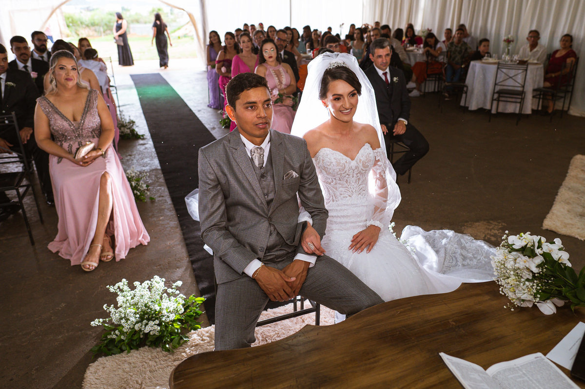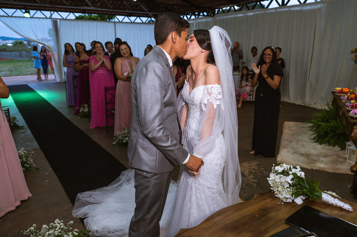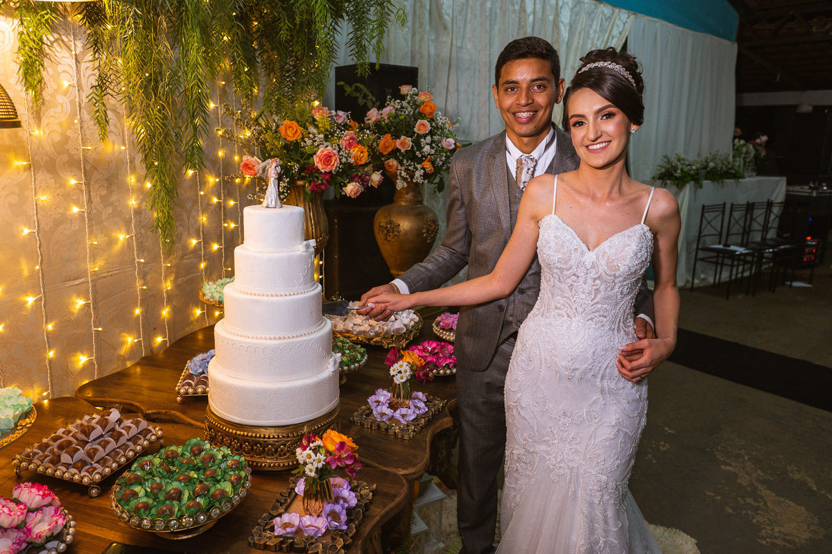 O Pastor os recepcionou e trouxe uma palavra muito edificante para os dois. Em muitos momentos, eles sorriram e se sentiram muito confortáveis com toda a pregação. Após a palavra, era chegada a hora de abençoar os noivos e fazer a troca de alianças e votos. Assim, os dois o fizeram. Perante Deus e as testemunhas, Camila e Weverson se declararam um ao outro e foram declarados casados e abençoados por todos. Finalizamos a celebração com as fotos e partimos para a recepção. Fizemos as fotos tradicionais no bolo e com todos que desejaram ser fotografados com os noivos. Eles curtiram aquele resto de noite e encerramos nossa participação no casamento.