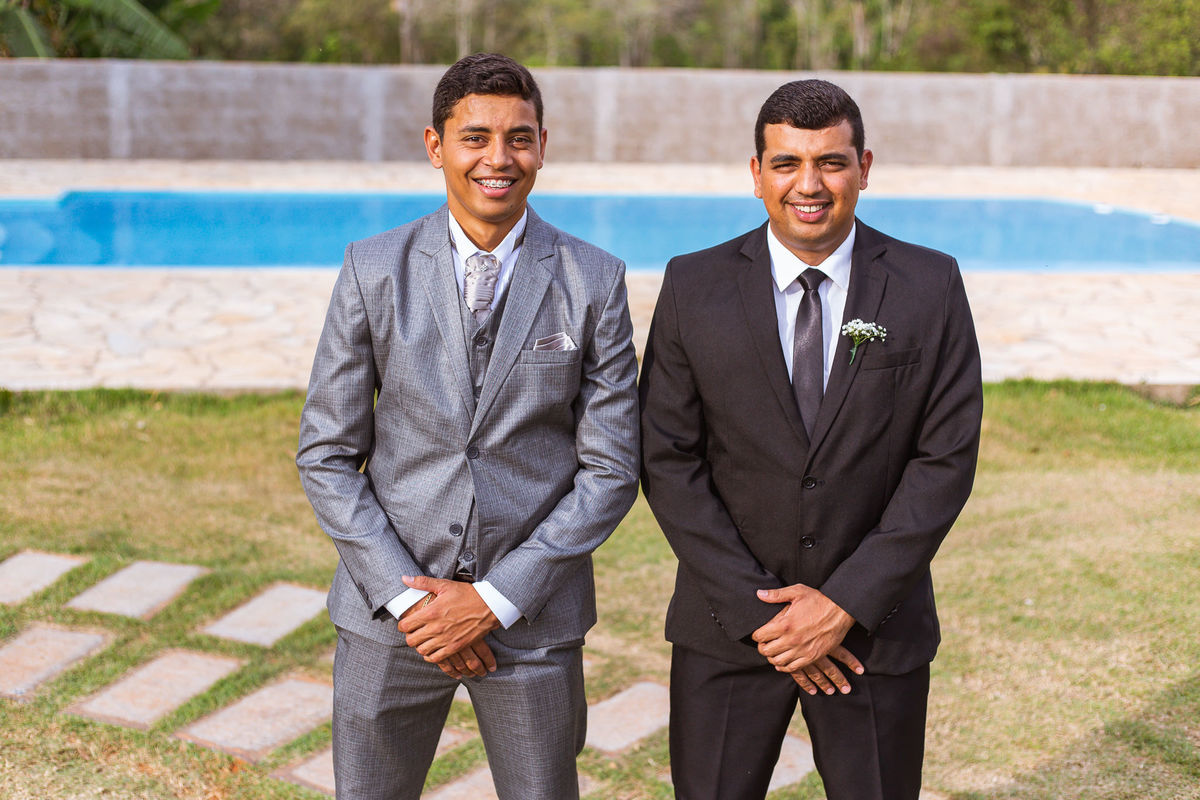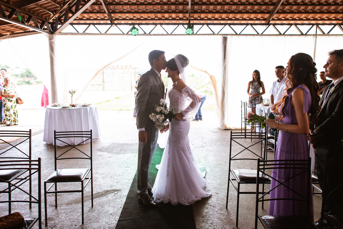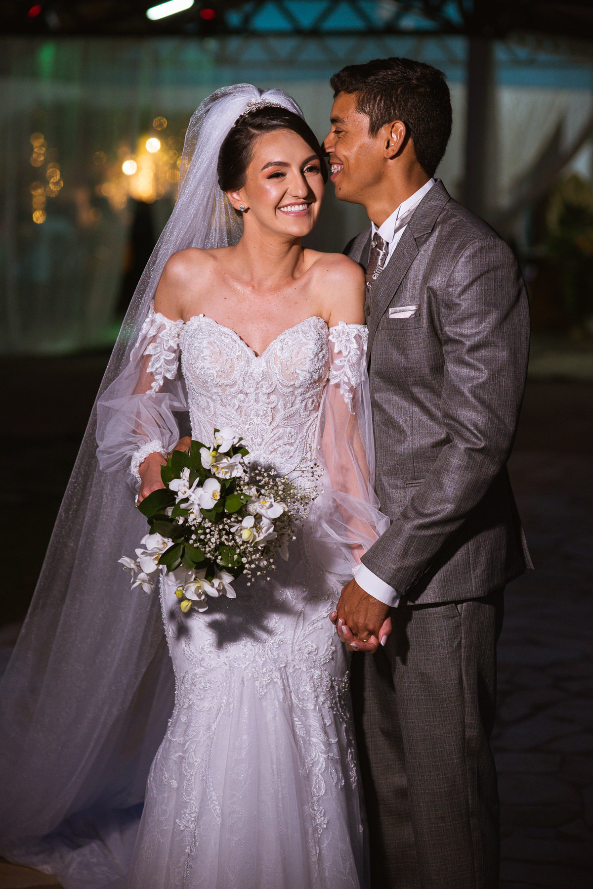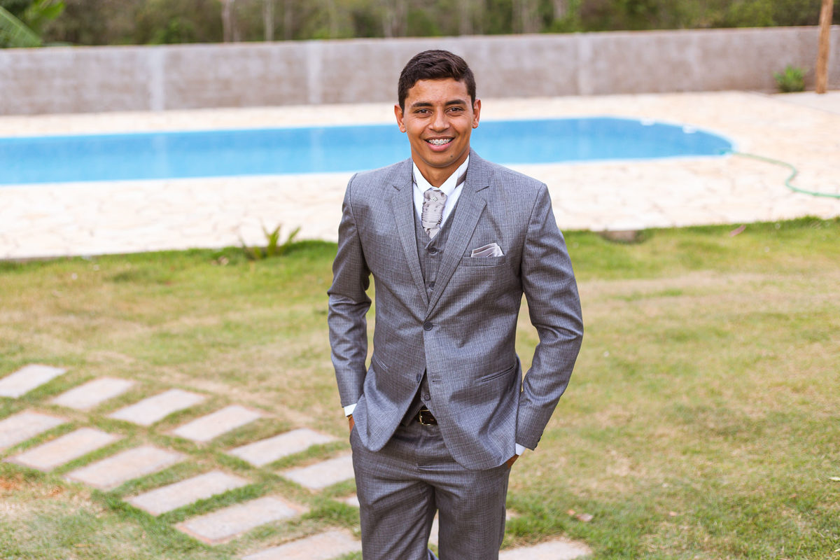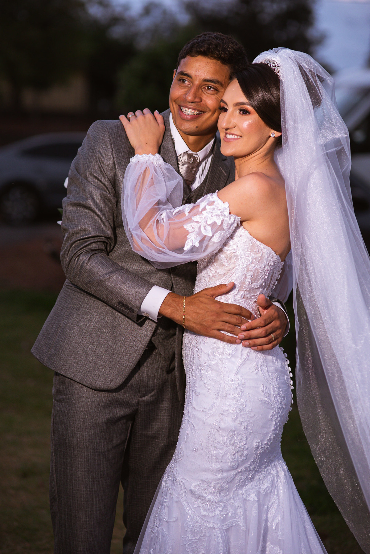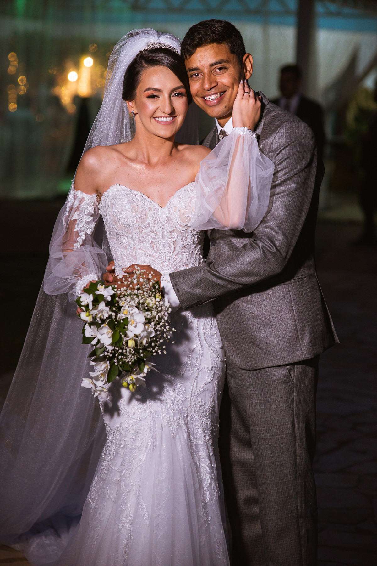O vestido escolhido por ela veio assinado pela Hermanas Noivas e Festas. Um belíssimo modelo que a noiva escolheu com todo carinho. Ela mal conseguia aguardar para que chegasse o momento de vesti-lo. Os noivos optaram em realizar a cerimônia e recepção na chácara Espaço Real. Na chácara, Weverson já estava ansiosamente aguardando a chegada da sua noiva e início da celebração. Enquanto os convidados chegavam, o noivo cumprimentava e distribuía o sorriso meio contido que estampava o seu rosto naquele momento todo especial.