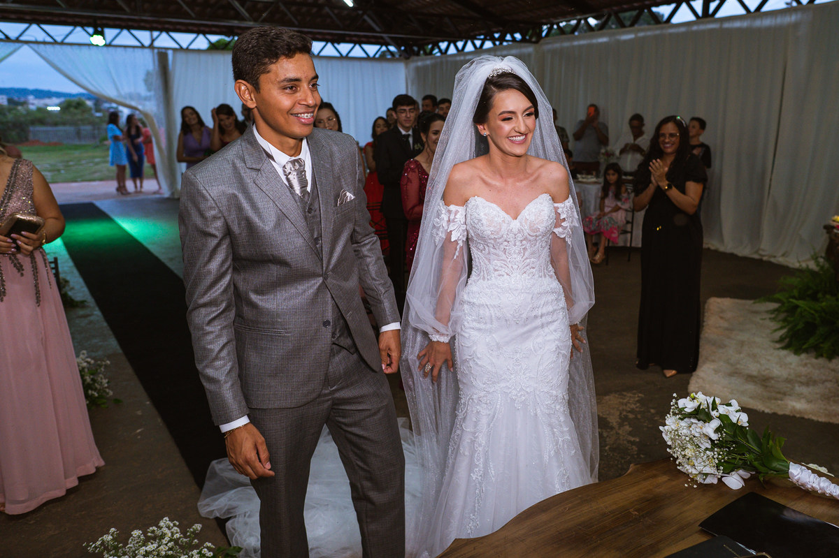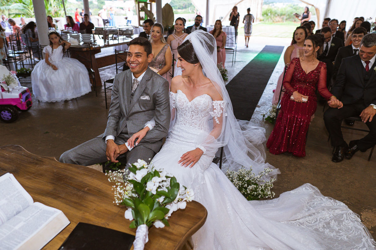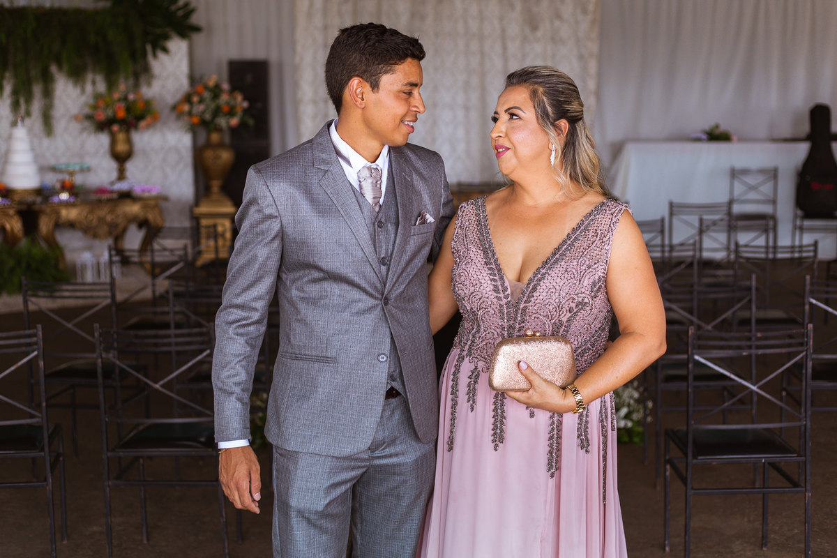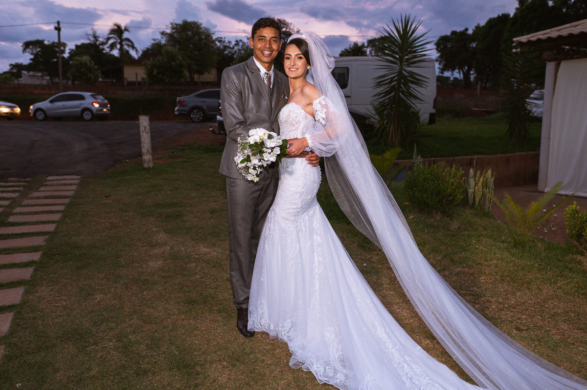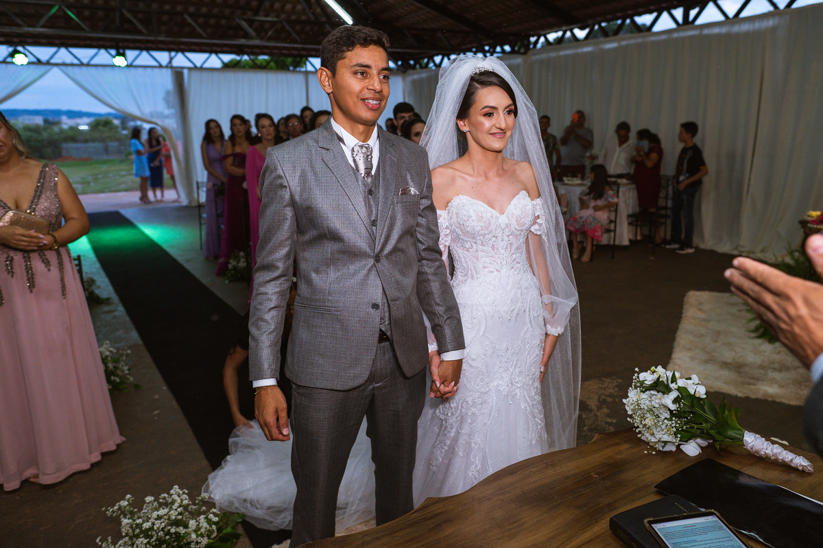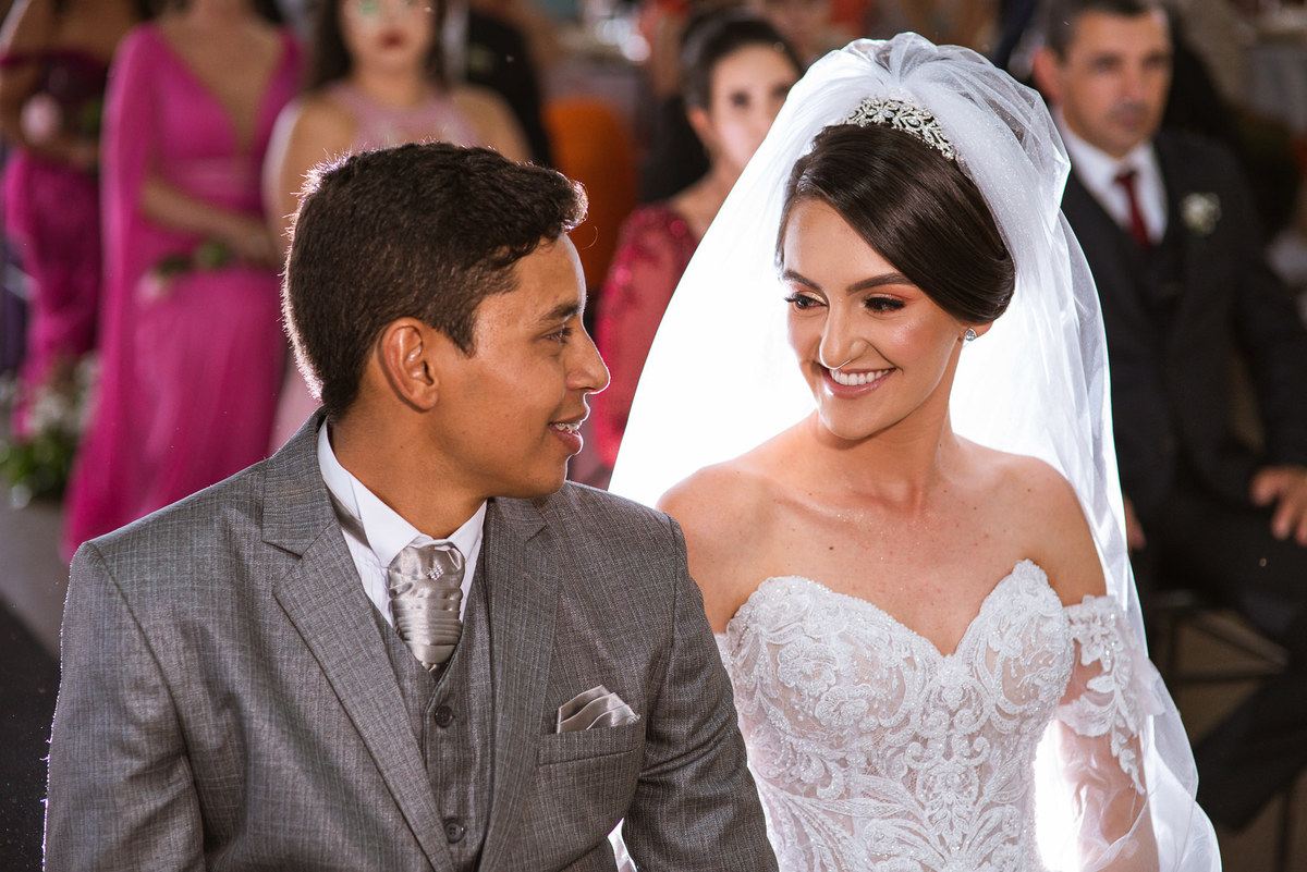 O vestido escolhido por ela veio assinado pela Hermanas Noivas e Festas. Um belíssimo modelo que a noiva escolheu com todo carinho. Ela mal conseguia aguardar para que chegasse o momento de vesti-lo. Os noivos optaram em realizar a cerimônia e recepção na chácara Espaço Real. Na chácara, Weverson já estava ansiosamente aguardando a chegada da sua noiva e início da celebração. Enquanto os convidados chegavam, o noivo cumprimentava e distribuía o sorriso meio contido que estampava o seu rosto naquele momento todo especial.