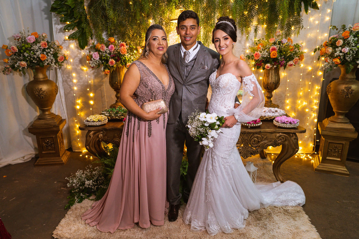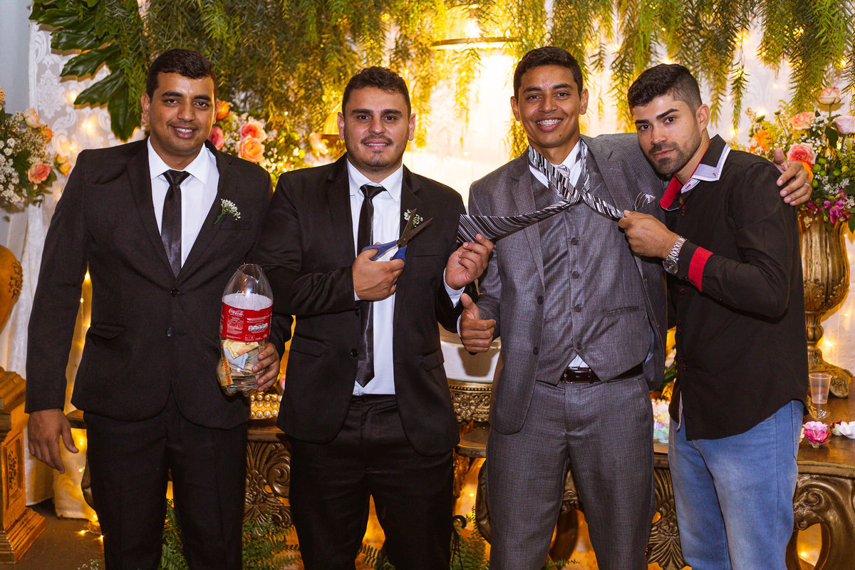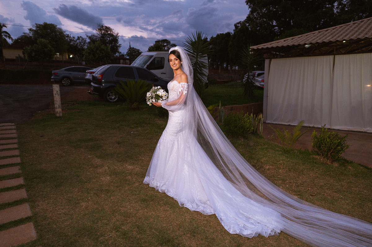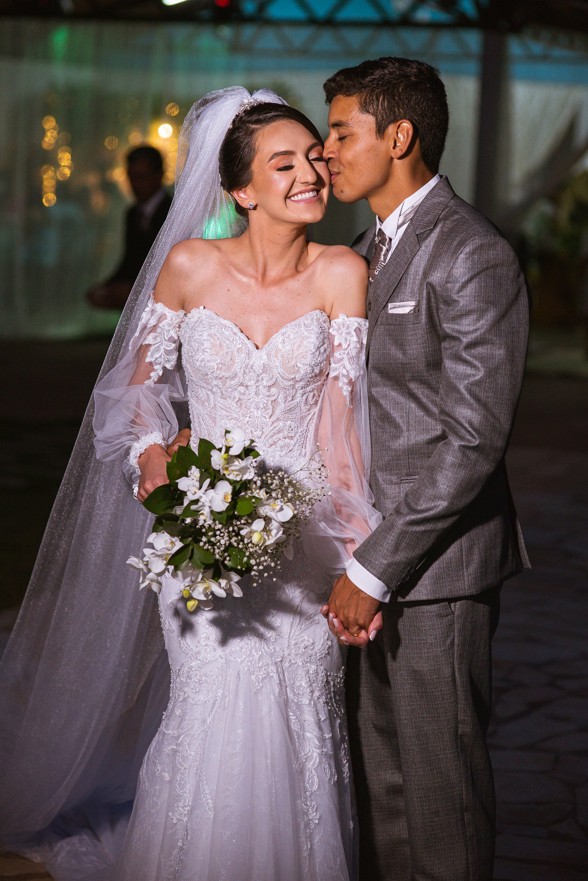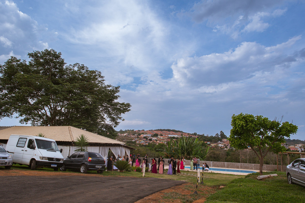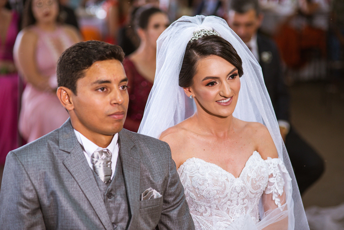 O vestido escolhido por ela veio assinado pela Hermanas Noivas e Festas. Um belíssimo modelo que a noiva escolheu com todo carinho. Ela mal conseguia aguardar para que chegasse o momento de vesti-lo. Os noivos optaram em realizar a cerimônia e recepção na chácara Espaço Real. Na chácara, Weverson já estava ansiosamente aguardando a chegada da sua noiva e início da celebração. Enquanto os convidados chegavam, o noivo cumprimentava e distribuía o sorriso meio contido que estampava o seu rosto naquele momento todo especial.