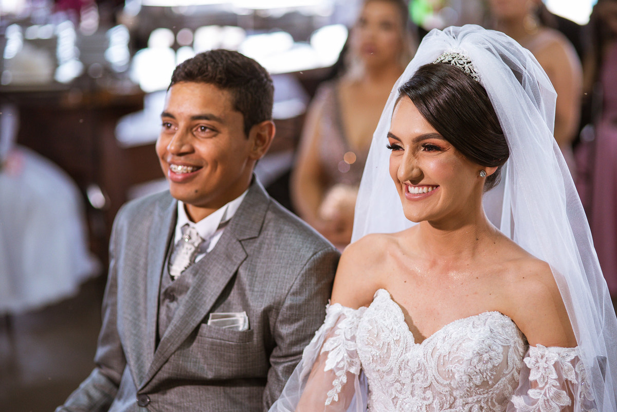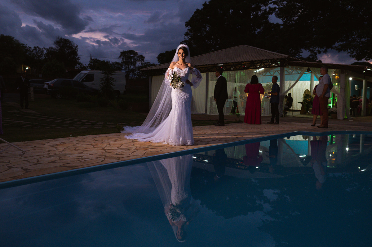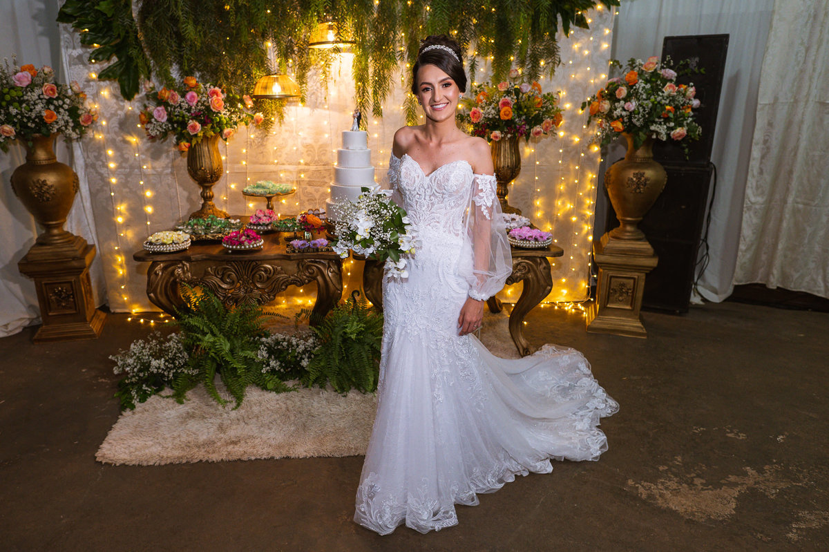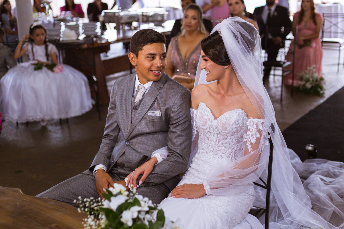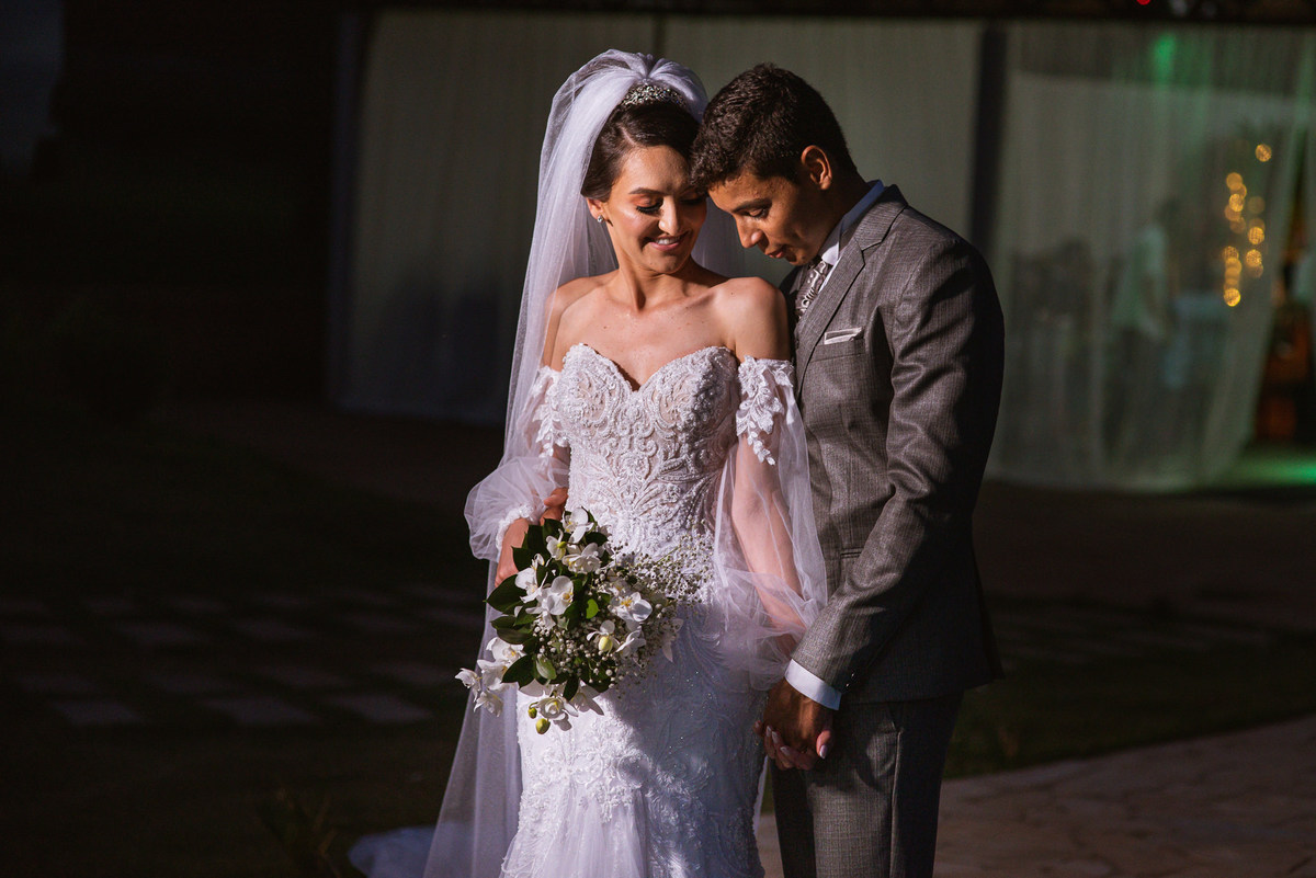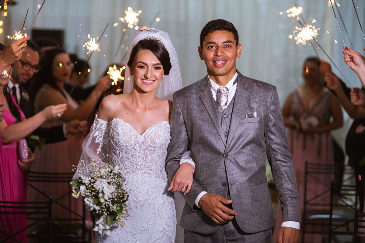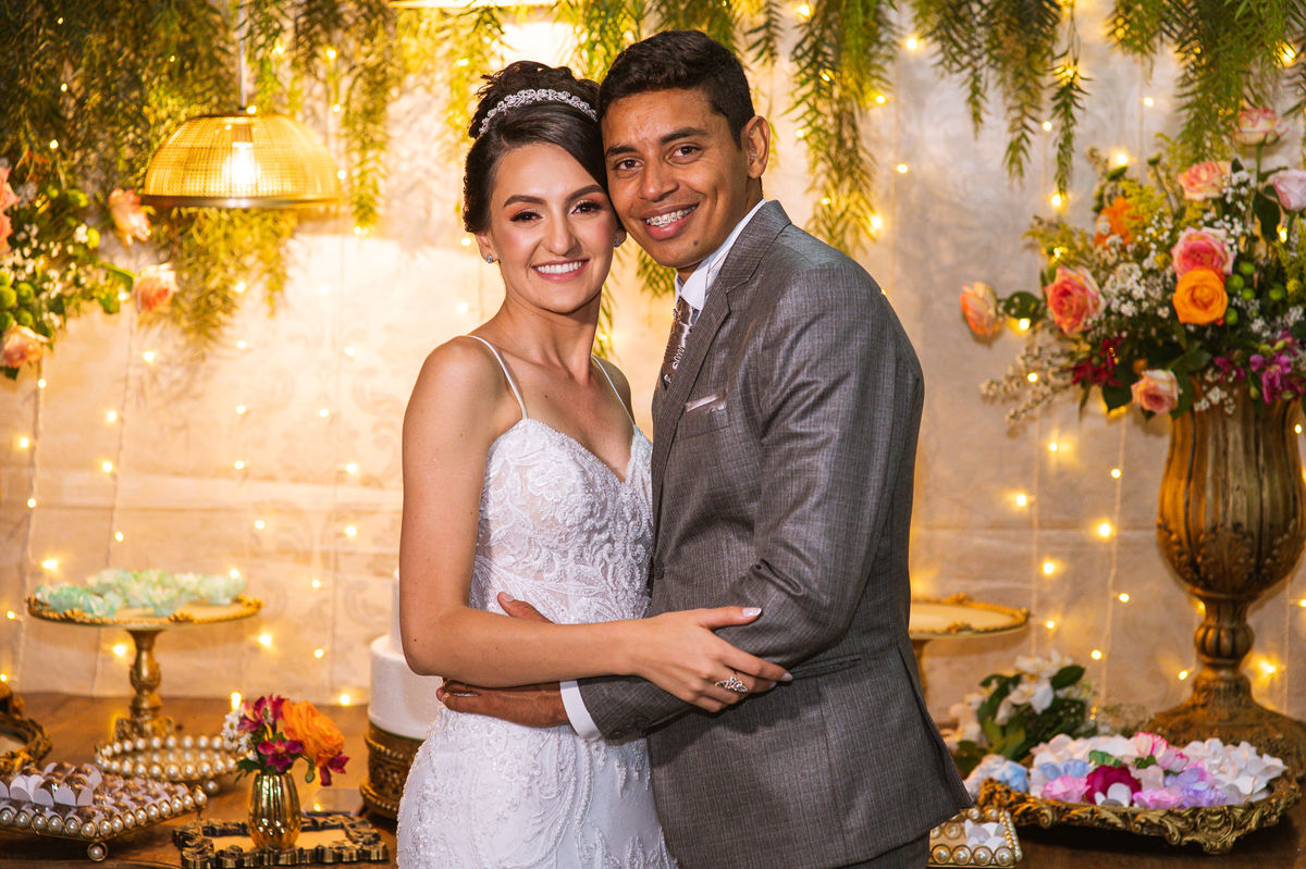 O vestido escolhido por ela veio assinado pela Hermanas Noivas e Festas. Um belíssimo modelo que a noiva escolheu com todo carinho. Ela mal conseguia aguardar para que chegasse o momento de vesti-lo. Os noivos optaram em realizar a cerimônia e recepção na chácara Espaço Real. Na chácara, Weverson já estava ansiosamente aguardando a chegada da sua noiva e início da celebração. Enquanto os convidados chegavam, o noivo cumprimentava e distribuía o sorriso meio contido que estampava o seu rosto naquele momento todo especial.