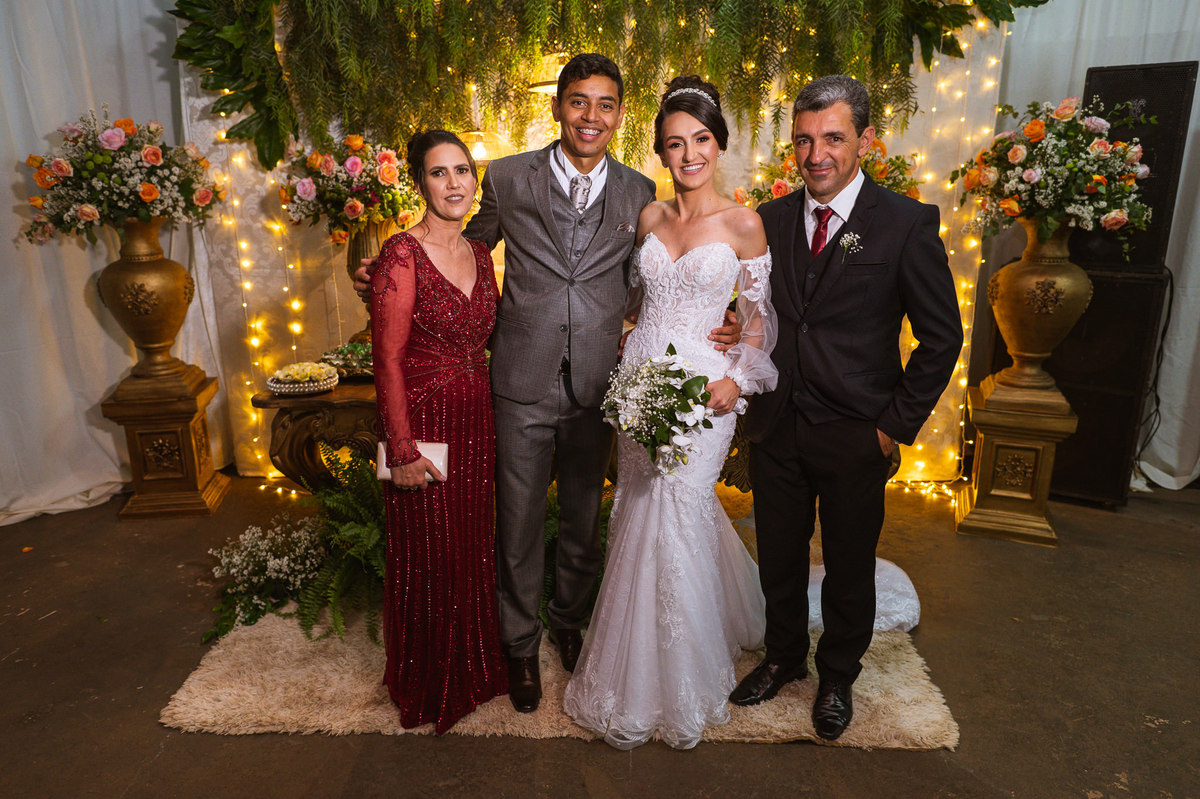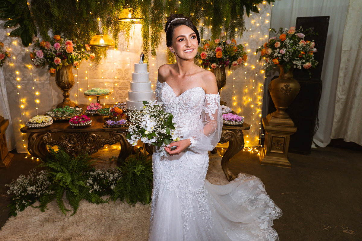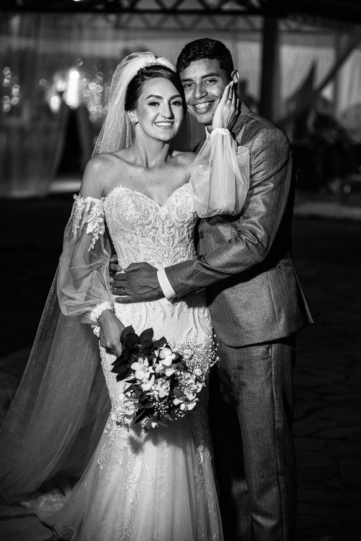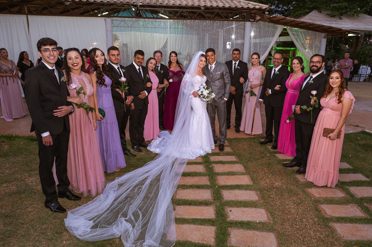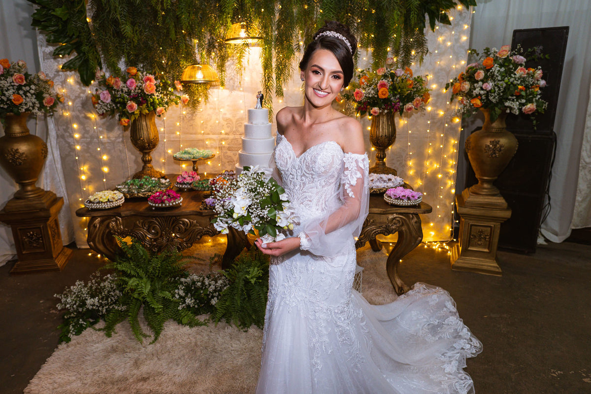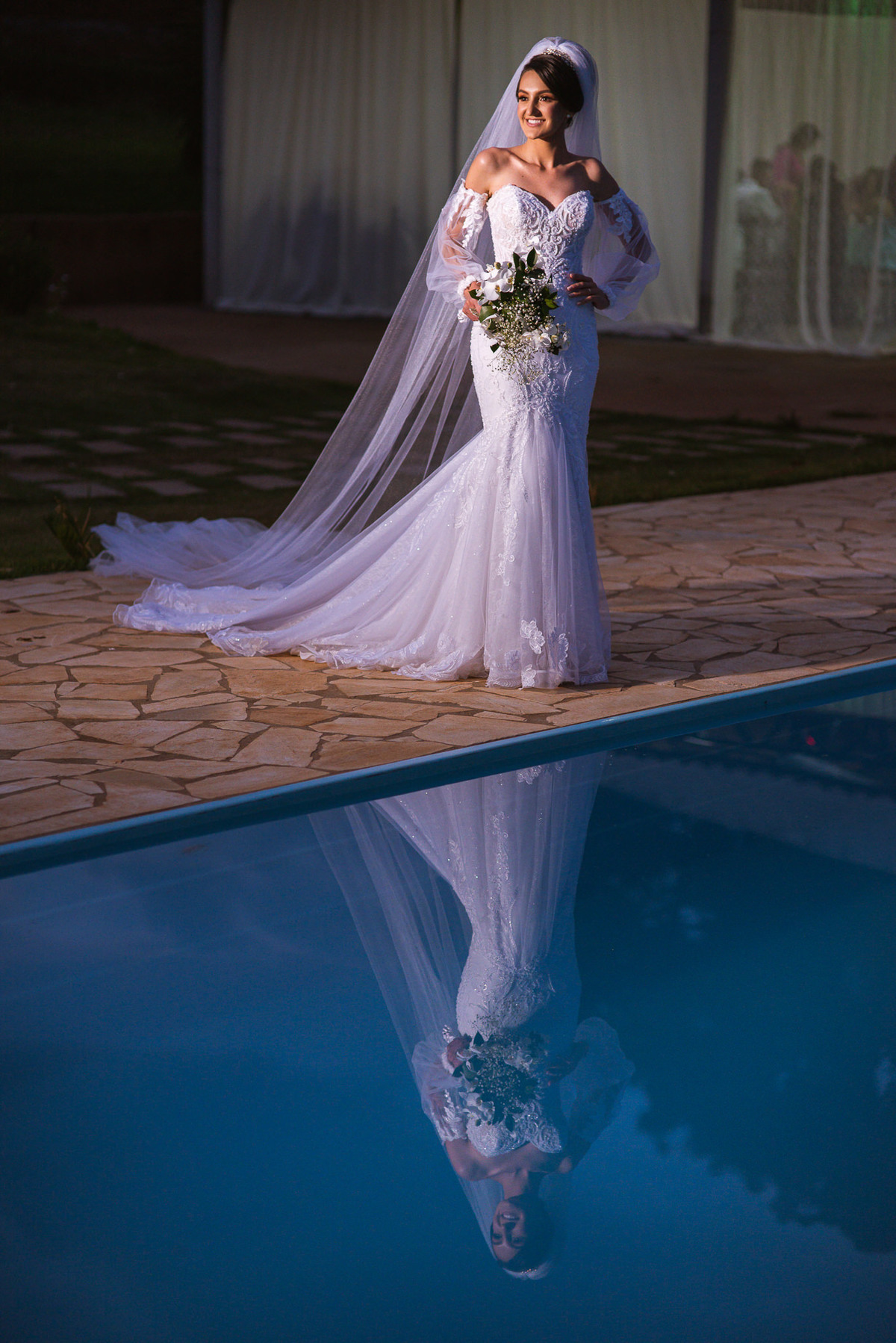 O vestido escolhido por ela veio assinado pela Hermanas Noivas e Festas. Um belíssimo modelo que a noiva escolheu com todo carinho. Ela mal conseguia aguardar para que chegasse o momento de vesti-lo. Os noivos optaram em realizar a cerimônia e recepção na chácara Espaço Real. Na chácara, Weverson já estava ansiosamente aguardando a chegada da sua noiva e início da celebração. Enquanto os convidados chegavam, o noivo cumprimentava e distribuía o sorriso meio contido que estampava o seu rosto naquele momento todo especial.