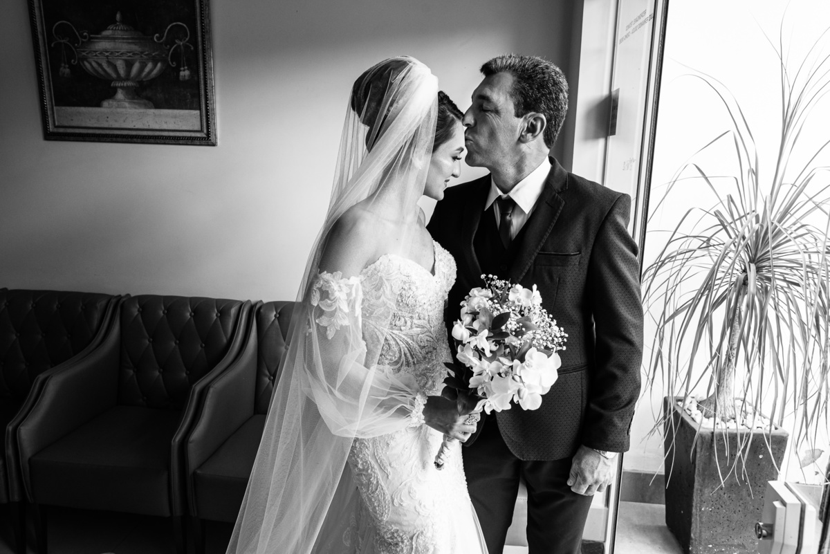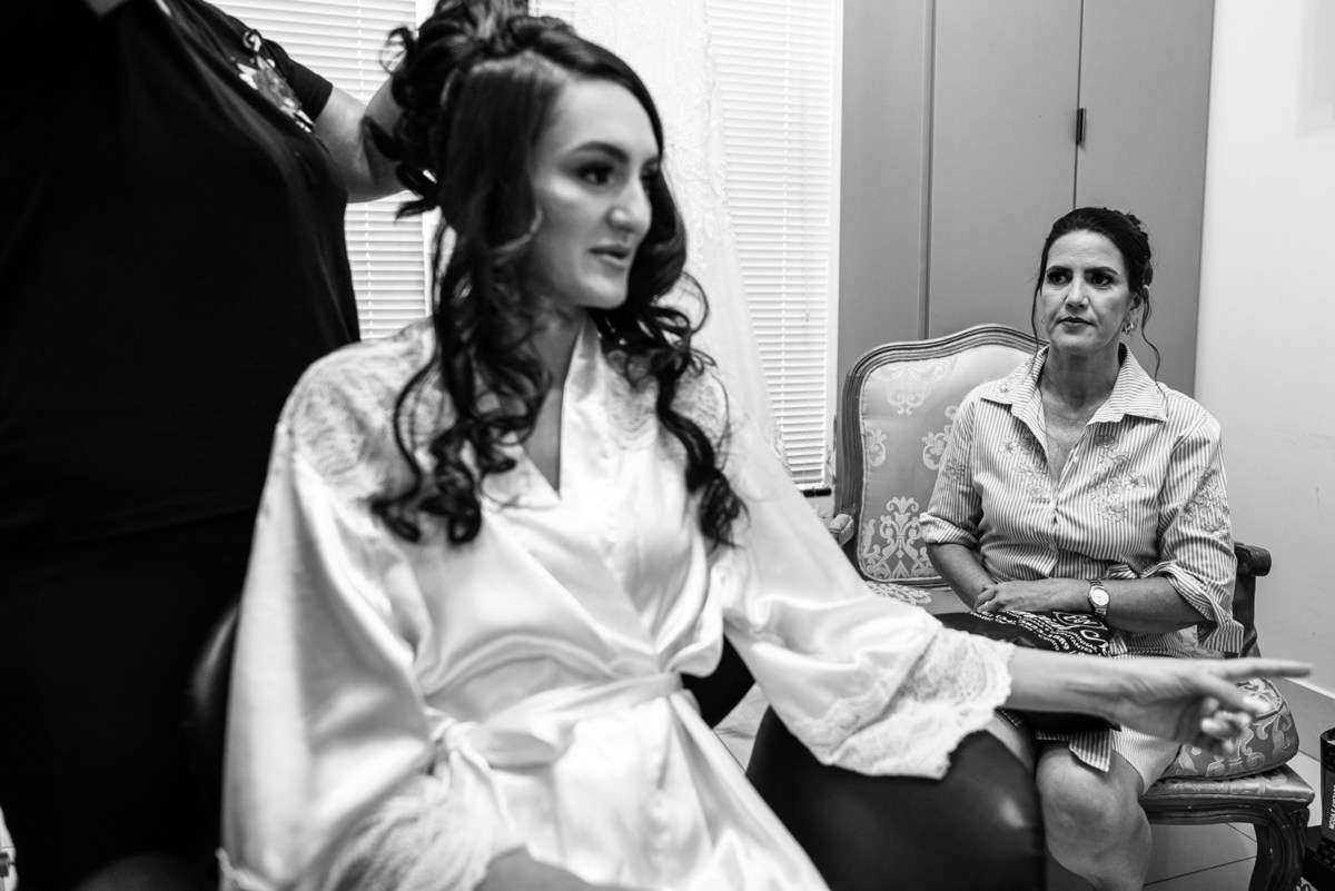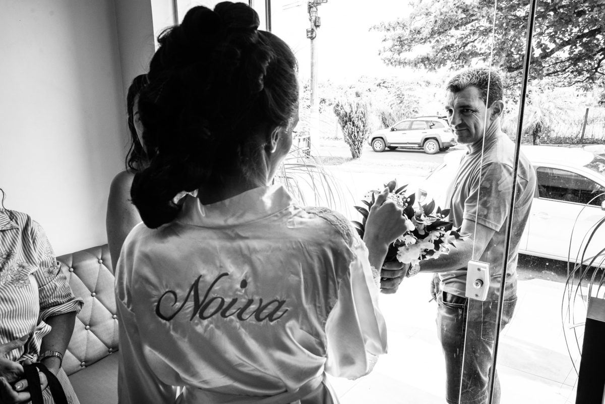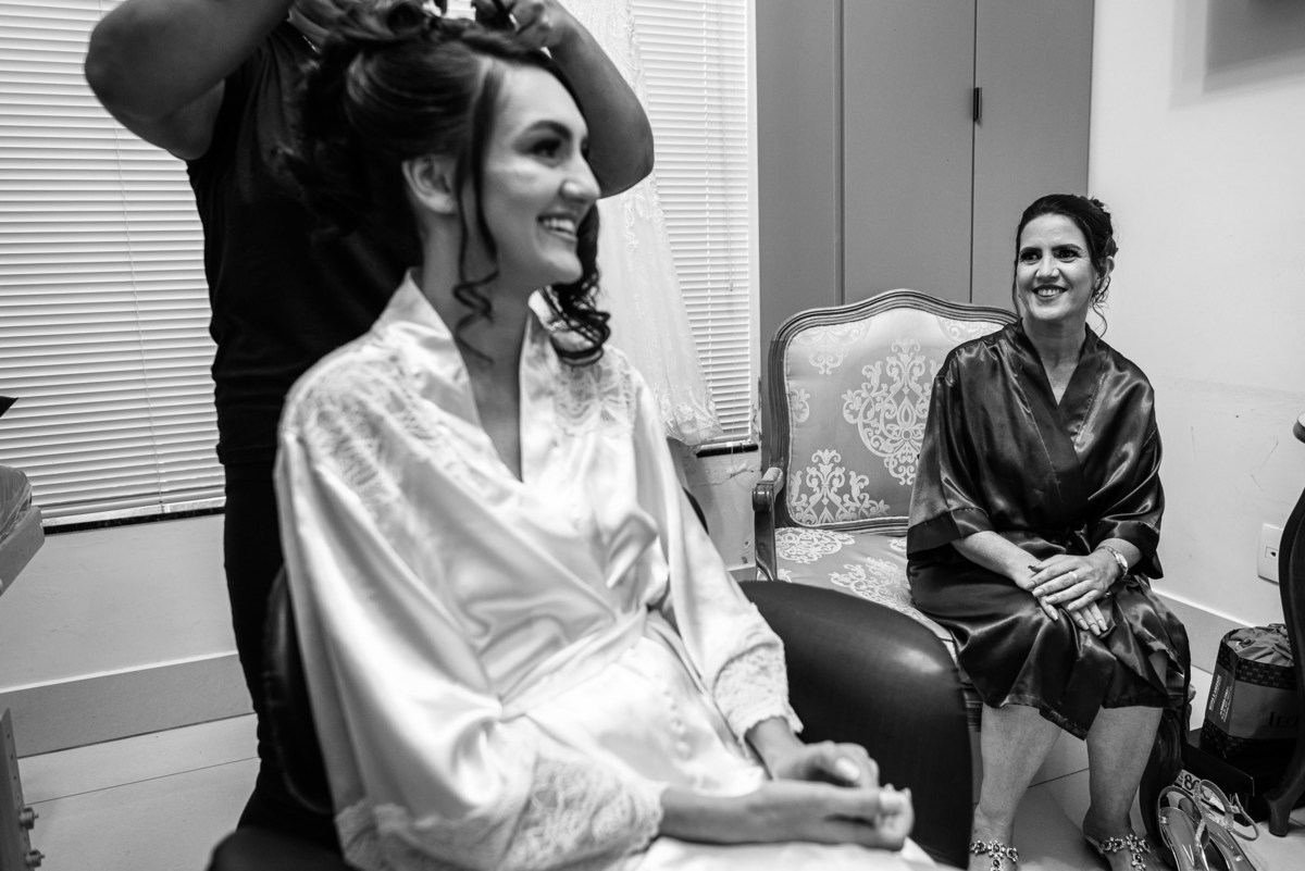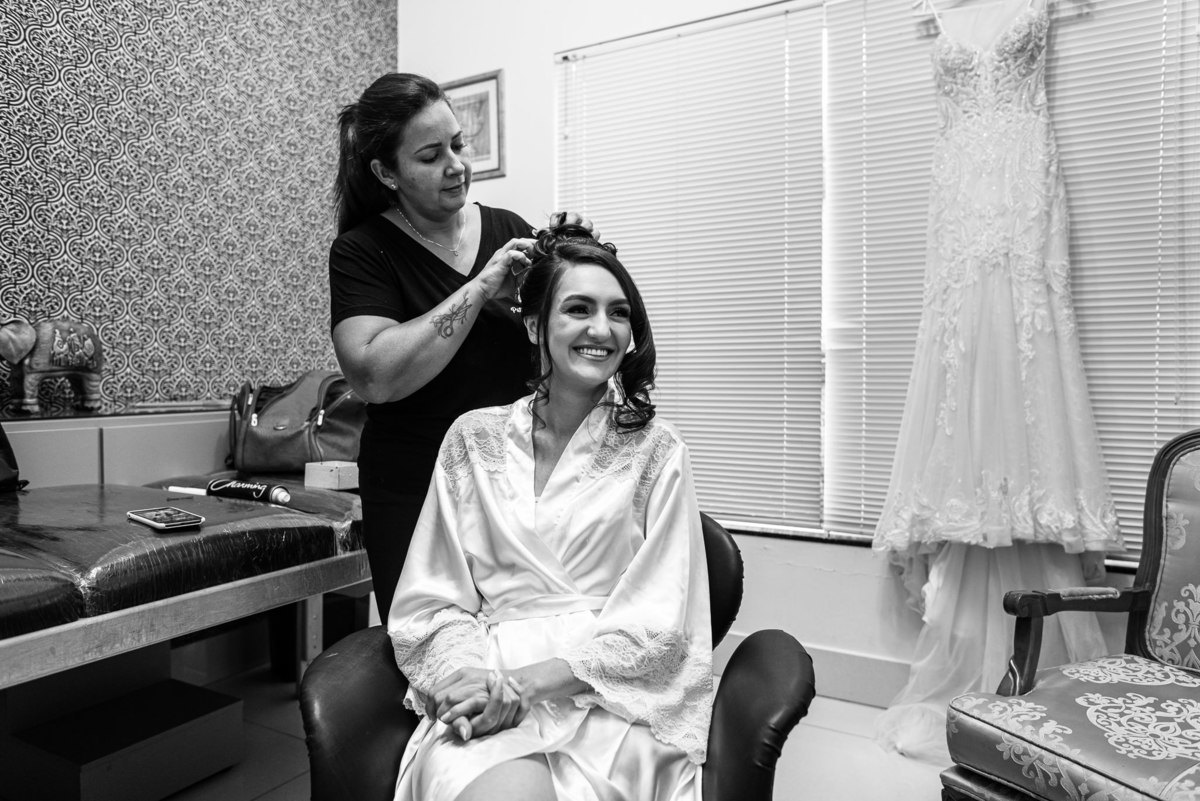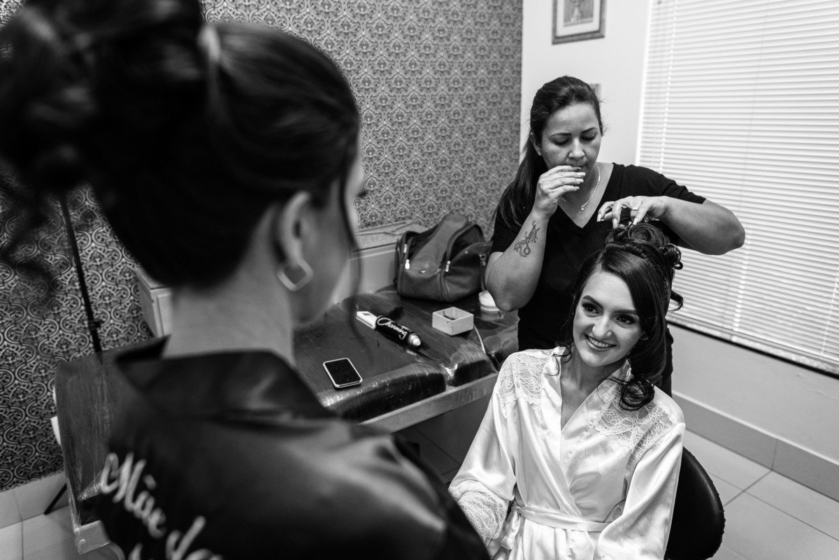 Ao chegar no local, Camila estava aguardando super tranquila o momento em que seu penteado seria produzido. Junto de sua mãe e sua tia, elas estavam bem descontraídas e se divertindo com toda a emoção daquele momento. O pai da noiva também compareceu trazendo o majestoso buquê de flores que a noiva levaria ao altar. Aproveitamos para registrar esse momento e demonstrar todo o carinho que eles tem um pelo outro. Enquanto a produção acontecia, Camila me contava sobre o quanto ela estava ansiosa no dia anterior, e naquele momento ali estava super tranquila, até estranhou toda aquela tranquilidade.