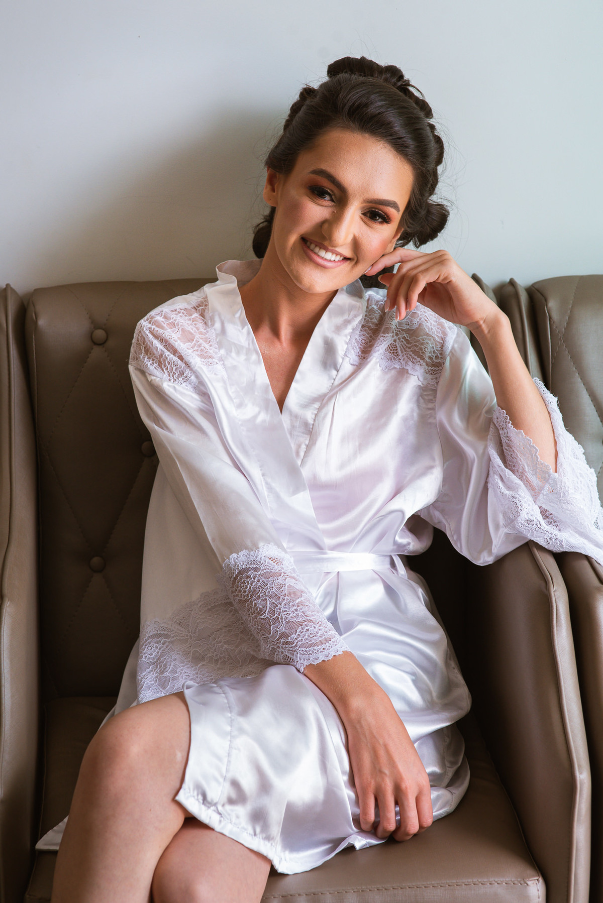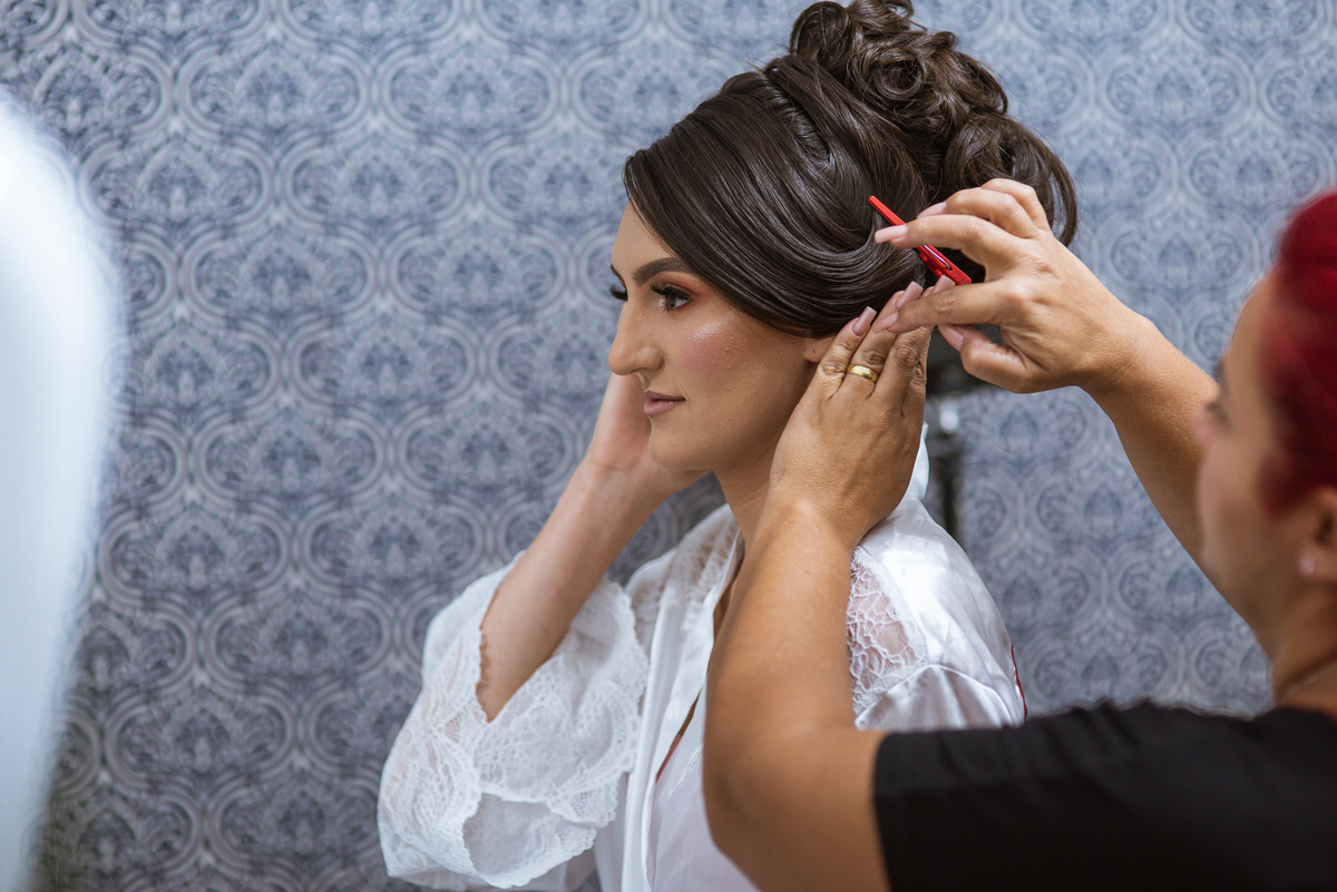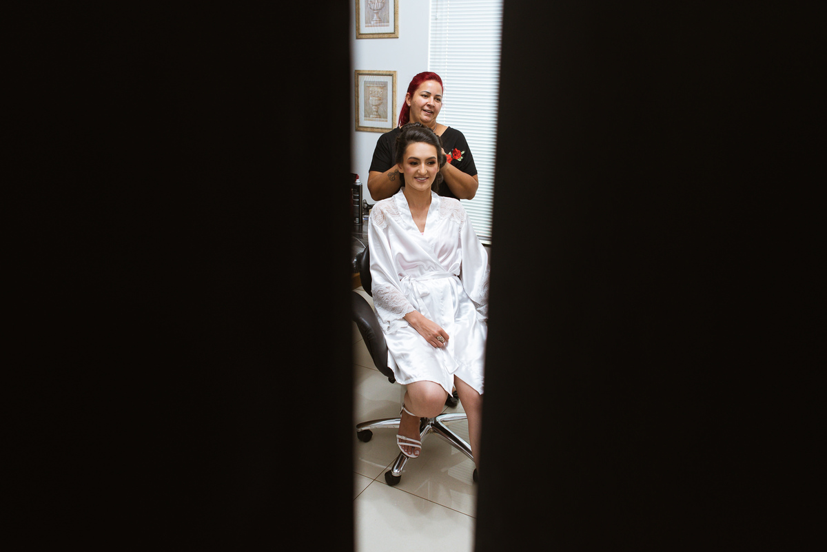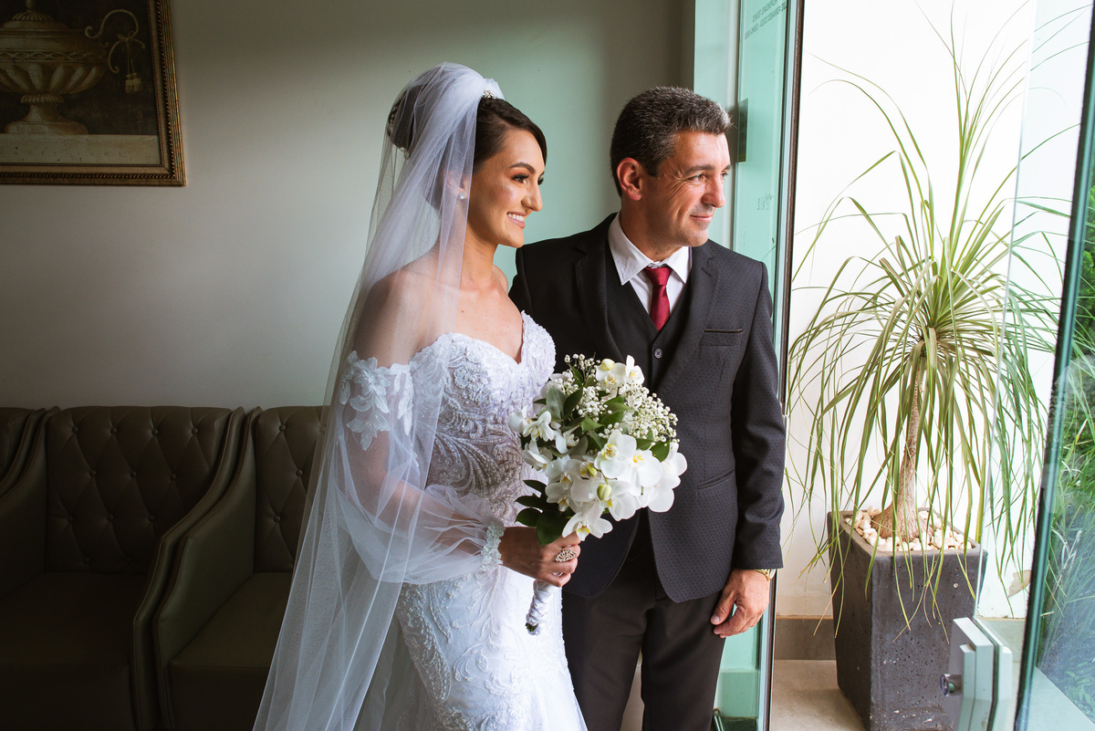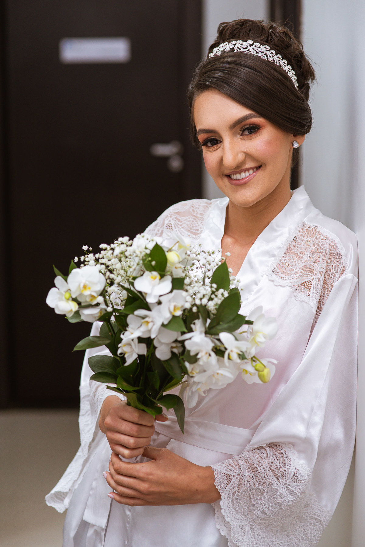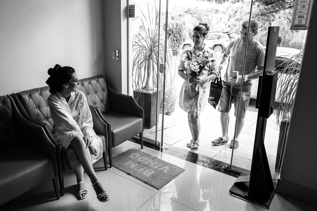 Ao chegar no local, Camila estava aguardando super tranquila o momento em que seu penteado seria produzido. Junto de sua mãe e sua tia, elas estavam bem descontraídas e se divertindo com toda a emoção daquele momento. O pai da noiva também compareceu trazendo o majestoso buquê de flores que a noiva levaria ao altar. Aproveitamos para registrar esse momento e demonstrar todo o carinho que eles tem um pelo outro. Enquanto a produção acontecia, Camila me contava sobre o quanto ela estava ansiosa no dia anterior, e naquele momento ali estava super tranquila, até estranhou toda aquela tranquilidade.