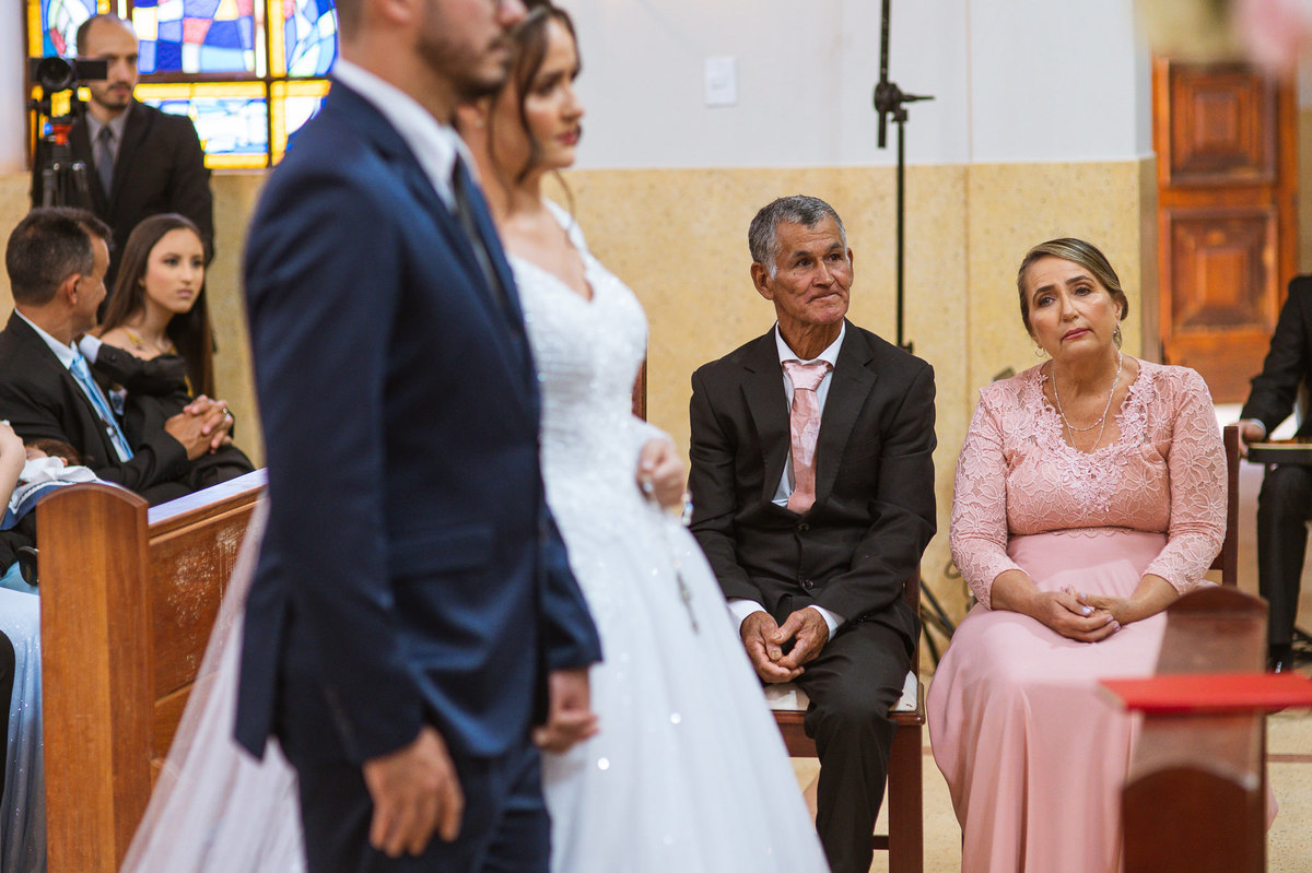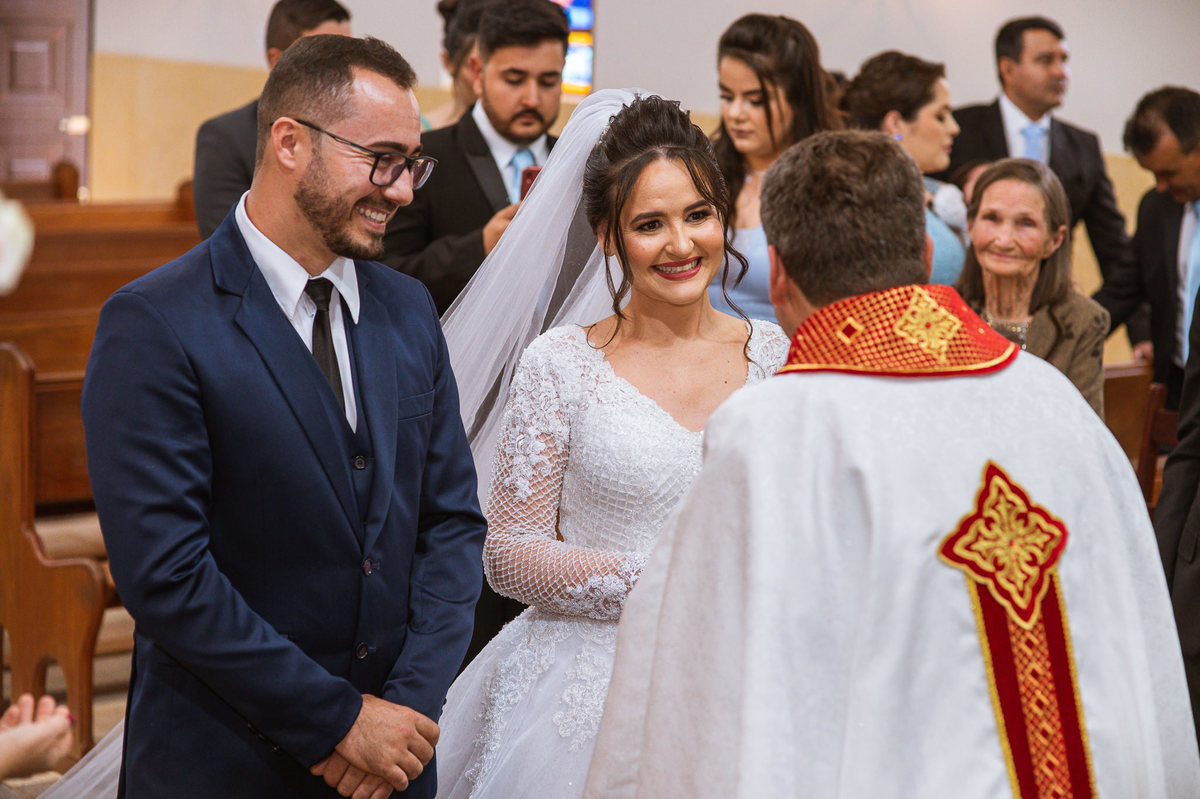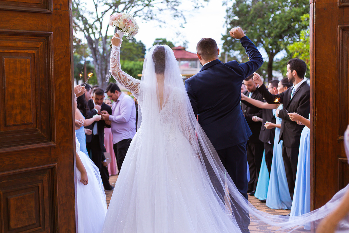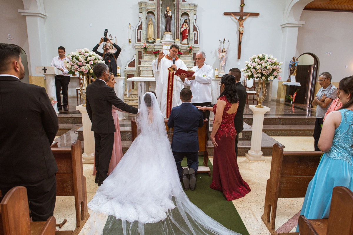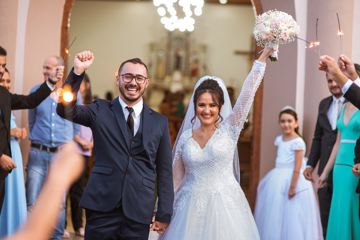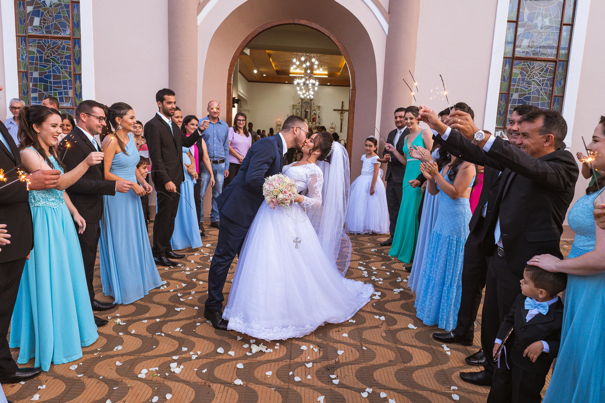 O padre os recebeu carinhosamente e realizou uma celebração linda e emocionante. A homilia nos fez meditar sobre tudo que envolve o casamento. Os noivos fizeram os seus votos de amor, trocaram as alianças, foram abençoados pelos seus pais e declarados casados perante Deus e as testemunhas que ali estavam. Fizemos todas as fotos de praxe, com os padrinhos e pais e fomos fazer a saída. Do lado de fora, já os aguardavam seus padrinhos com os famosos Sparkles na mão. Foi uma dificuldade acendê-los por causa do vento, mas no final deu tudo certo. Os noivos saíram e foram recebidos calorosamente por todos os convidados. Diego e Tiálita receberam os cumprimentos dos convidados ali na porta da Igreja.