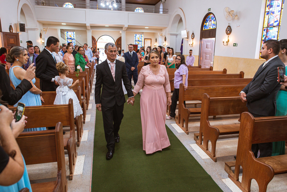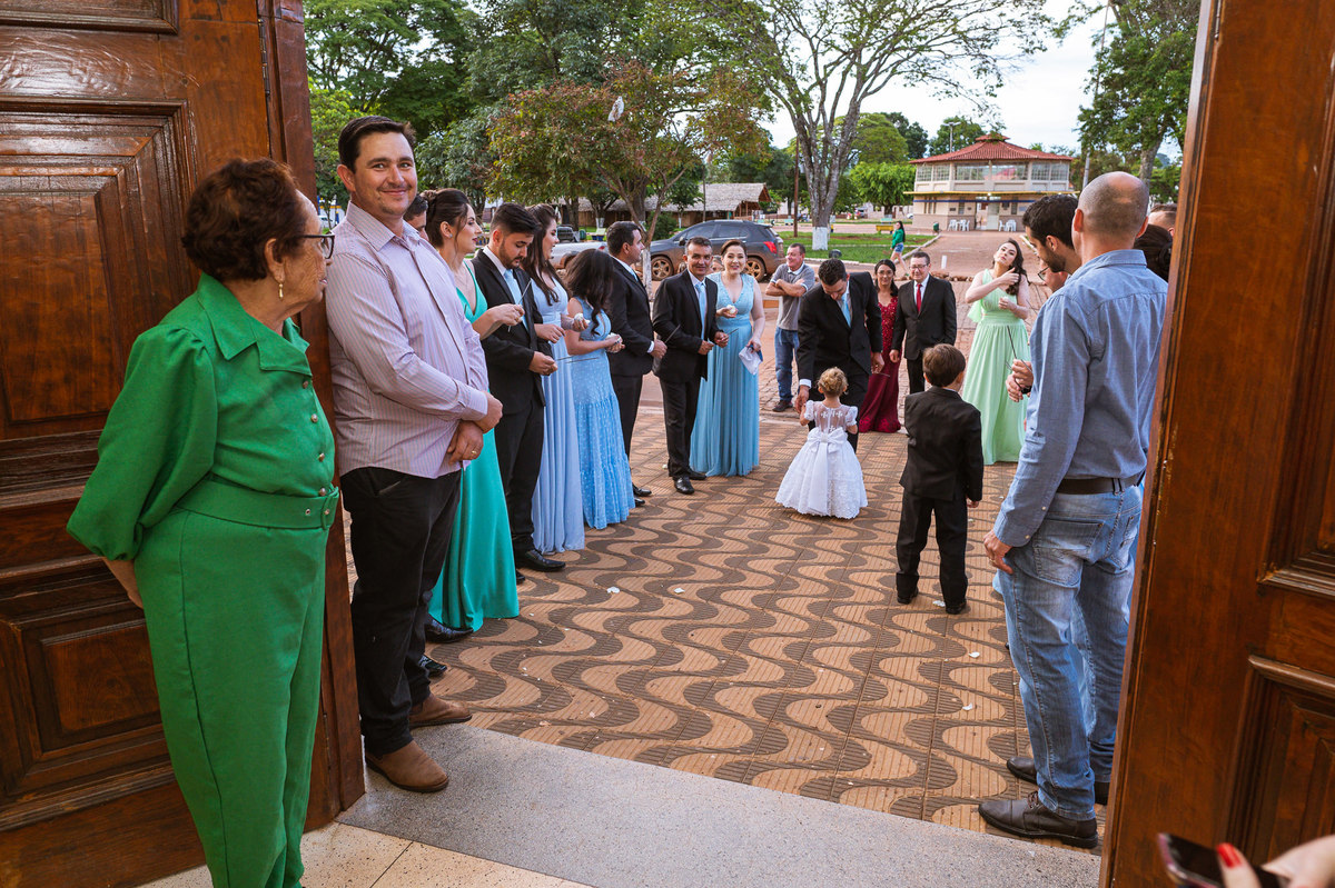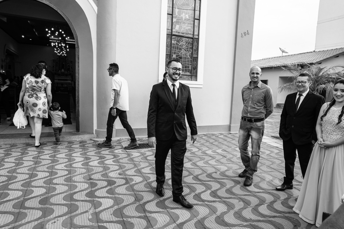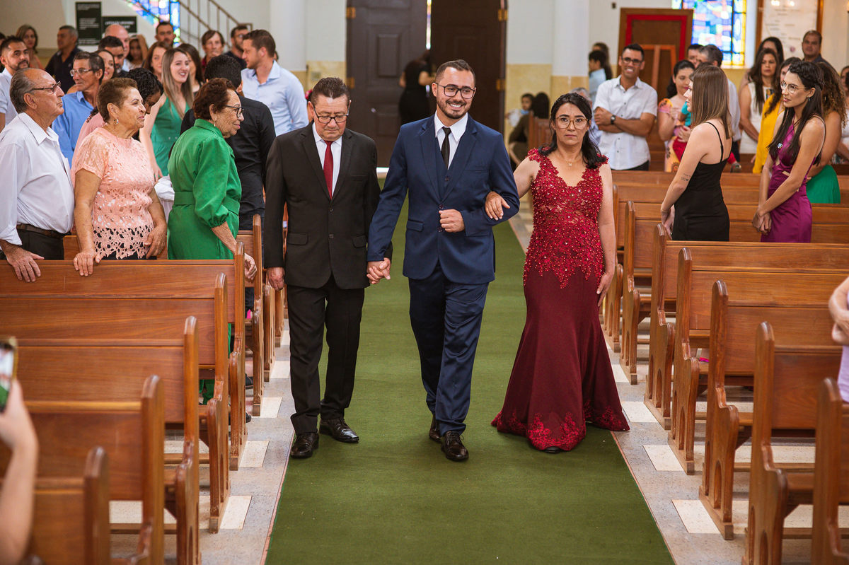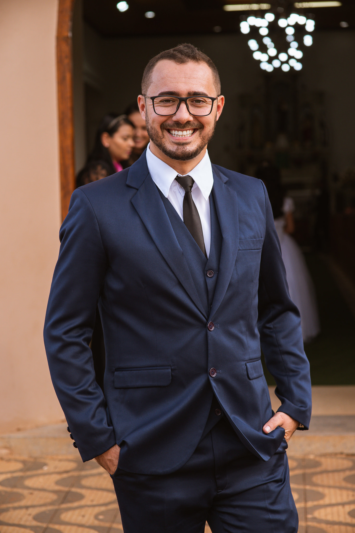 Pouco tempo depois, nós também fomos para a cerimônia. A Igreja Matriz de Tiros é linda, com uma iluminação maravilhosa. Os convidados estavam sendo organizados do lado de dentro e do lado de fora estavam na fila todos os padrinhos. Diego cumprimentava todos e com aquele sorrisão de canto a canto do rosto. A felicidade estampada no rosto e o coração quase explodindo de tanta emoção. Assim, os músicos começaram a tocar e a celebração teve seu início. Os padrinhos entraram um por um desfilando por todo corredor. Diego e seus pais também adentraram sorridentes e felizes demais. Agora já no altar, o noivo aguardava sua amada adentrar e se encontrar com ele.