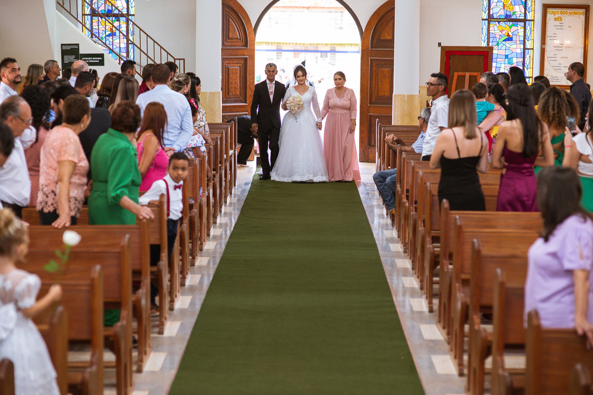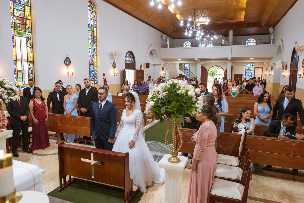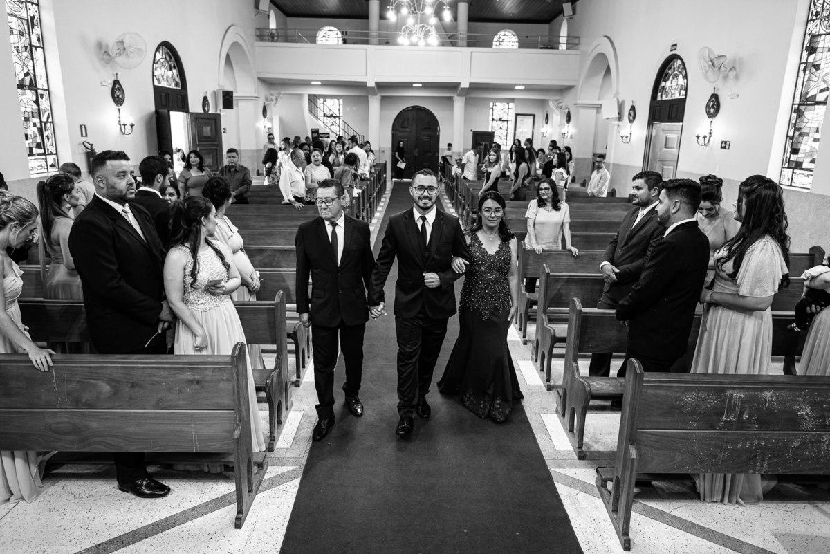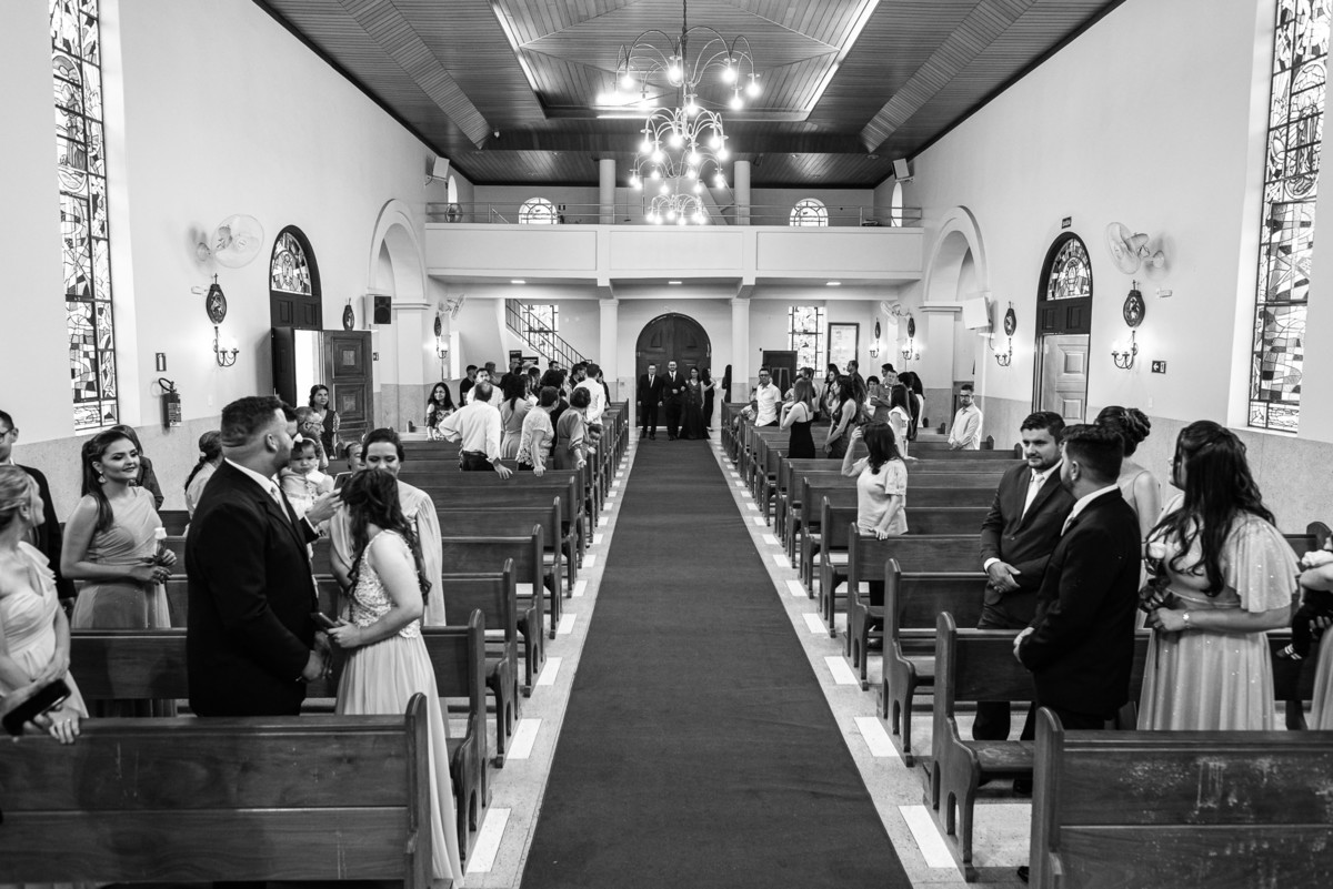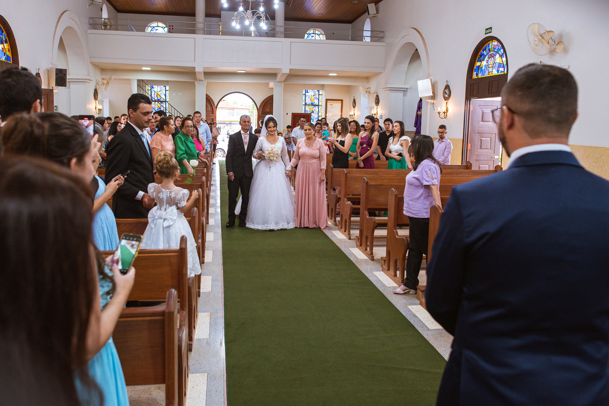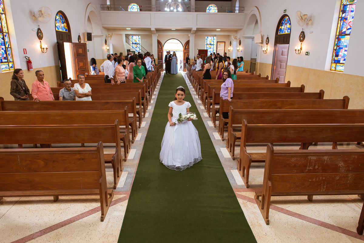 Pouco tempo depois, nós também fomos para a cerimônia. A Igreja Matriz de Tiros é linda, com uma iluminação maravilhosa. Os convidados estavam sendo organizados do lado de dentro e do lado de fora estavam na fila todos os padrinhos. Diego cumprimentava todos e com aquele sorrisão de canto a canto do rosto. A felicidade estampada no rosto e o coração quase explodindo de tanta emoção. Assim, os músicos começaram a tocar e a celebração teve seu início. Os padrinhos entraram um por um desfilando por todo corredor. Diego e seus pais também adentraram sorridentes e felizes demais. Agora já no altar, o noivo aguardava sua amada adentrar e se encontrar com ele.