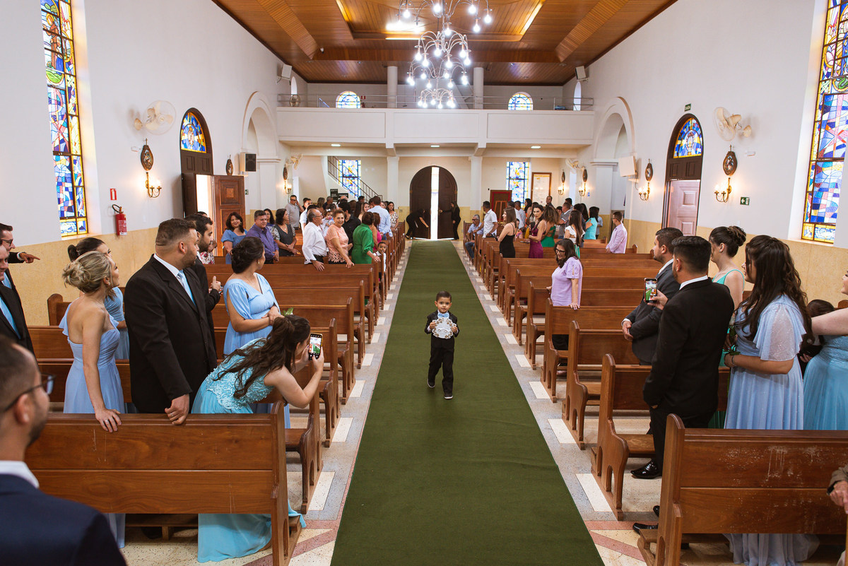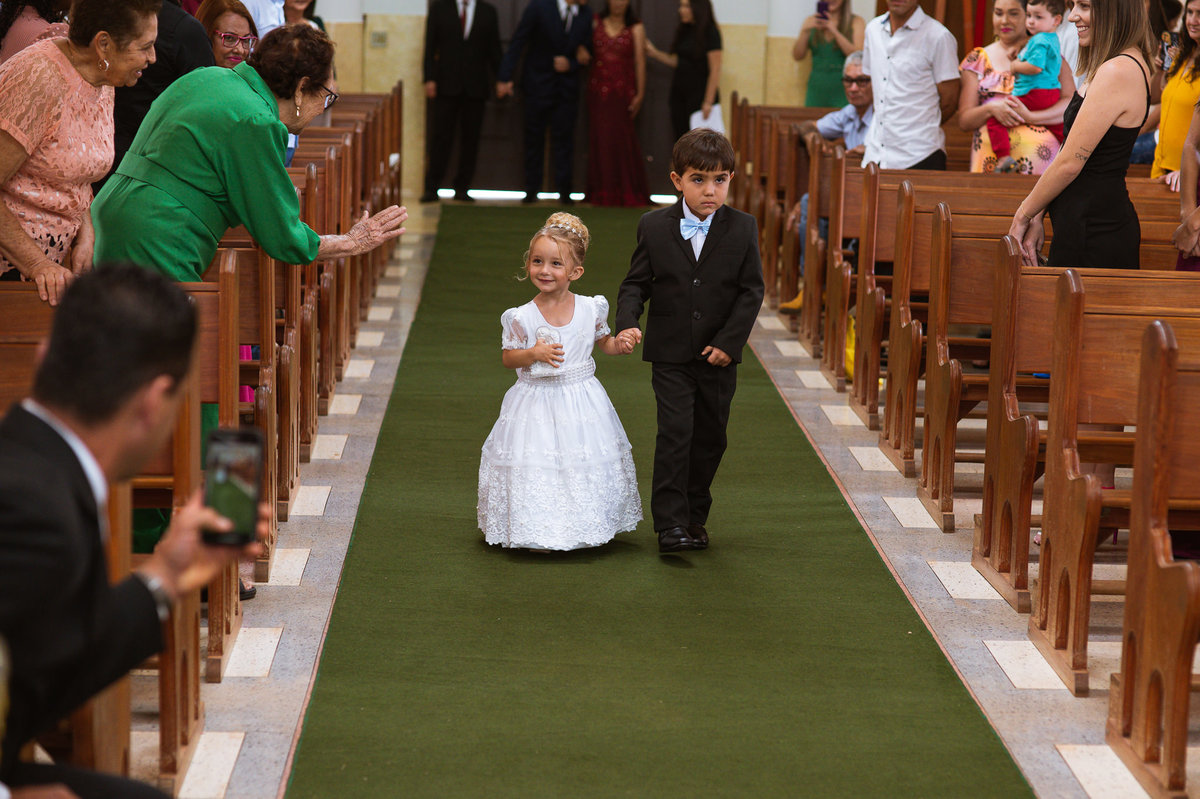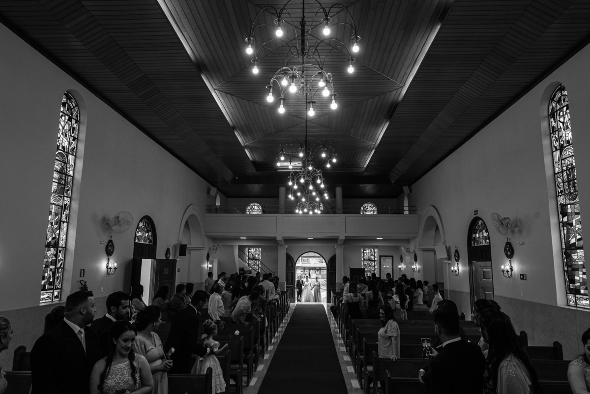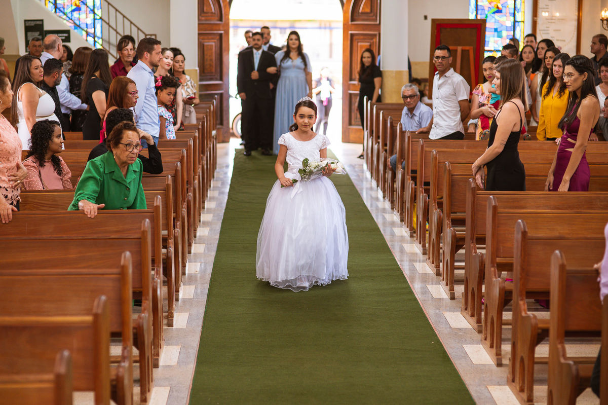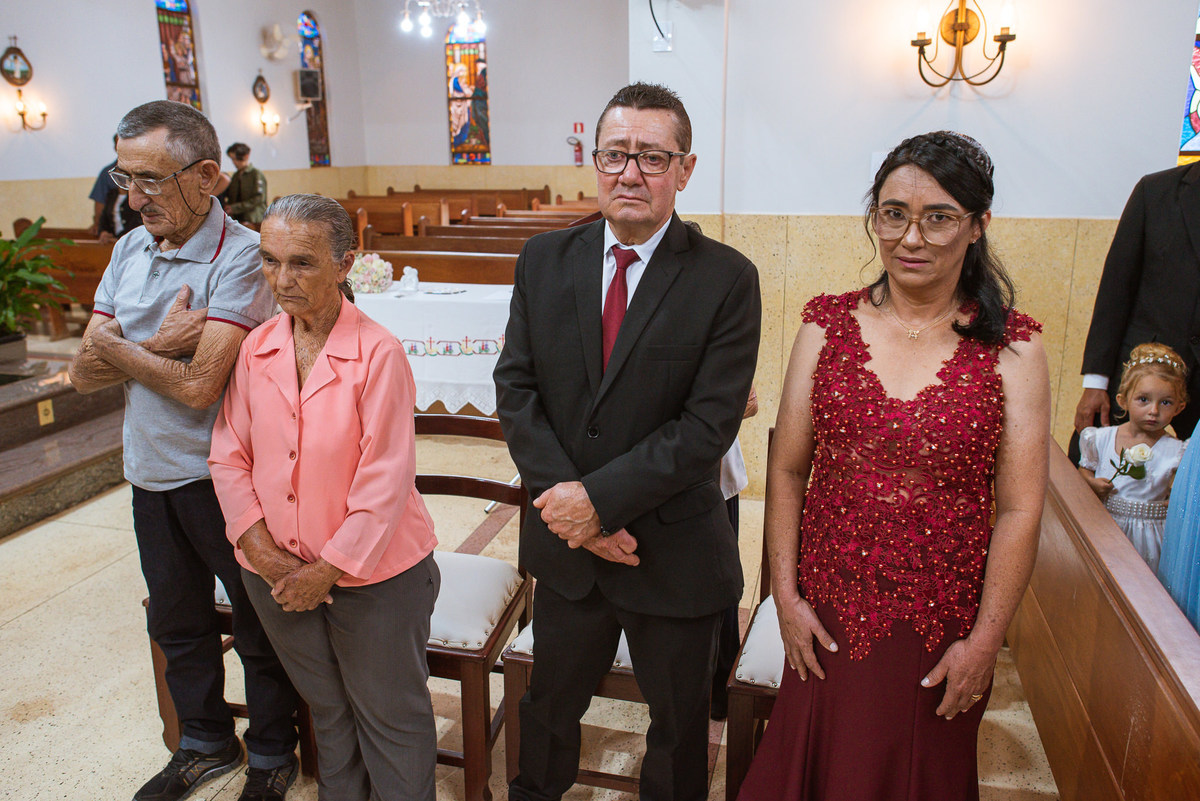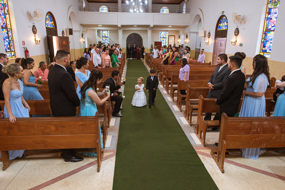Pouco tempo depois, nós também fomos para a cerimônia. A Igreja Matriz de Tiros é linda, com uma iluminação maravilhosa. Os convidados estavam sendo organizados do lado de dentro e do lado de fora estavam na fila todos os padrinhos. Diego cumprimentava todos e com aquele sorrisão de canto a canto do rosto. A felicidade estampada no rosto e o coração quase explodindo de tanta emoção. Assim, os músicos começaram a tocar e a celebração teve seu início. Os padrinhos entraram um por um desfilando por todo corredor. Diego e seus pais também adentraram sorridentes e felizes demais. Agora já no altar, o noivo aguardava sua amada adentrar e se encontrar com ele.