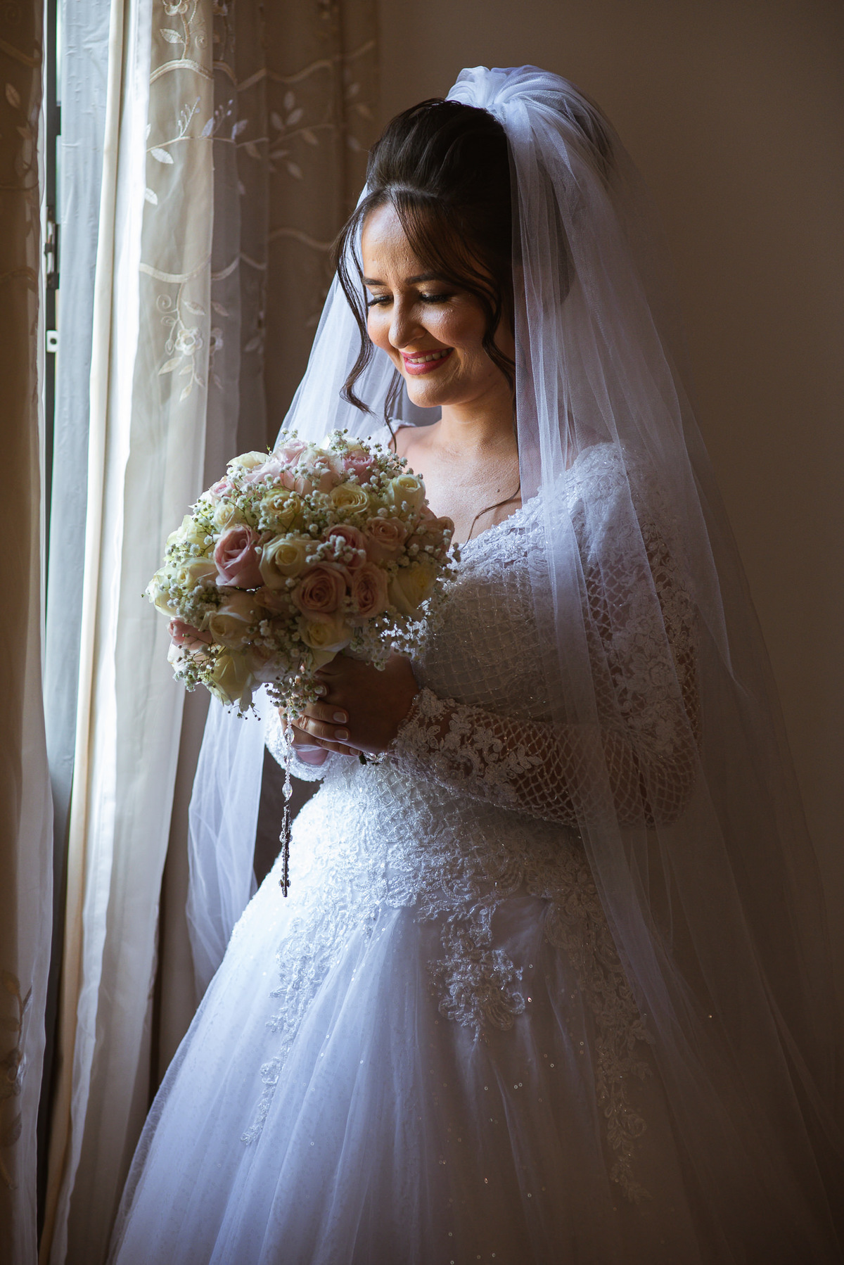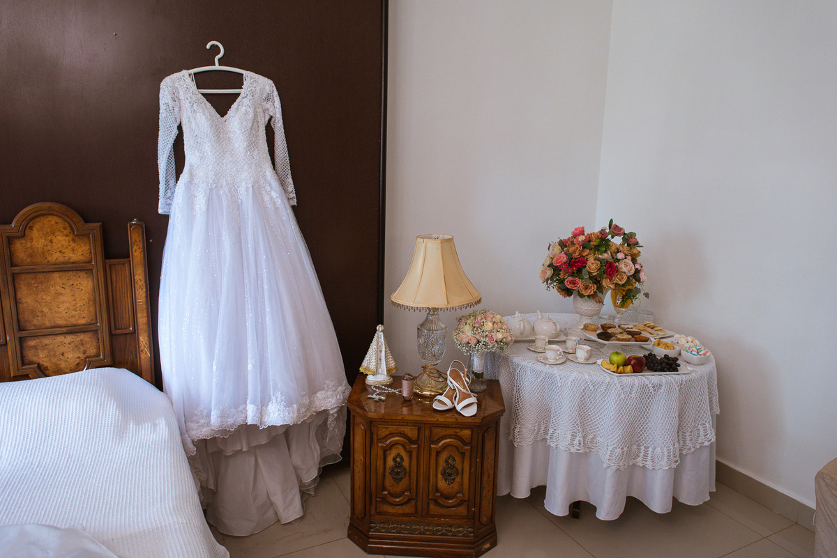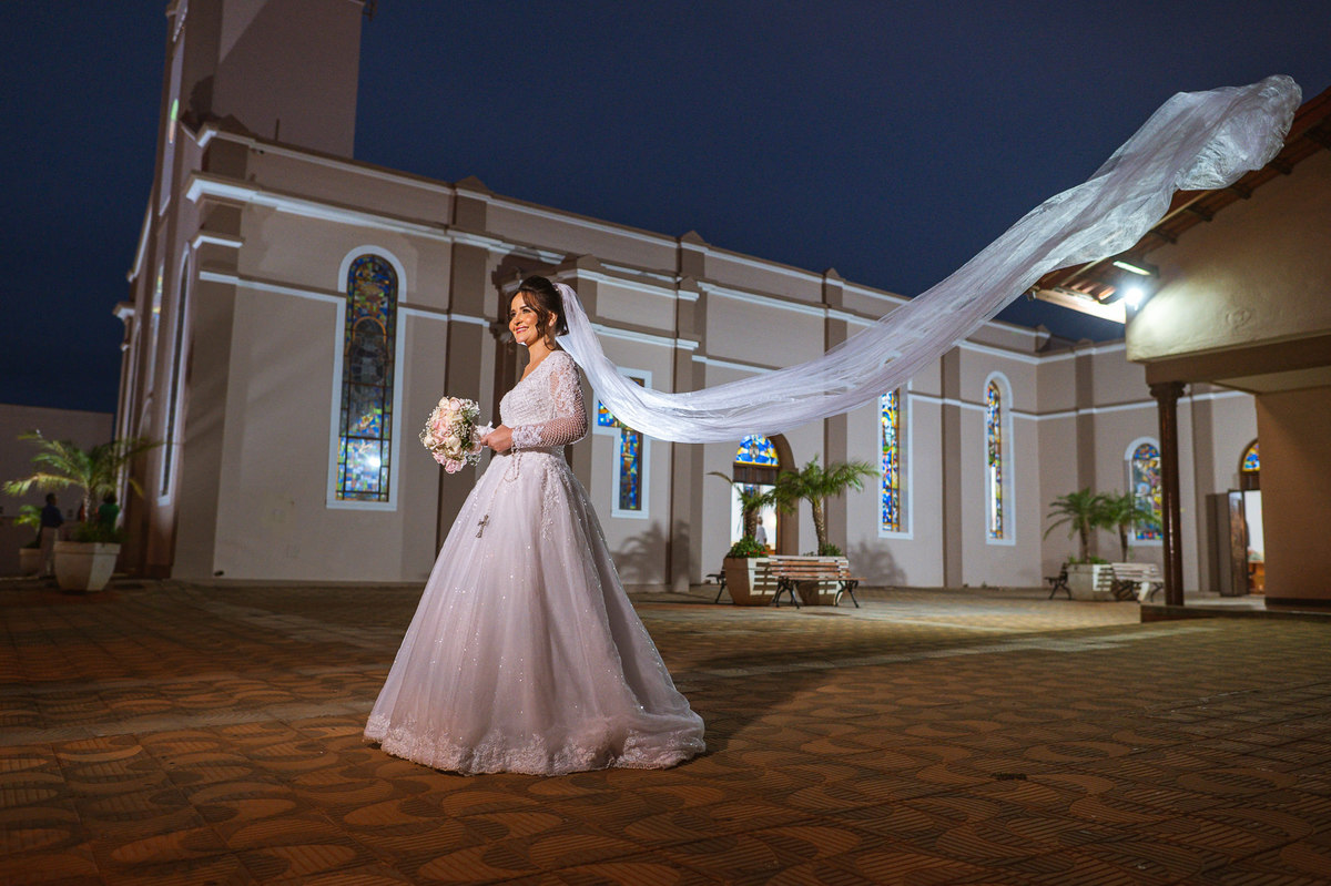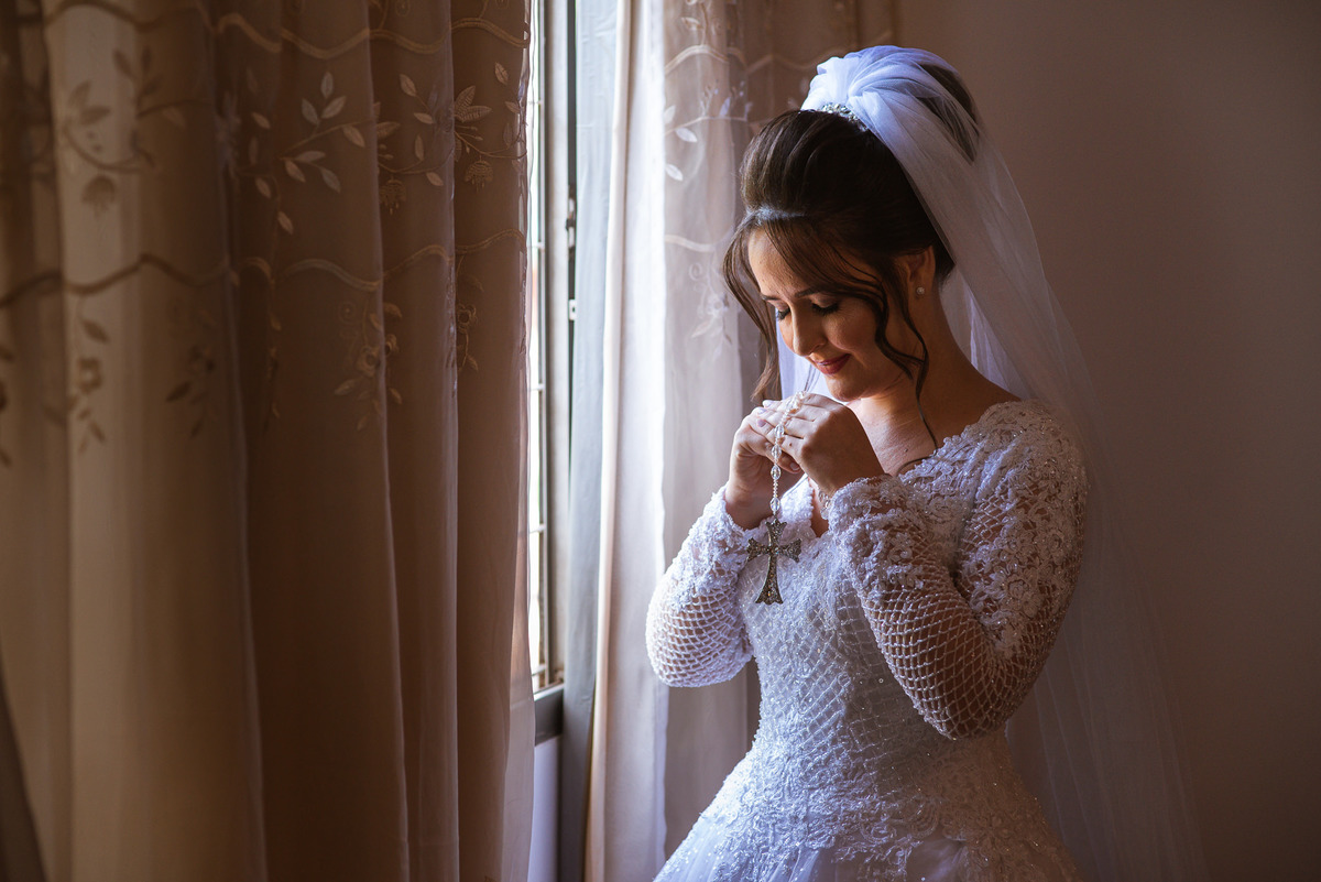 Finalizando o making of, Tiálita foi colocar seu vestido. Quando fomos chamados novamente, ficamos todos boquiabertos. O vestido, assinado pela Enlace Maison, caiu como uma luva na noiva. Ela ficou simplesmente maravilhosa. Fizemos algumas fotos e a equipe de vídeo seus takes e enfim chegava a hora de voltar o véu. A mãe da noiva tremia de medo, e eu com meu coração morrendo de medo de dar algo errado, porém confiante de que aquilo tudo fazia parte. A emoção que passamos era só pra deixar aquele momento mais emocionante. Poucos minutos depois, Tiálita estava prontinha e com seu véu colocado perfeitamente. Fizemos um book só com fotos dela de noiva, pois o conjunto estava tão lindo que não conseguia parar de fotografar.