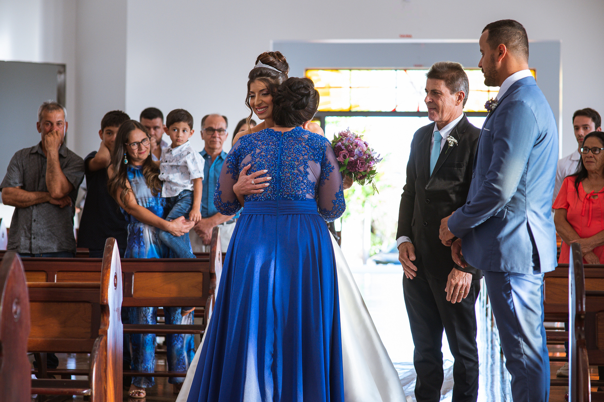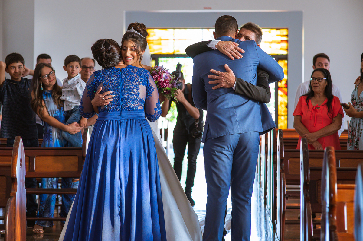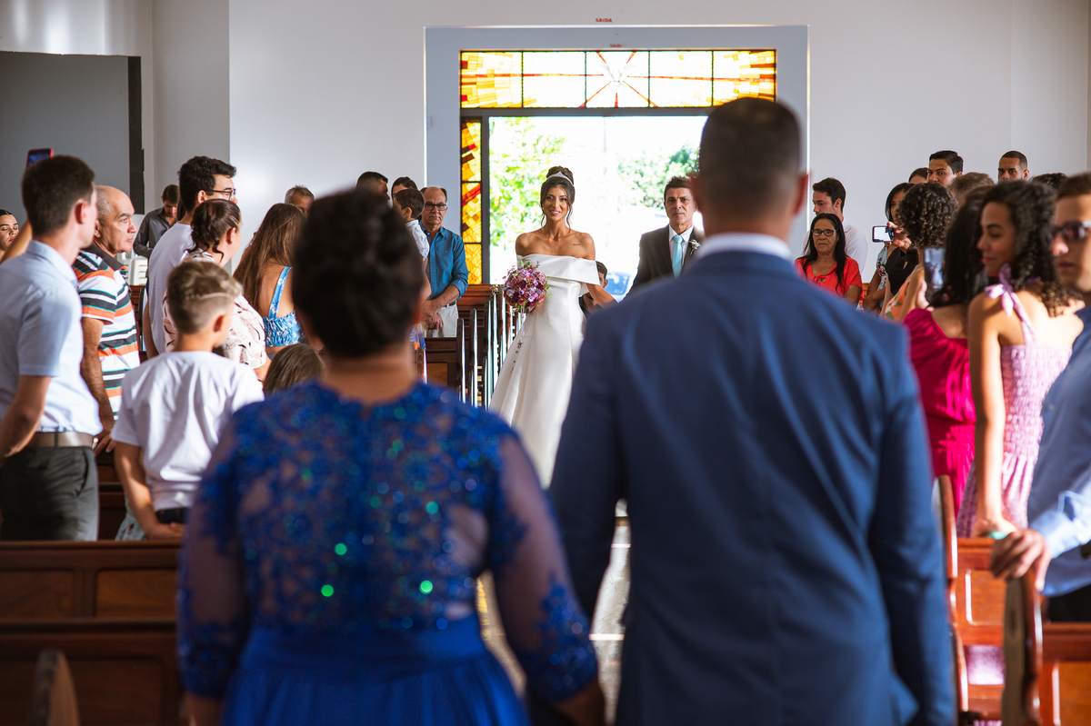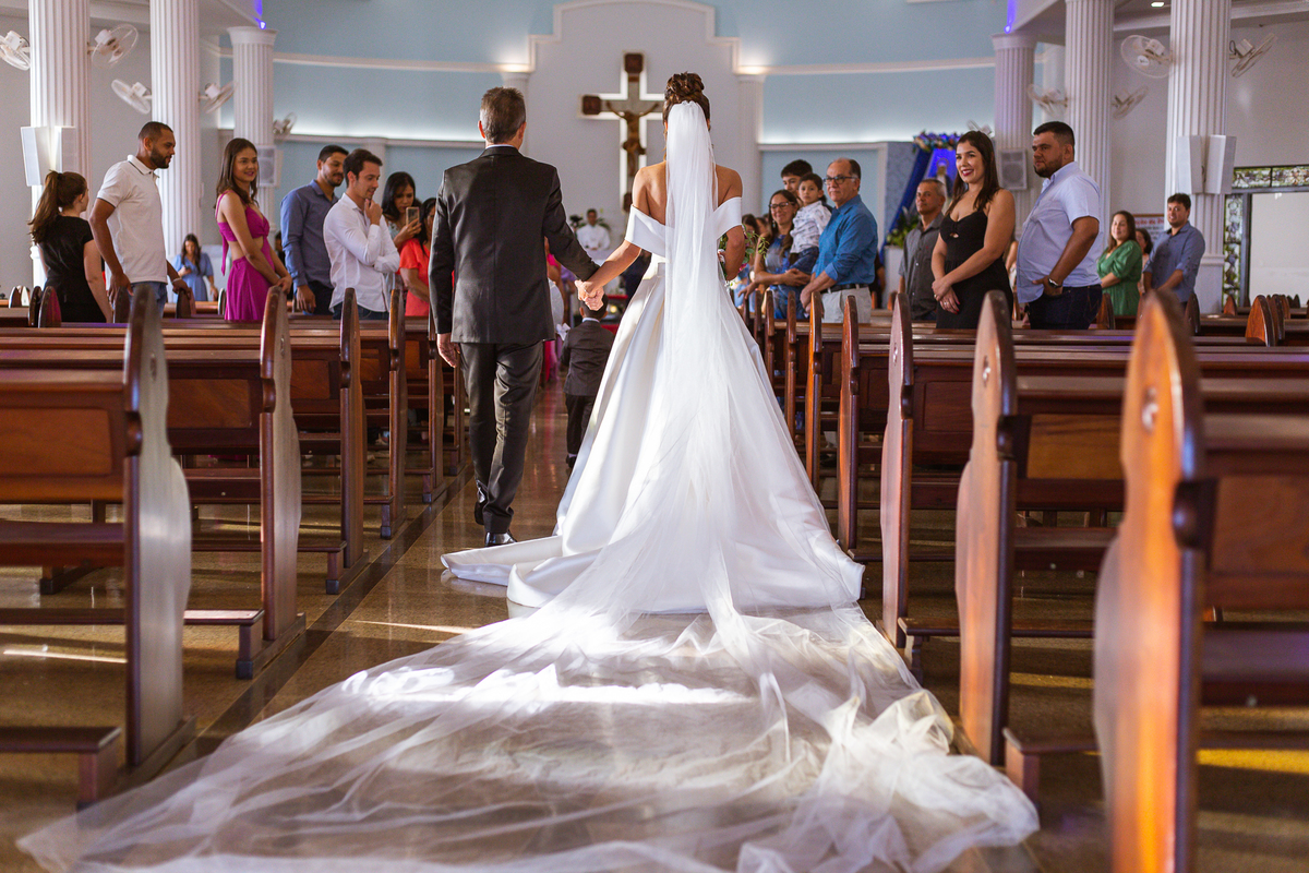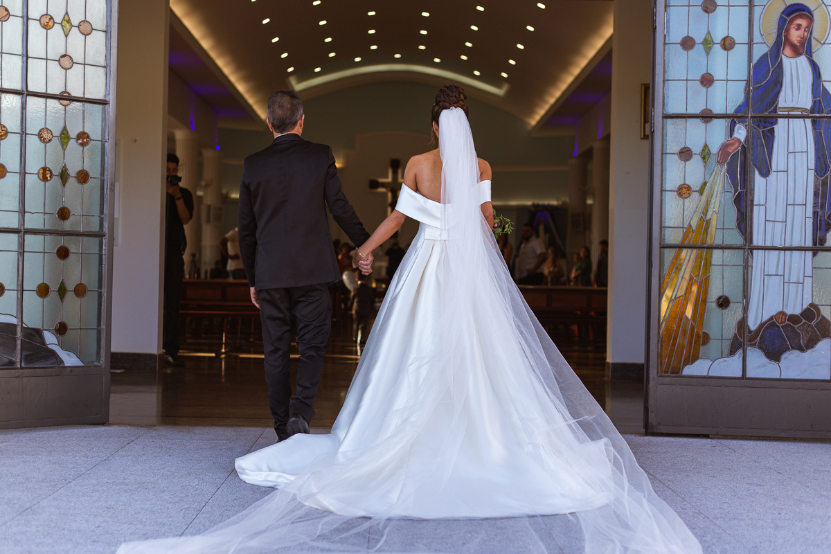 Do lado de fora, Isabella e seu pai aguardavam aqueles segundinhos para também poder entrar. A marcha nupcial já estava sendo entoada e então, as portas foram abertas, revelando para todos os convidados a beleza e exuberância da noiva e seu pai. Isabella caminhou lentamente rumo ao altar, os olhos fitos em seu noivo que estava ali, pertinho de receber sua mão. Poucos passos adiante, eles se encontraram. Os pais se cumprimentaram e despediram de seus filhos. Agora, Isabella e Luiz estavam frente e frente um com o outro. Eles posicionaram, olharam nos olhos e Isabella recebeu o beijo respeitoso em sua testa. Agora, de braços dados e juntinhos, eles caminharam rumo ao altar para receber a bênção de Deus através da palavra do padre celebrante.