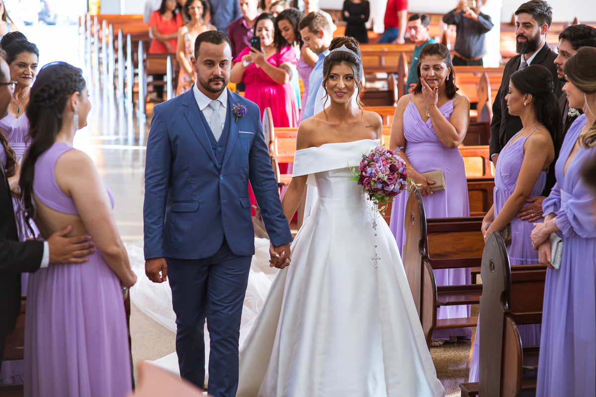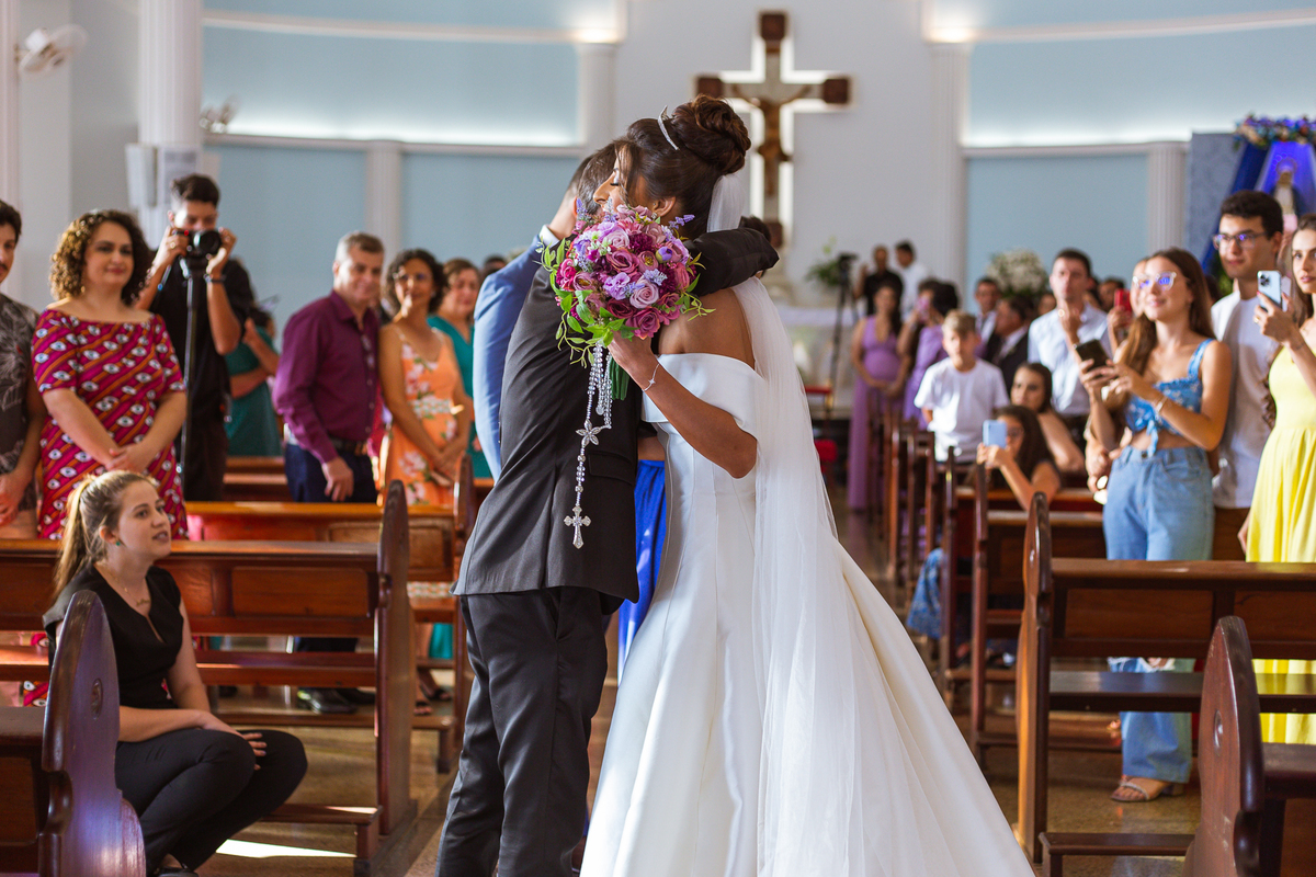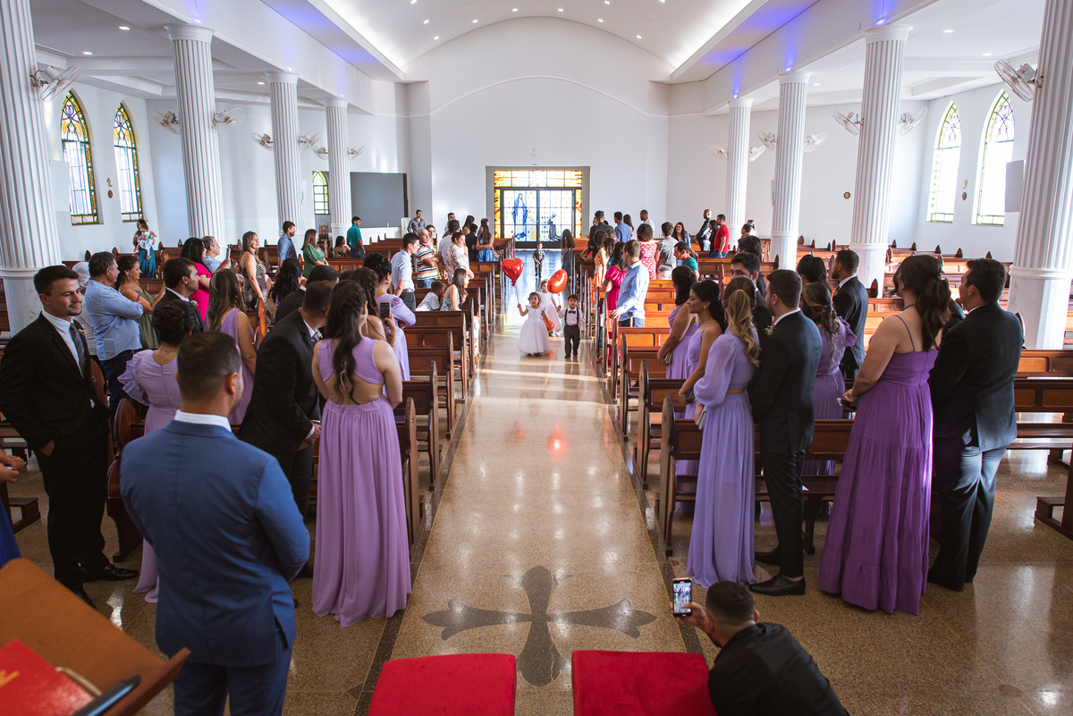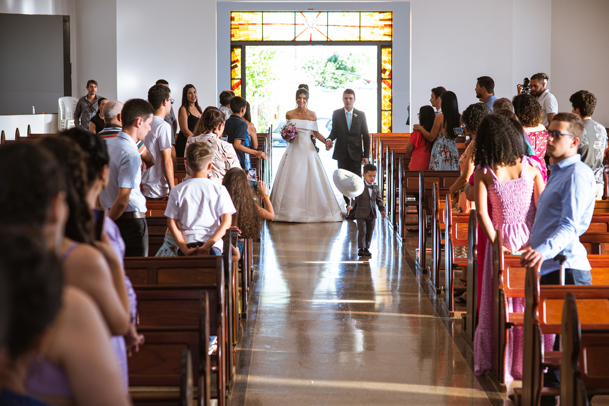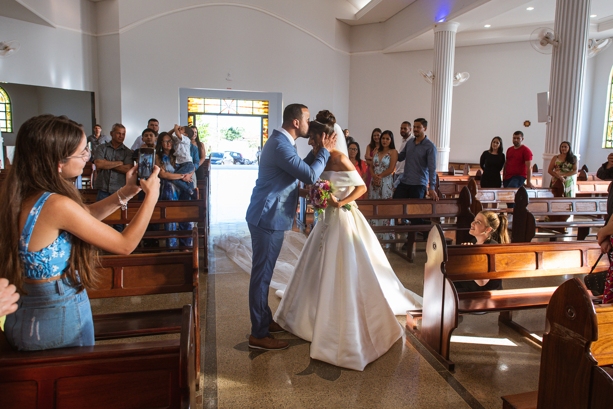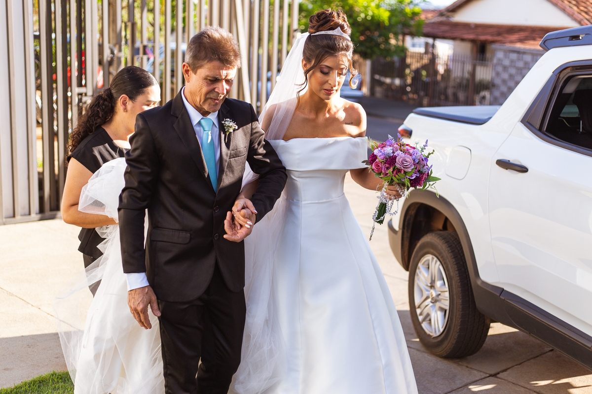 Do lado de fora, Isabella e seu pai aguardavam aqueles segundinhos para também poder entrar. A marcha nupcial já estava sendo entoada e então, as portas foram abertas, revelando para todos os convidados a beleza e exuberância da noiva e seu pai. Isabella caminhou lentamente rumo ao altar, os olhos fitos em seu noivo que estava ali, pertinho de receber sua mão. Poucos passos adiante, eles se encontraram. Os pais se cumprimentaram e despediram de seus filhos. Agora, Isabella e Luiz estavam frente e frente um com o outro. Eles posicionaram, olharam nos olhos e Isabella recebeu o beijo respeitoso em sua testa. Agora, de braços dados e juntinhos, eles caminharam rumo ao altar para receber a bênção de Deus através da palavra do padre celebrante.