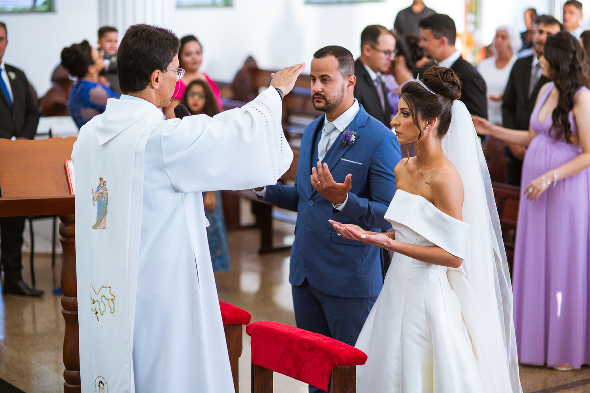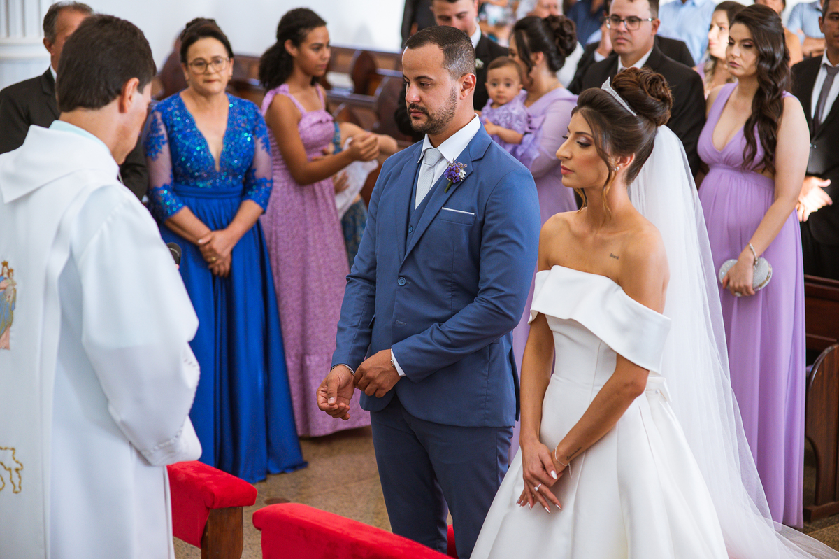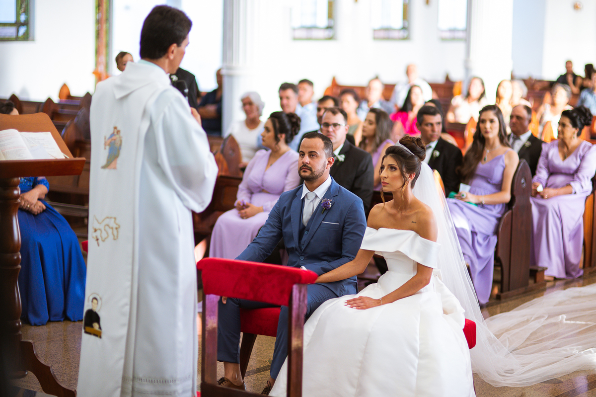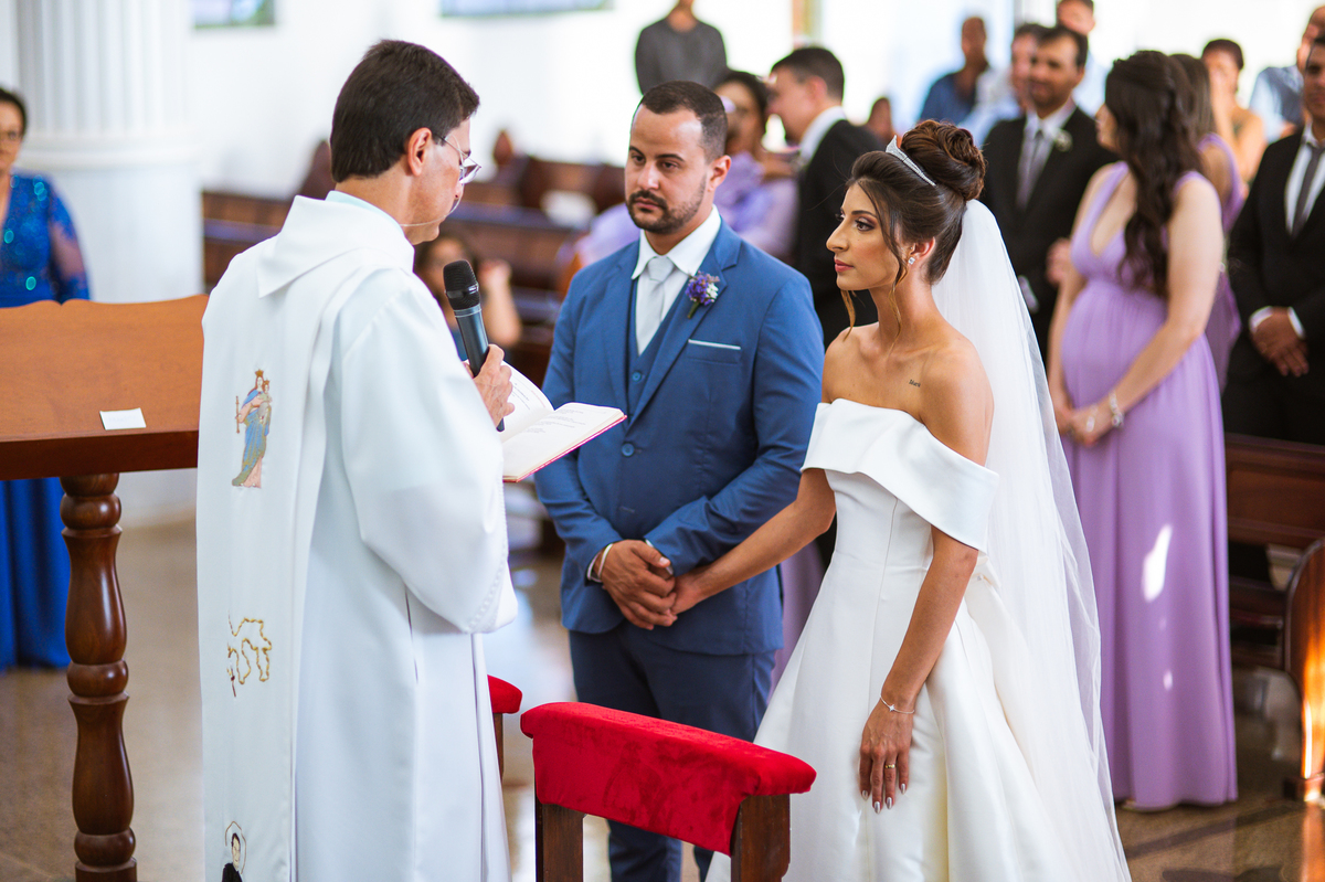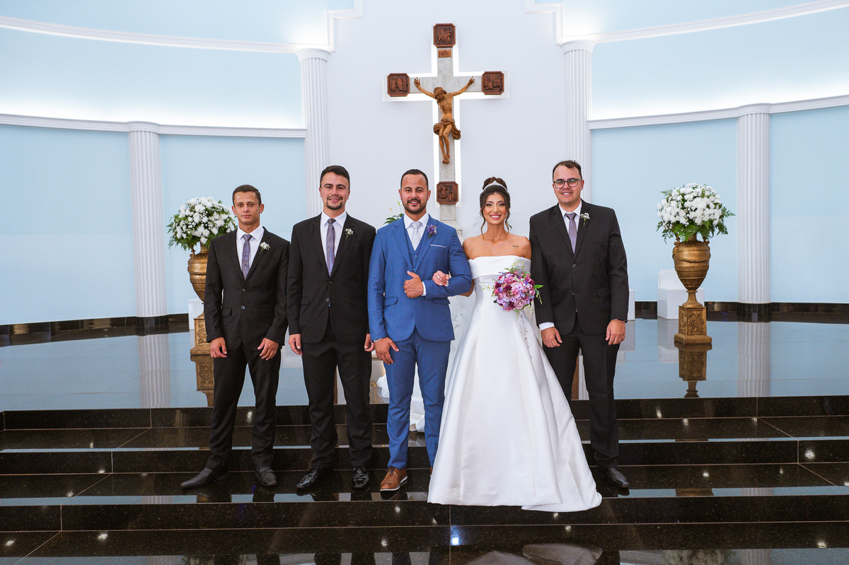 A cerimônia foi linda demais. A homilia foi tocante e todos prestaram bastante atenção em cada palavra dita pelo padre. Eles trocaram seus votos de amor eterno, receberam as alianças que foram abençoadas pelo padre e colocaram um do dedo do outro. Com um beijo na aliança, Luiz e Isabella selaram sua união perante Deus naquele momento. Com a bênção de seus pais e padrinhos, os noivos foram declarados casados e receberam os aplausos de todos. Finalizando a cerimônia, fizemos as fotos tradicionais com todos os padrinhos e parentes e logo estava terminada a celebração. Do lado de fora, os noivos foram recebidos com muitas palmas e com os sparkles nas mãos de cada um dos padrinhos. Eles receberam os cumprimentos e fomos para a praça fazer um pequeno ensaio de noivos.