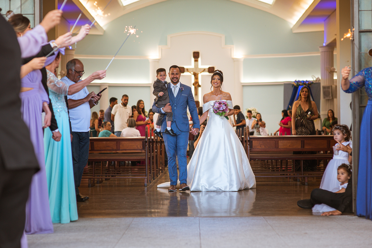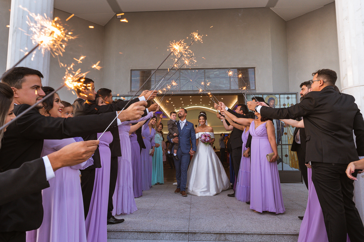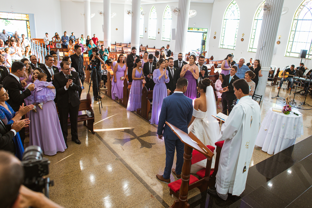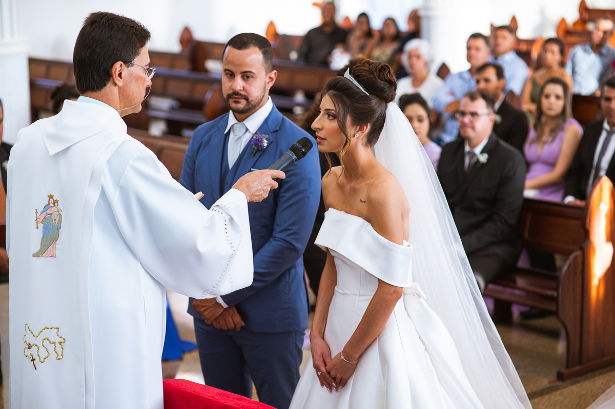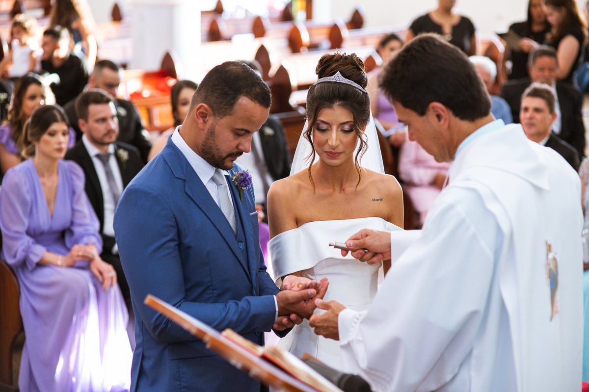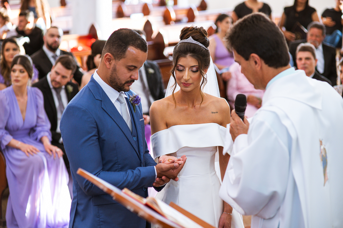 A cerimônia foi linda demais. A homilia foi tocante e todos prestaram bastante atenção em cada palavra dita pelo padre. Eles trocaram seus votos de amor eterno, receberam as alianças que foram abençoadas pelo padre e colocaram um do dedo do outro. Com um beijo na aliança, Luiz e Isabella selaram sua união perante Deus naquele momento. Com a bênção de seus pais e padrinhos, os noivos foram declarados casados e receberam os aplausos de todos. Finalizando a cerimônia, fizemos as fotos tradicionais com todos os padrinhos e parentes e logo estava terminada a celebração. Do lado de fora, os noivos foram recebidos com muitas palmas e com os sparkles nas mãos de cada um dos padrinhos. Eles receberam os cumprimentos e fomos para a praça fazer um pequeno ensaio de noivos.