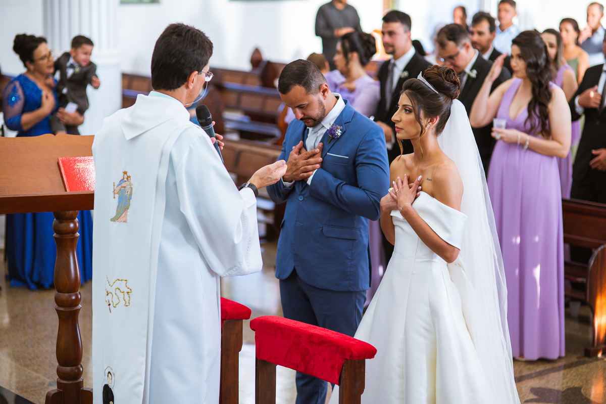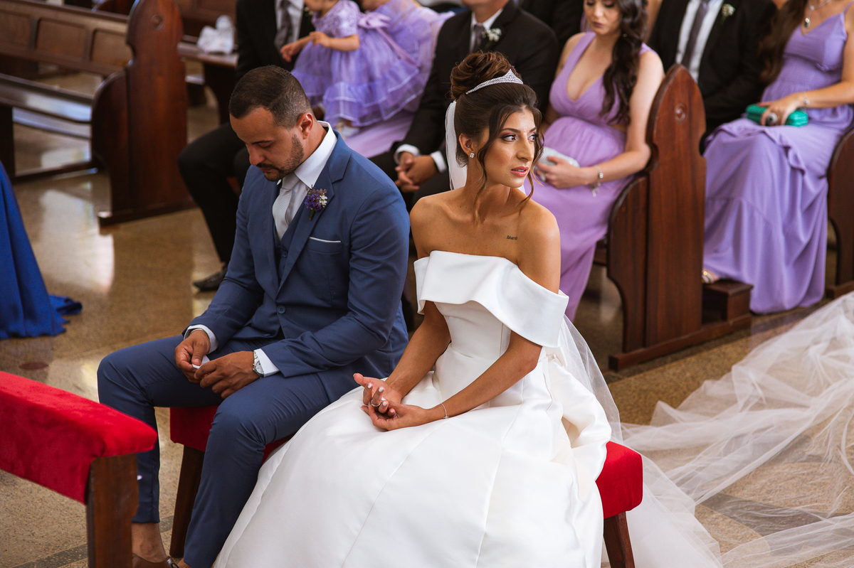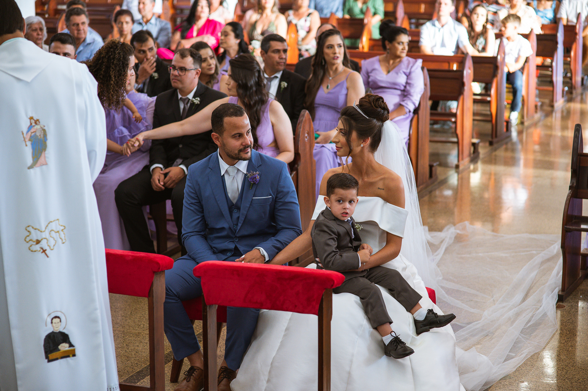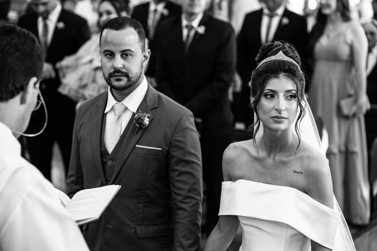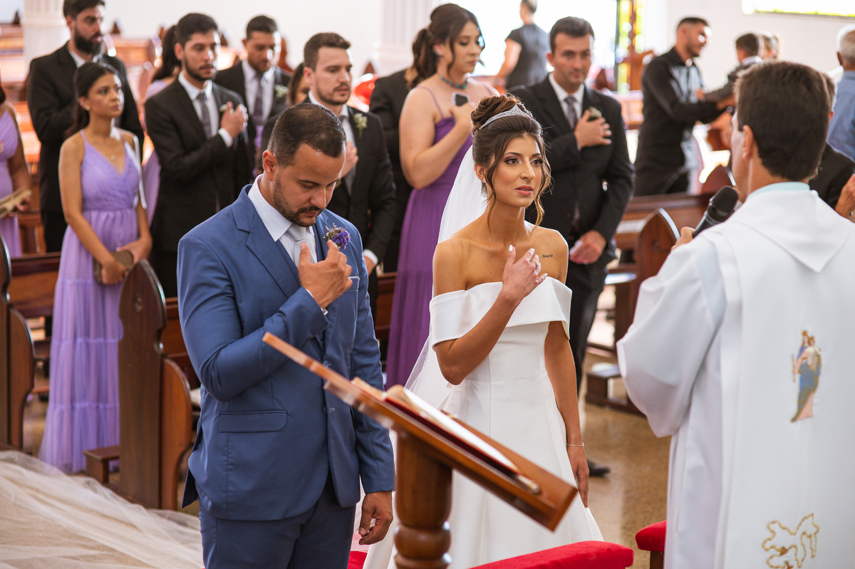 A cerimônia foi linda demais. A homilia foi tocante e todos prestaram bastante atenção em cada palavra dita pelo padre. Eles trocaram seus votos de amor eterno, receberam as alianças que foram abençoadas pelo padre e colocaram um do dedo do outro. Com um beijo na aliança, Luiz e Isabella selaram sua união perante Deus naquele momento. Com a bênção de seus pais e padrinhos, os noivos foram declarados casados e receberam os aplausos de todos. Finalizando a cerimônia, fizemos as fotos tradicionais com todos os padrinhos e parentes e logo estava terminada a celebração. Do lado de fora, os noivos foram recebidos com muitas palmas e com os sparkles nas mãos de cada um dos padrinhos. Eles receberam os cumprimentos e fomos para a praça fazer um pequeno ensaio de noivos.