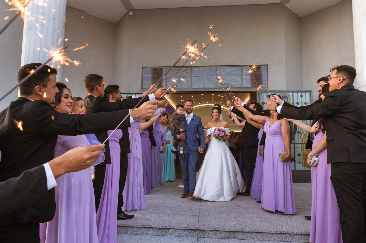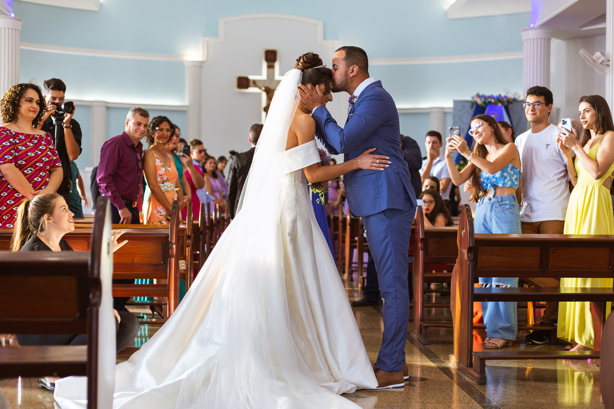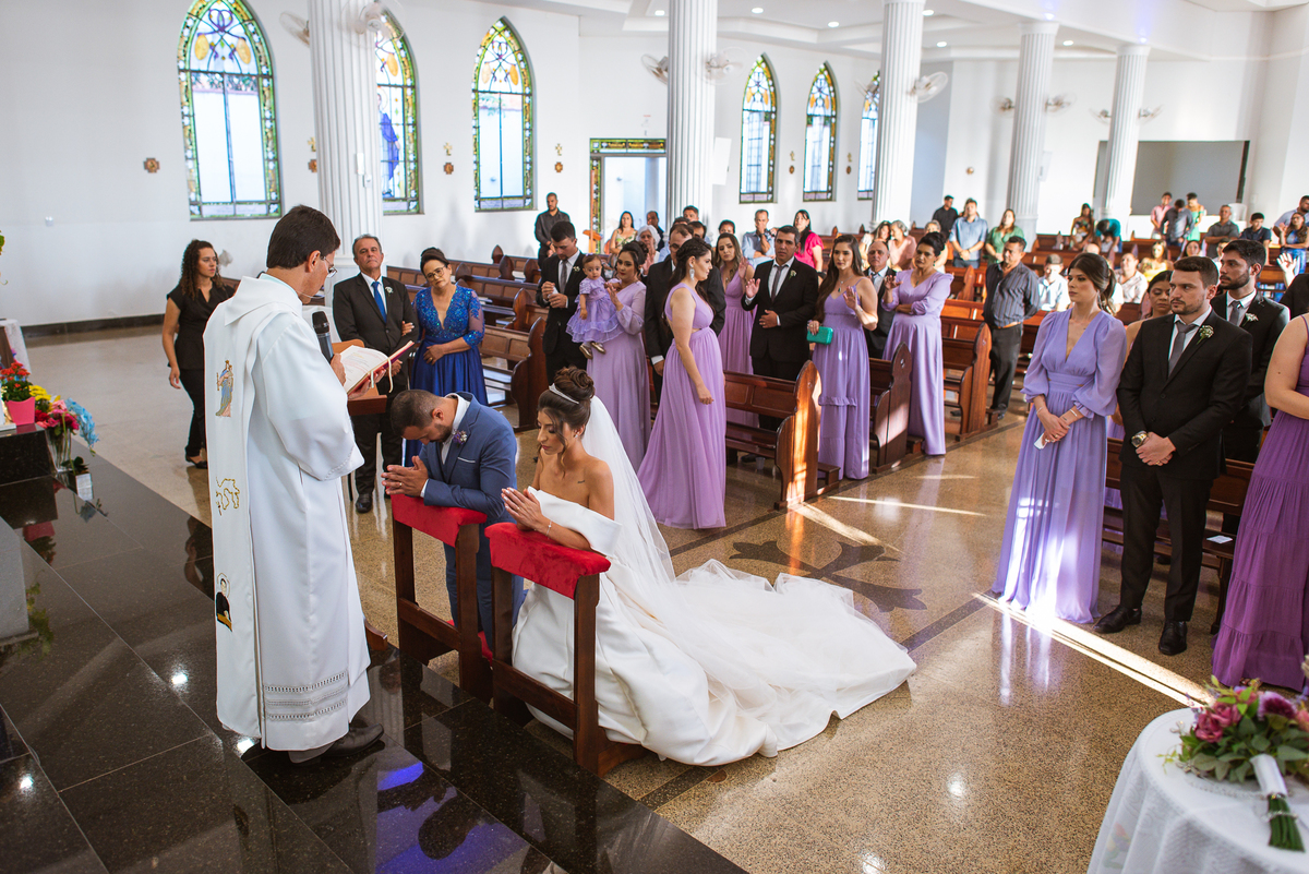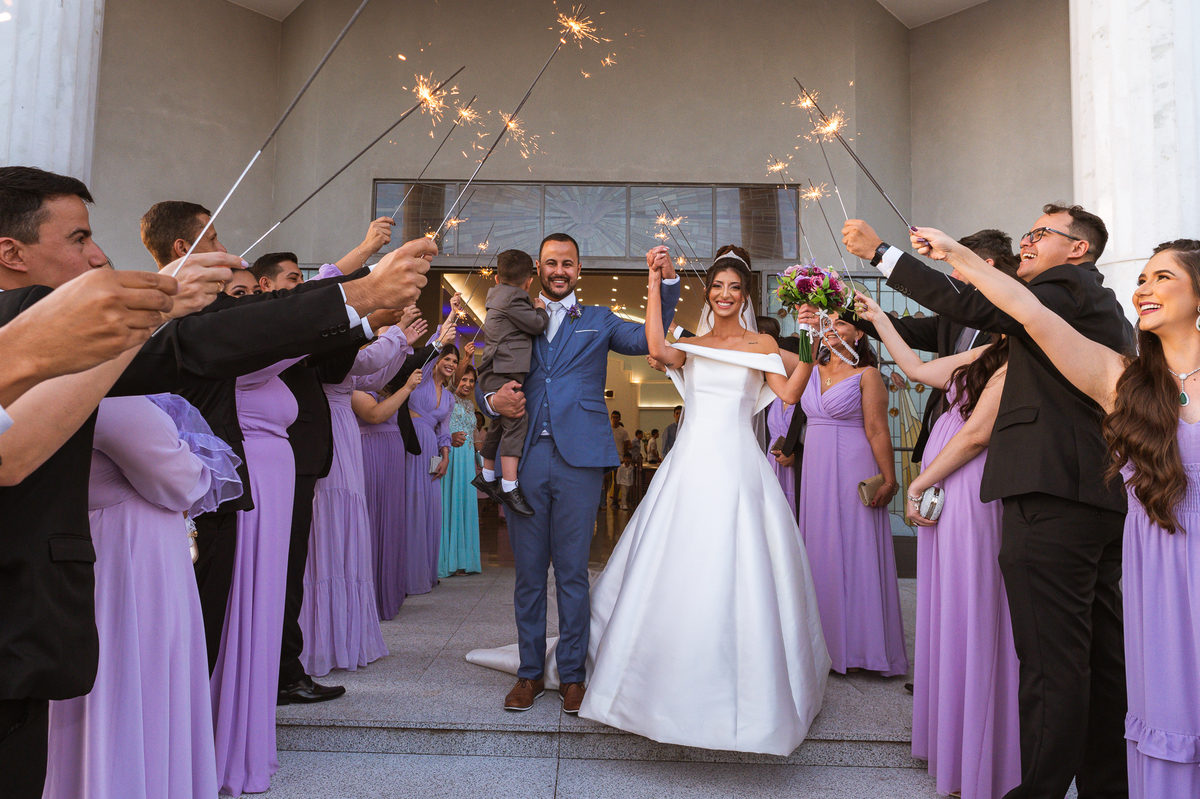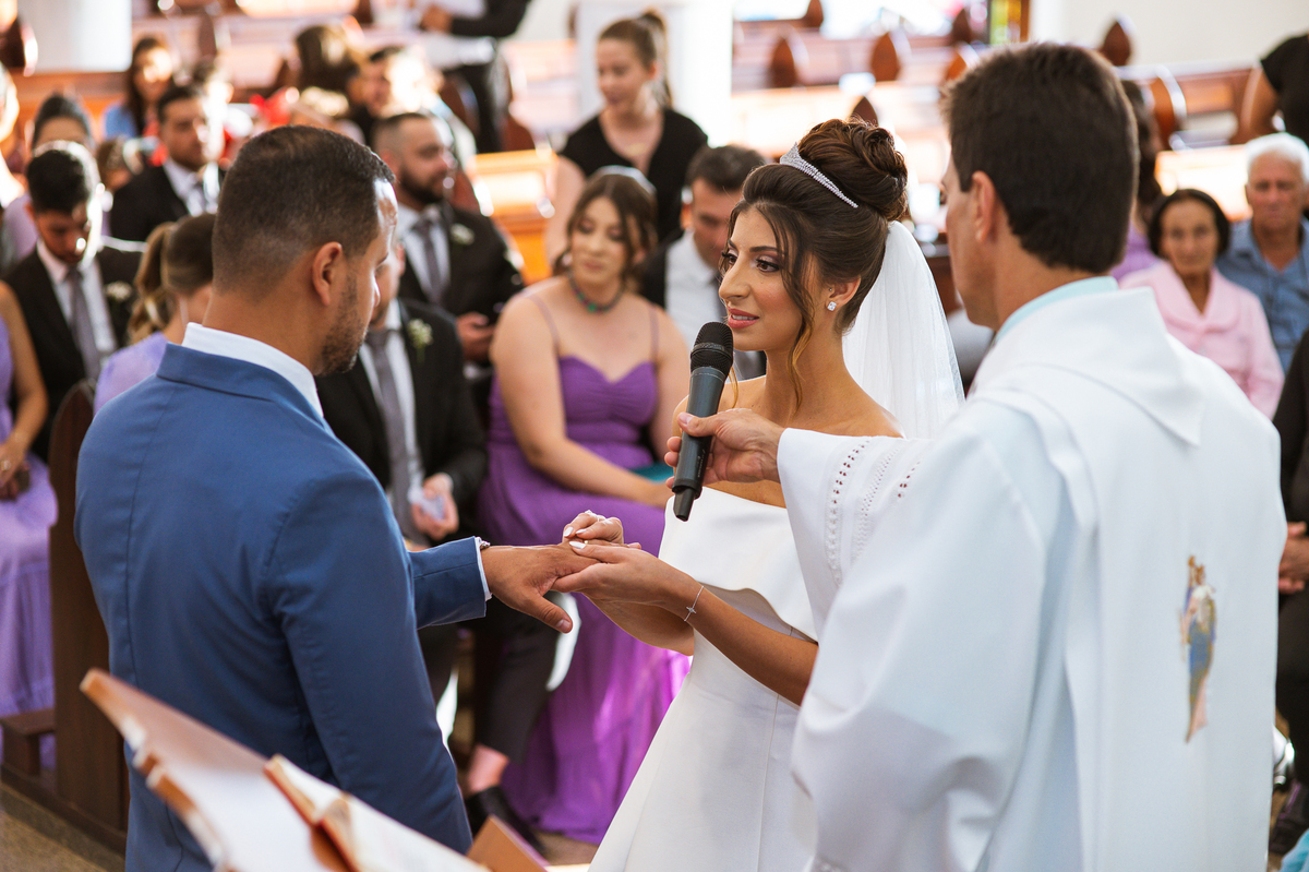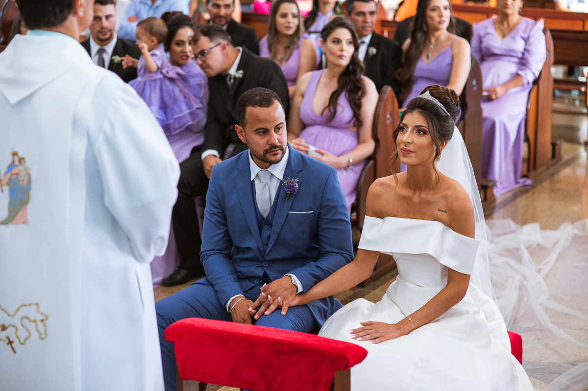 A cerimônia foi linda demais. A homilia foi tocante e todos prestaram bastante atenção em cada palavra dita pelo padre. Eles trocaram seus votos de amor eterno, receberam as alianças que foram abençoadas pelo padre e colocaram um do dedo do outro. Com um beijo na aliança, Luiz e Isabella selaram sua união perante Deus naquele momento. Com a bênção de seus pais e padrinhos, os noivos foram declarados casados e receberam os aplausos de todos. Finalizando a cerimônia, fizemos as fotos tradicionais com todos os padrinhos e parentes e logo estava terminada a celebração. Do lado de fora, os noivos foram recebidos com muitas palmas e com os sparkles nas mãos de cada um dos padrinhos. Eles receberam os cumprimentos e fomos para a praça fazer um pequeno ensaio de noivos.