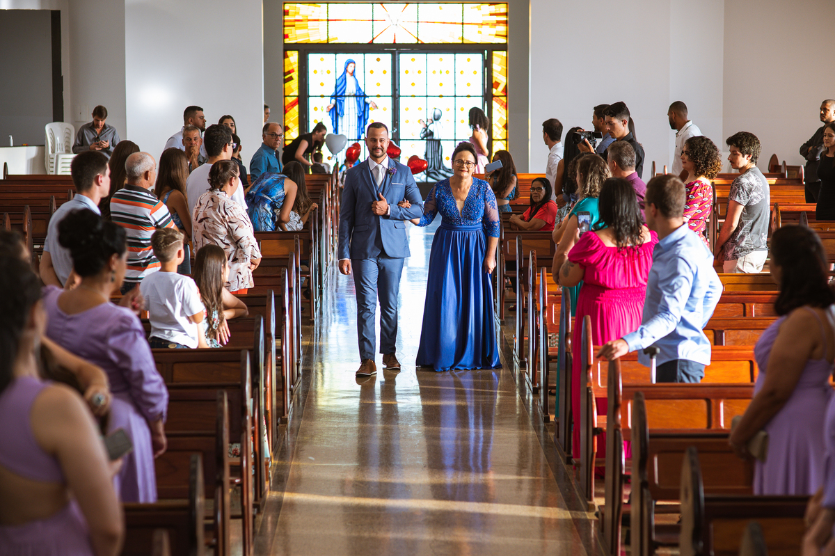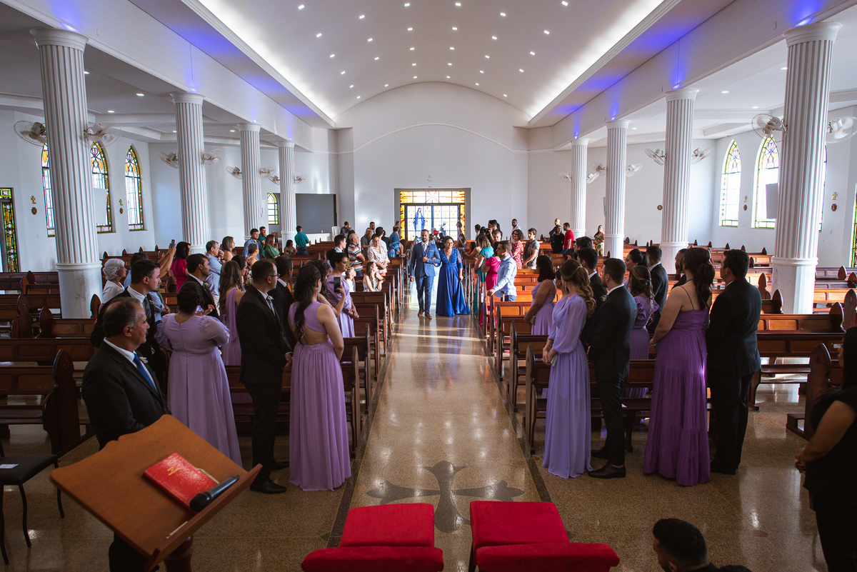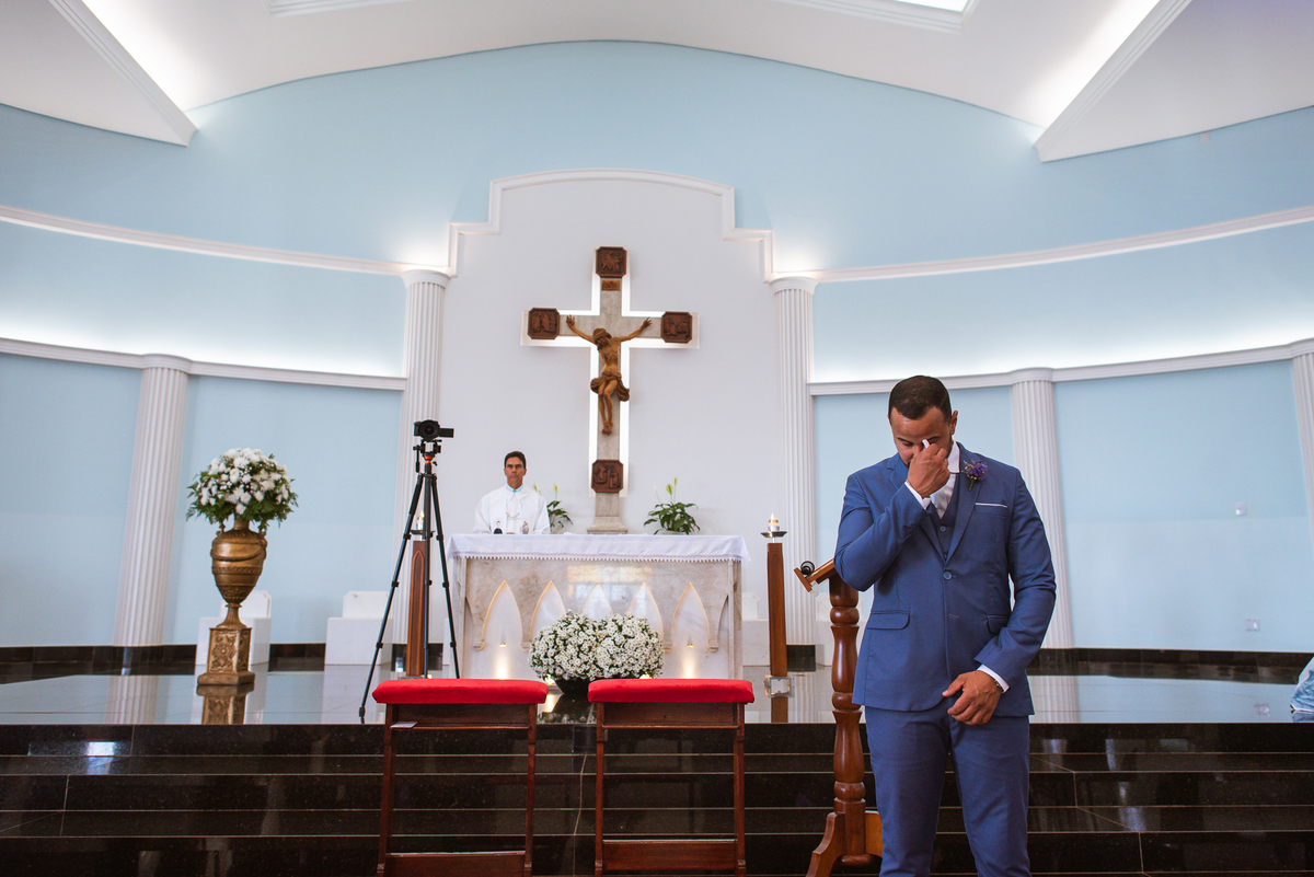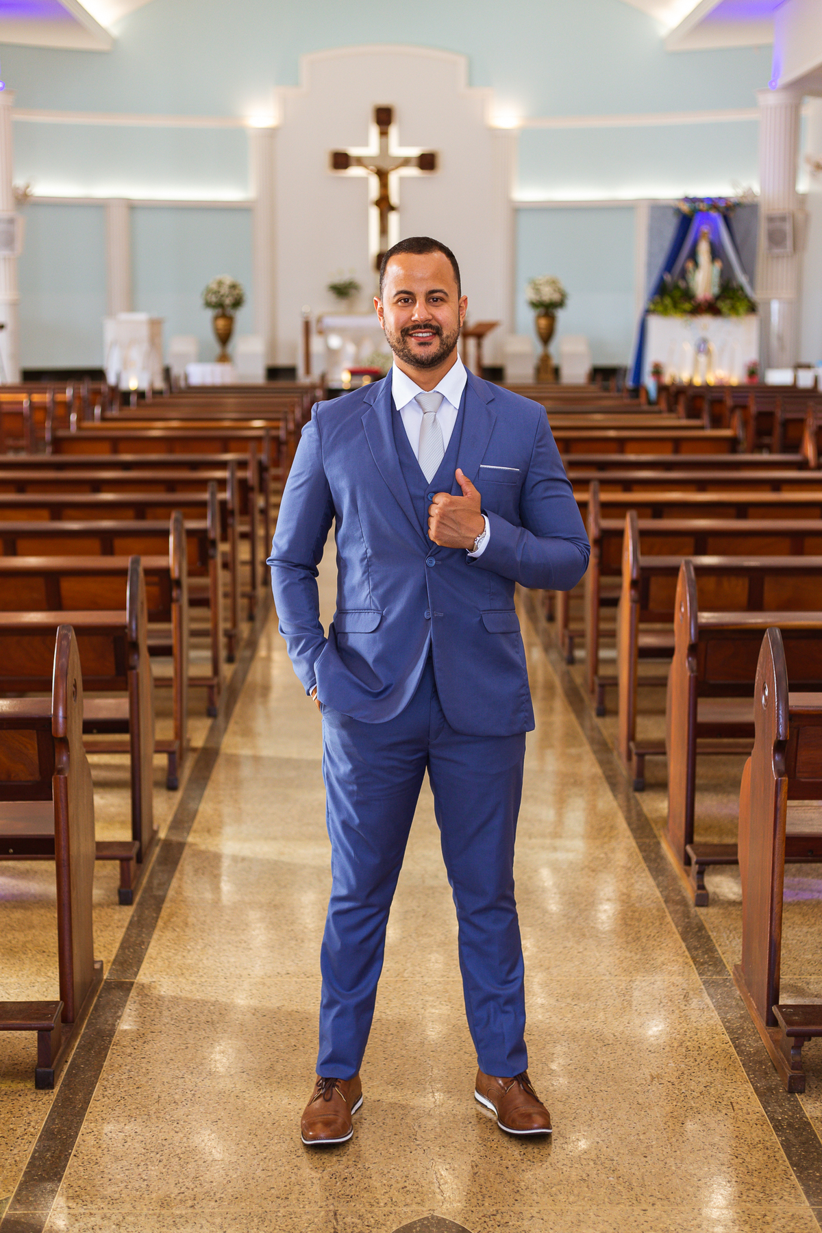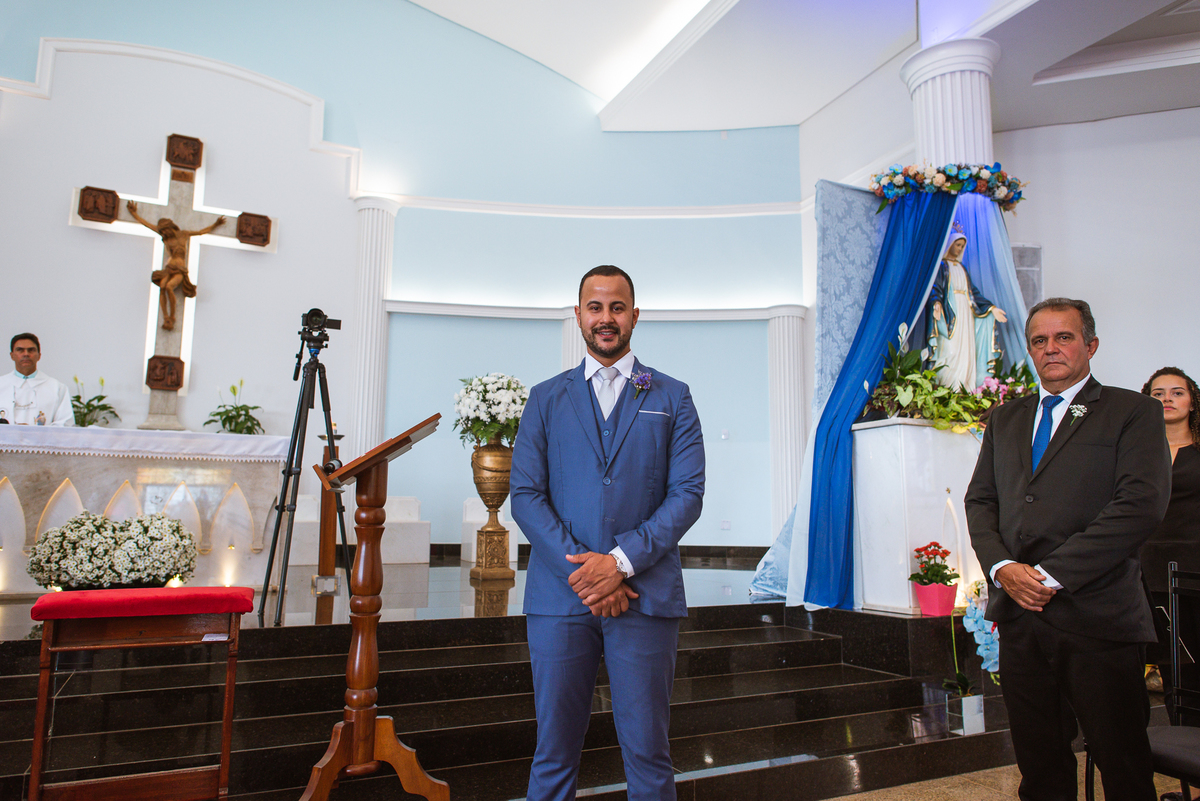 Enquanto Isabella estava lá no salão se preparando, Luiz preferiu ficar em casa mesmo, se organizando e se vestindo rapidamente para ir pra Igreja. E por falar nisso, que Igreja maravilhosa que eles escolheram. A Igreja da Medalha Milagrosa que fica no bairro Caramuru,. escondidinha em meio às casas mas que mostra toda sua imponência e beleza quando chegamos na rua onde ela fica. De cara, uma torre maravilhosa e portas com vitrais sacros que nos convidam a entrar. Já na porta, o noivo e seus convidados se alinhavam para o início da celebração. Luiz cumprimentou seus amigos e padrinhos e aguardava ansiosamente pela chegada de sua noiva.