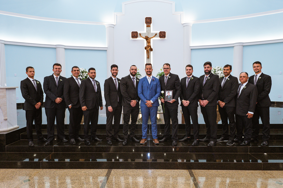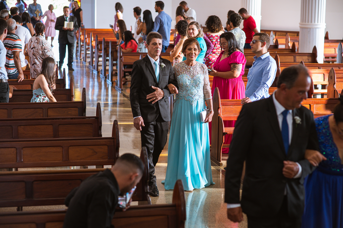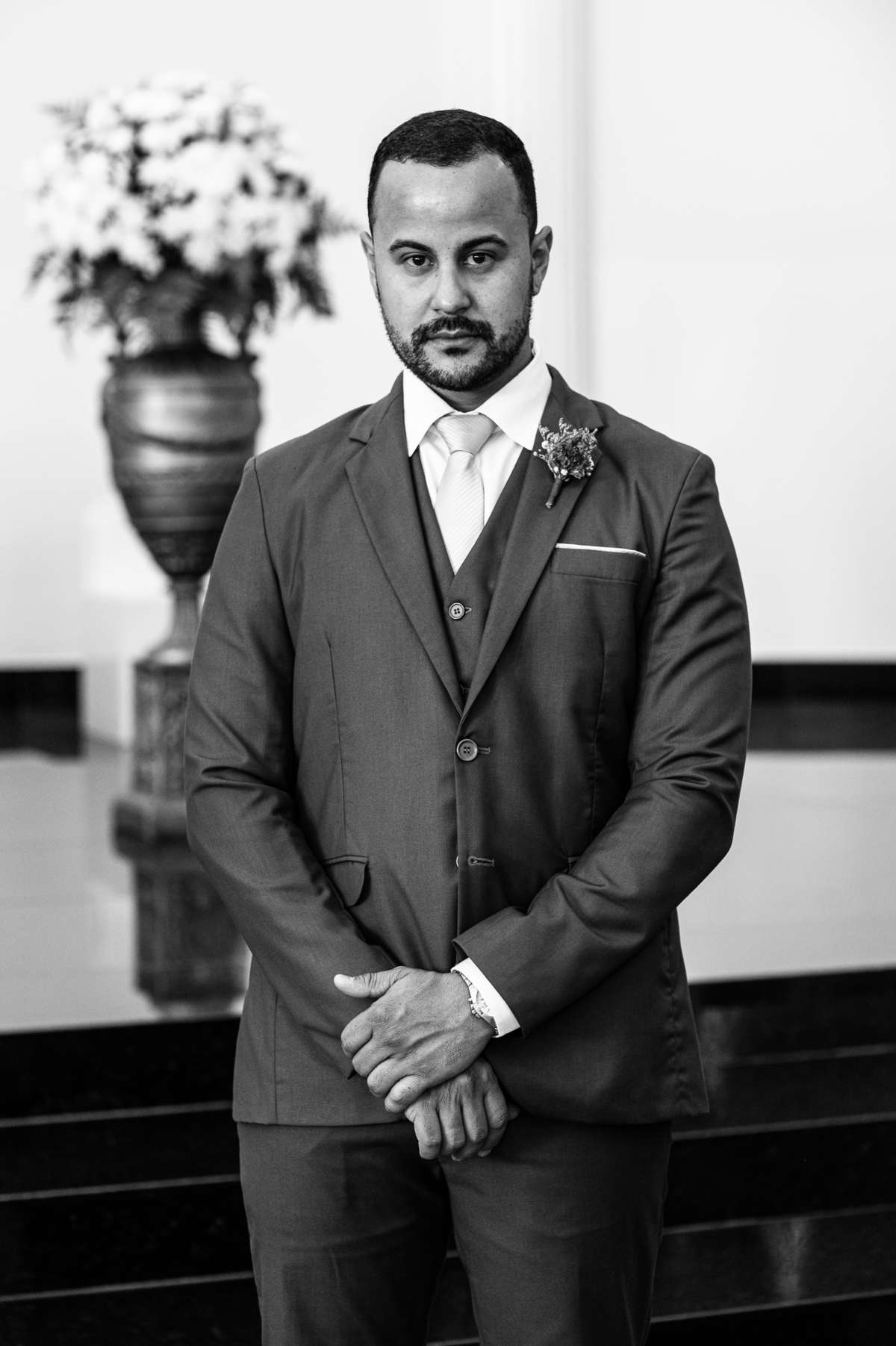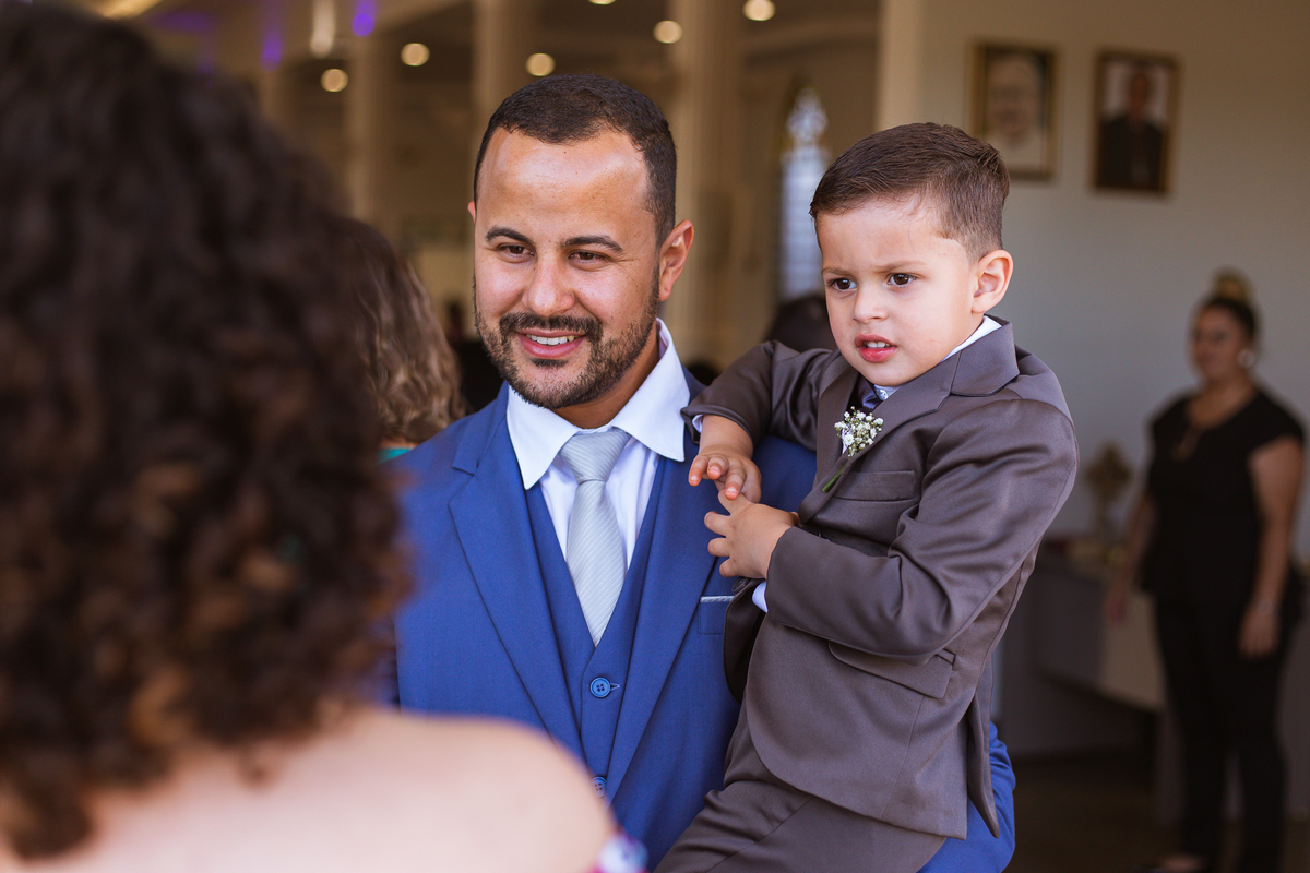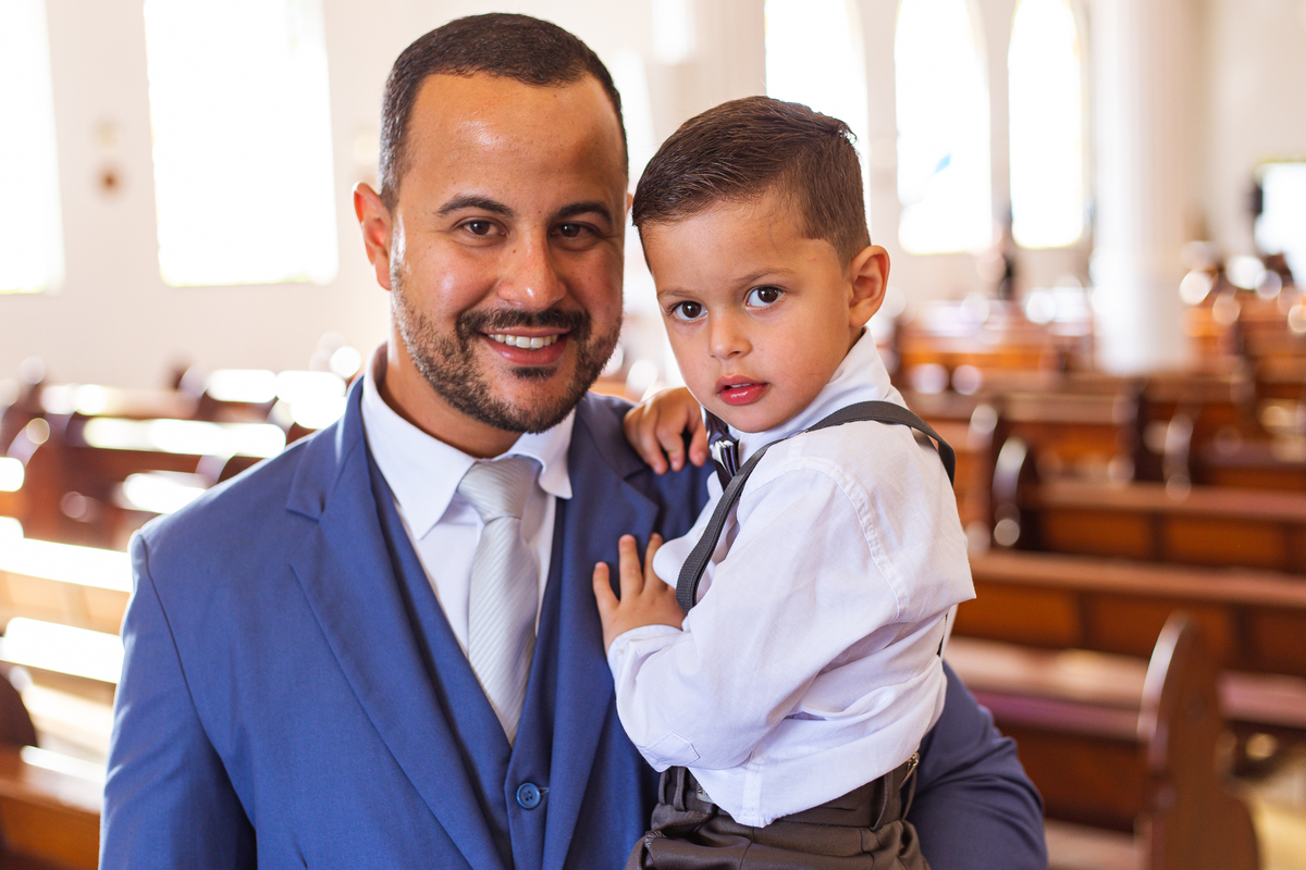 Enquanto Isabella estava lá no salão se preparando, Luiz preferiu ficar em casa mesmo, se organizando e se vestindo rapidamente para ir pra Igreja. E por falar nisso, que Igreja maravilhosa que eles escolheram. A Igreja da Medalha Milagrosa que fica no bairro Caramuru,. escondidinha em meio às casas mas que mostra toda sua imponência e beleza quando chegamos na rua onde ela fica. De cara, uma torre maravilhosa e portas com vitrais sacros que nos convidam a entrar. Já na porta, o noivo e seus convidados se alinhavam para o início da celebração. Luiz cumprimentou seus amigos e padrinhos e aguardava ansiosamente pela chegada de sua noiva.