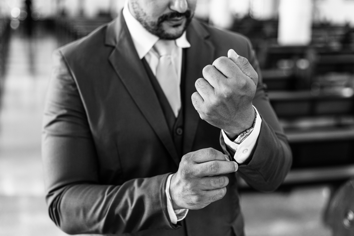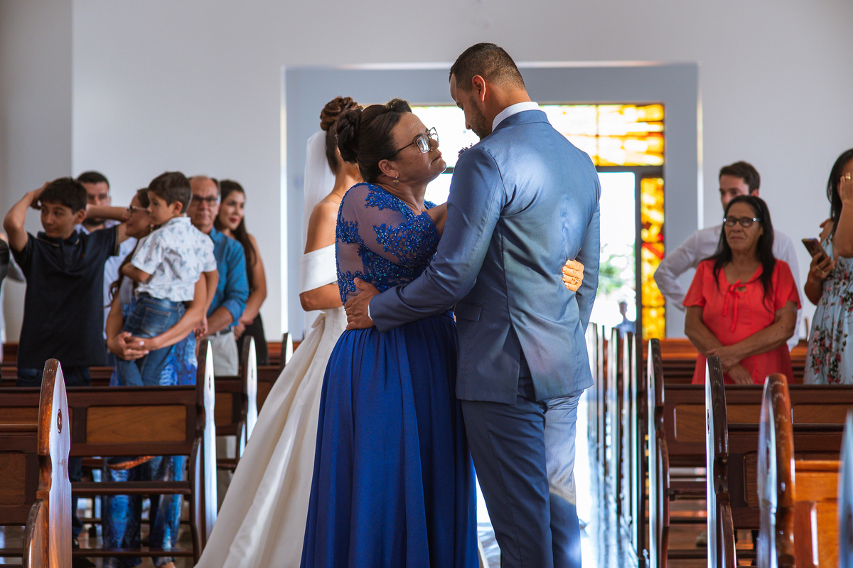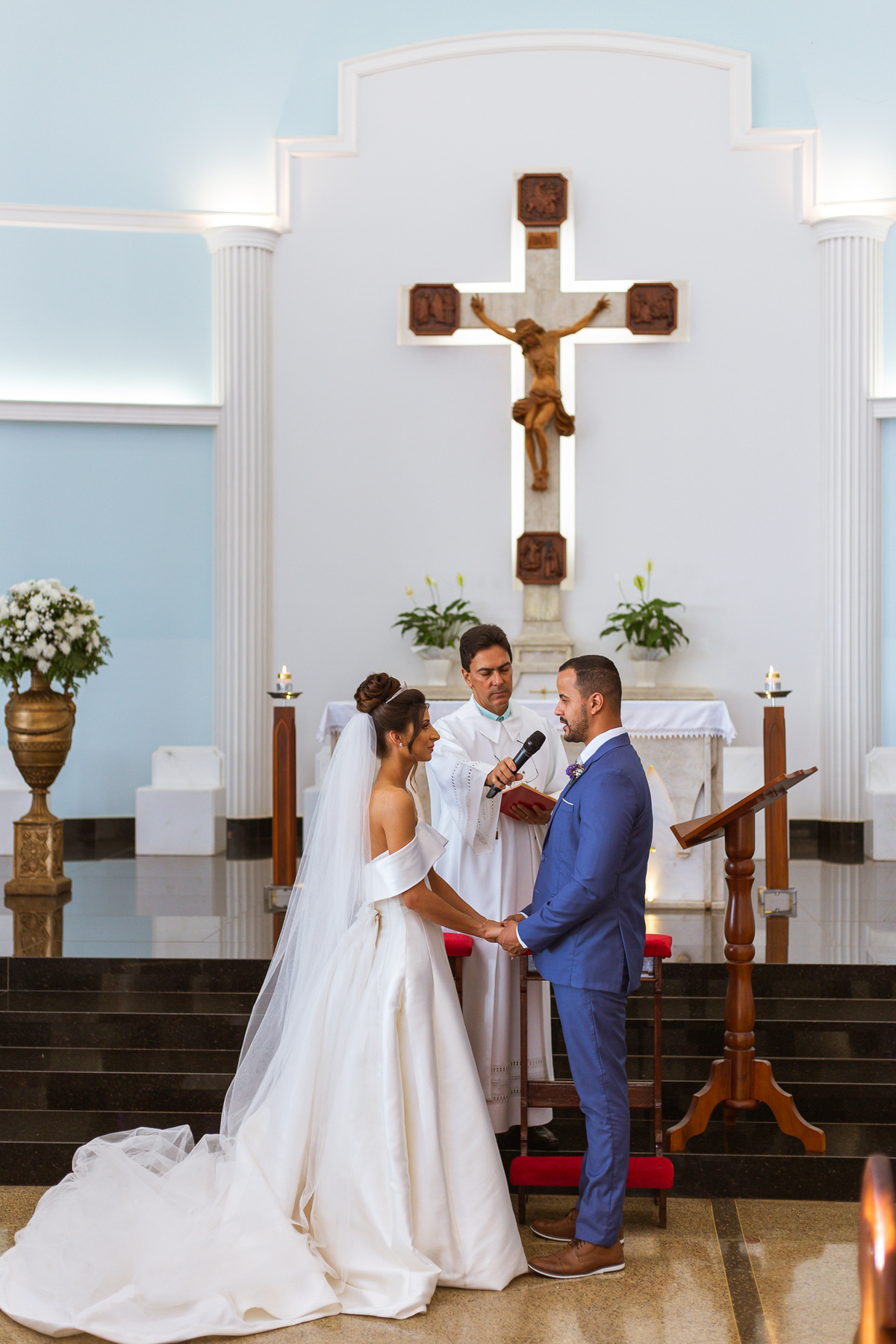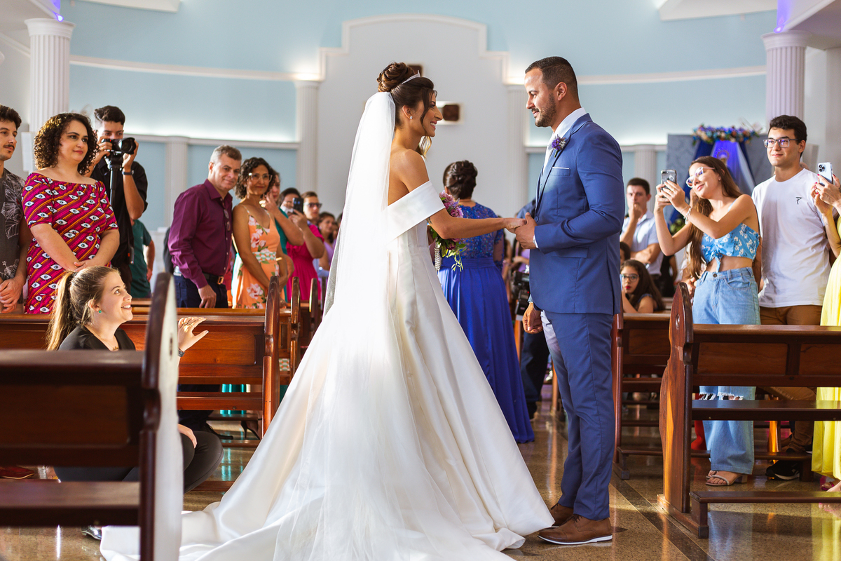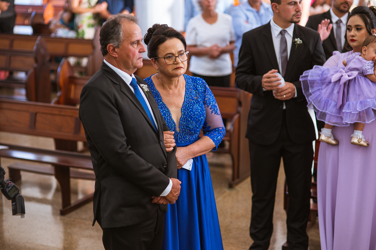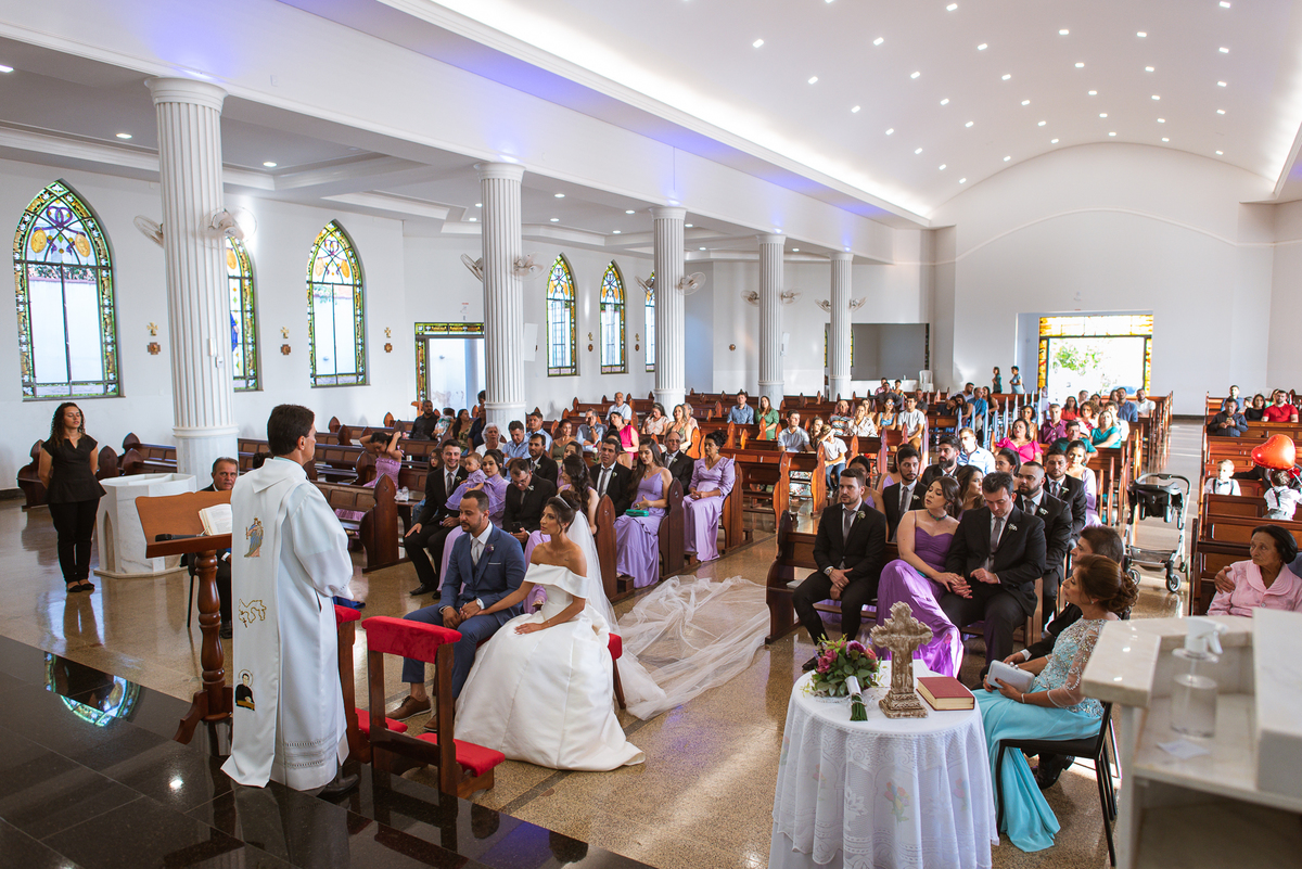 Enquanto Isabella estava lá no salão se preparando, Luiz preferiu ficar em casa mesmo, se organizando e se vestindo rapidamente para ir pra Igreja. E por falar nisso, que Igreja maravilhosa que eles escolheram. A Igreja da Medalha Milagrosa que fica no bairro Caramuru,. escondidinha em meio às casas mas que mostra toda sua imponência e beleza quando chegamos na rua onde ela fica. De cara, uma torre maravilhosa e portas com vitrais sacros que nos convidam a entrar. Já na porta, o noivo e seus convidados se alinhavam para o início da celebração. Luiz cumprimentou seus amigos e padrinhos e aguardava ansiosamente pela chegada de sua noiva.