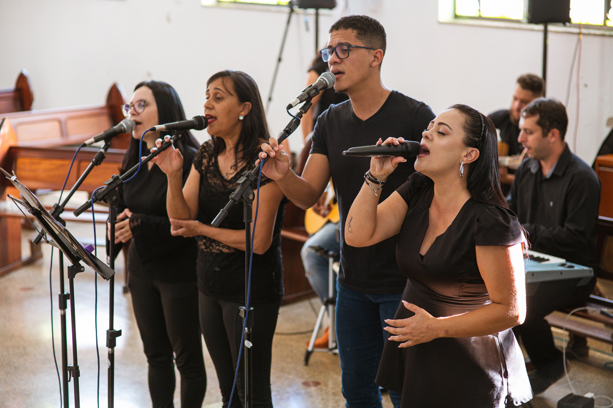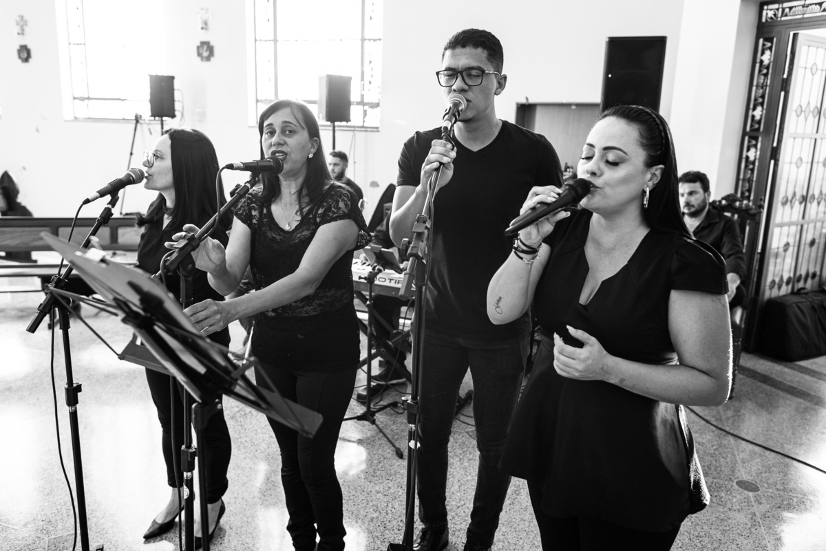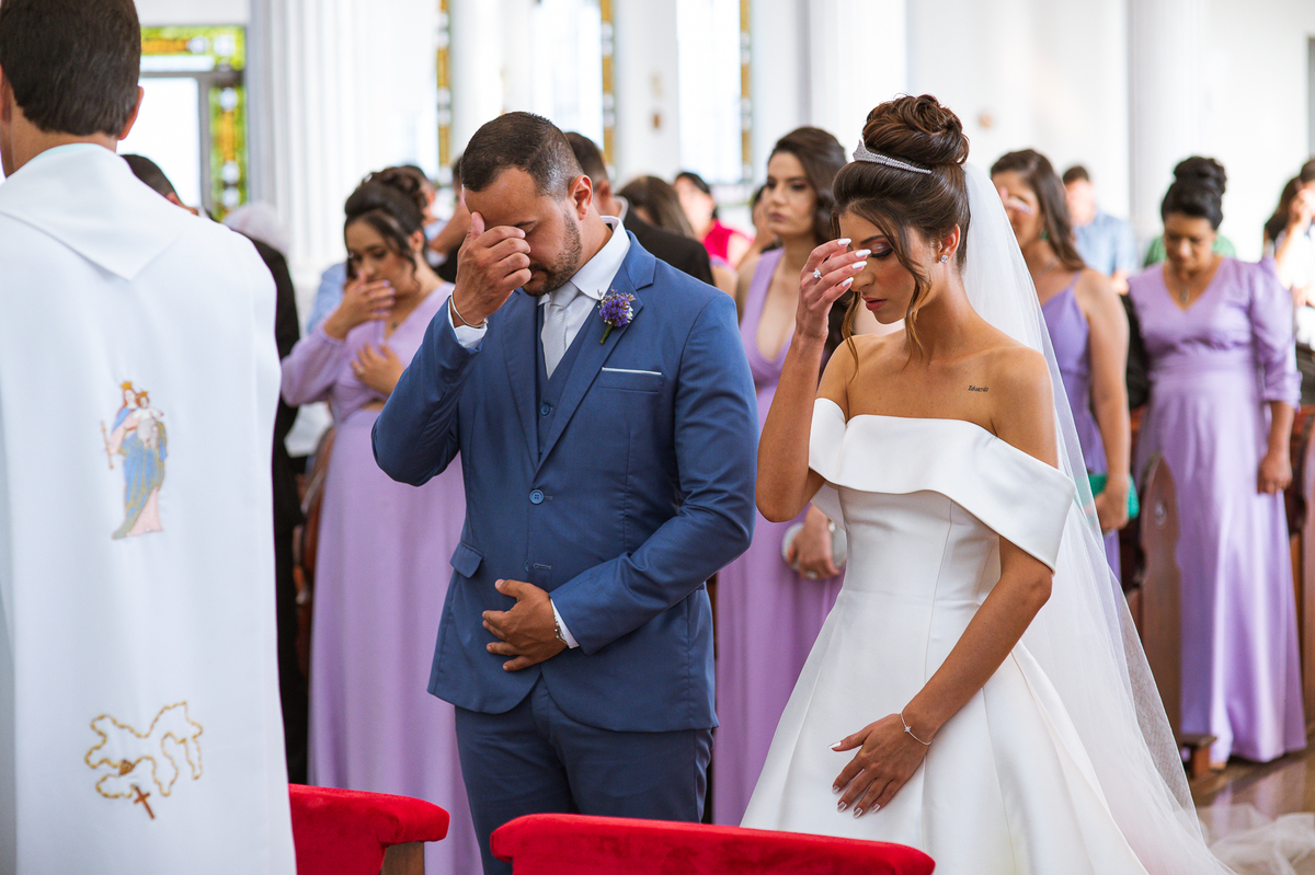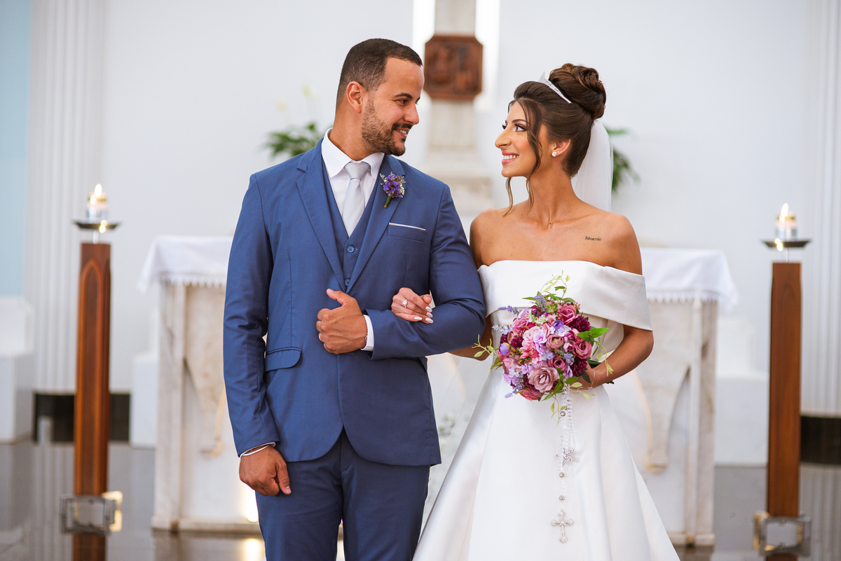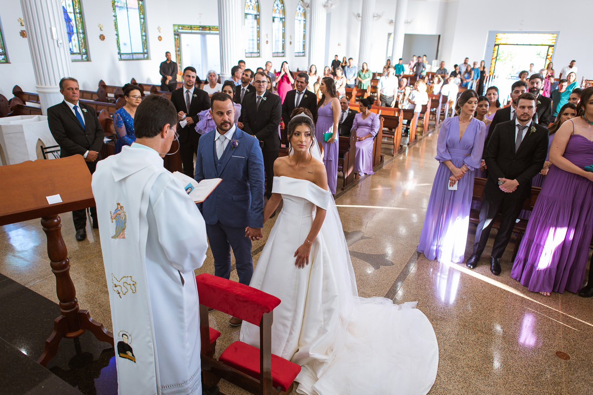 Enquanto Isabella estava lá no salão se preparando, Luiz preferiu ficar em casa mesmo, se organizando e se vestindo rapidamente para ir pra Igreja. E por falar nisso, que Igreja maravilhosa que eles escolheram. A Igreja da Medalha Milagrosa que fica no bairro Caramuru,. escondidinha em meio às casas mas que mostra toda sua imponência e beleza quando chegamos na rua onde ela fica. De cara, uma torre maravilhosa e portas com vitrais sacros que nos convidam a entrar. Já na porta, o noivo e seus convidados se alinhavam para o início da celebração. Luiz cumprimentou seus amigos e padrinhos e aguardava ansiosamente pela chegada de sua noiva.