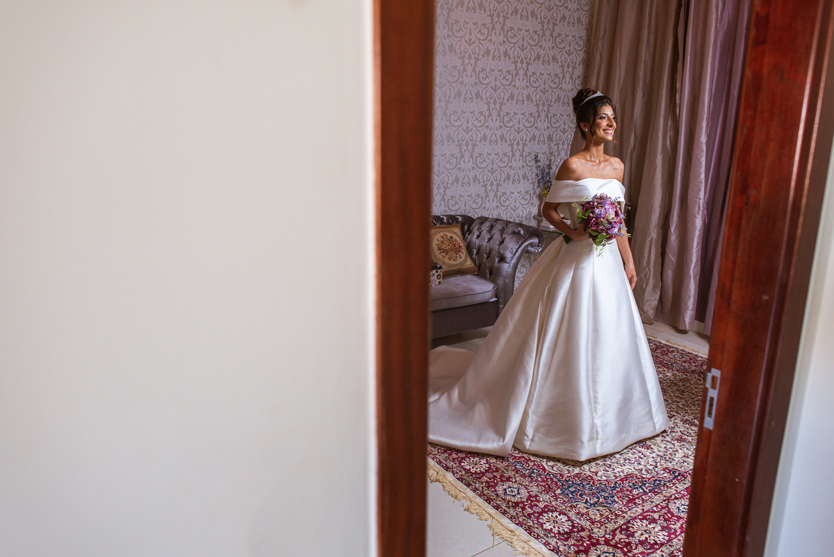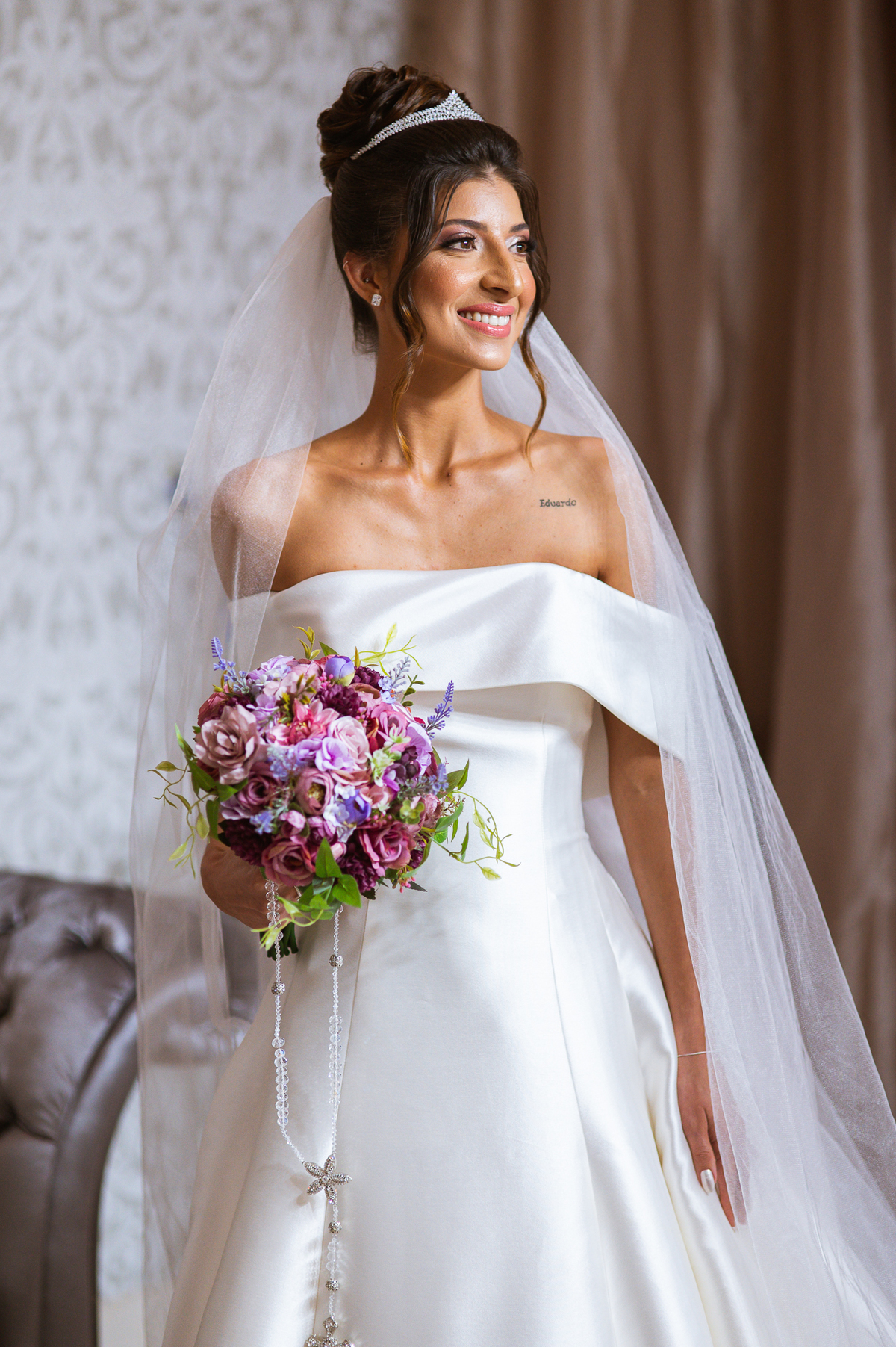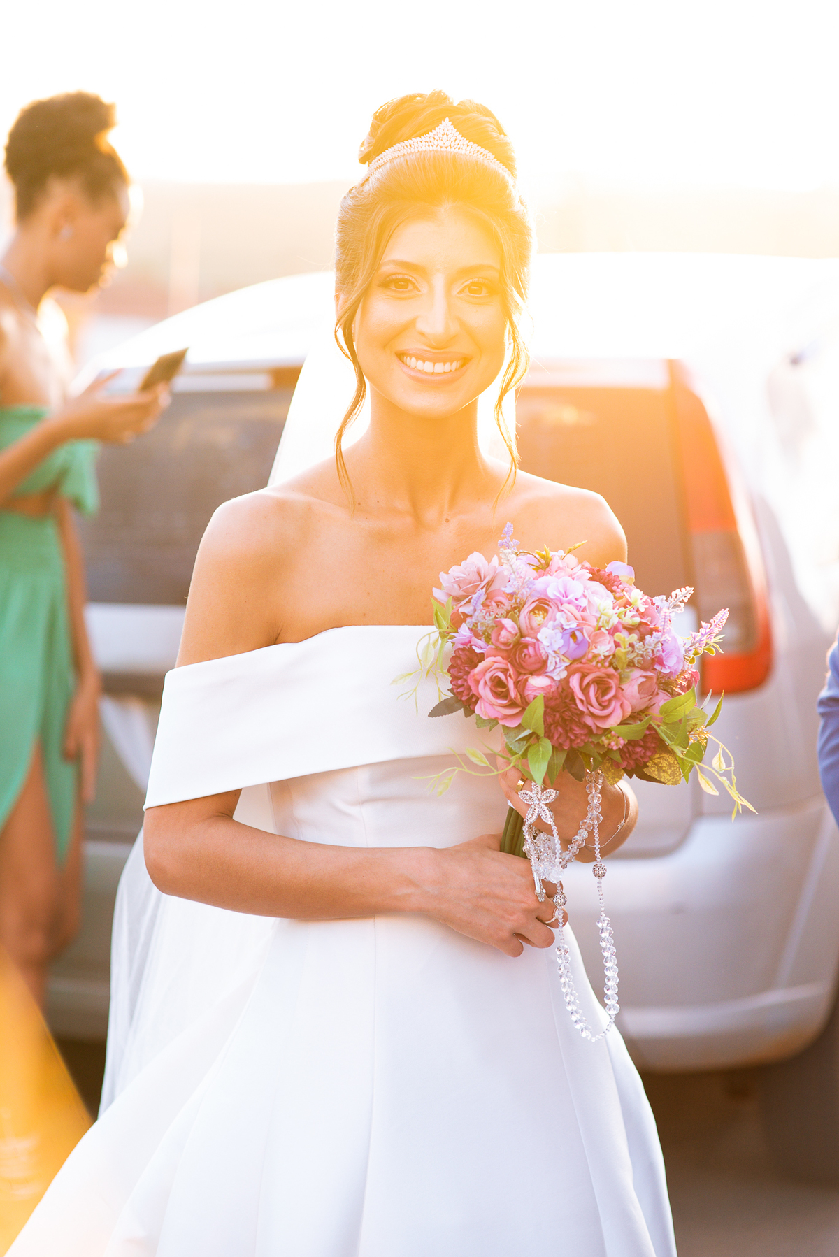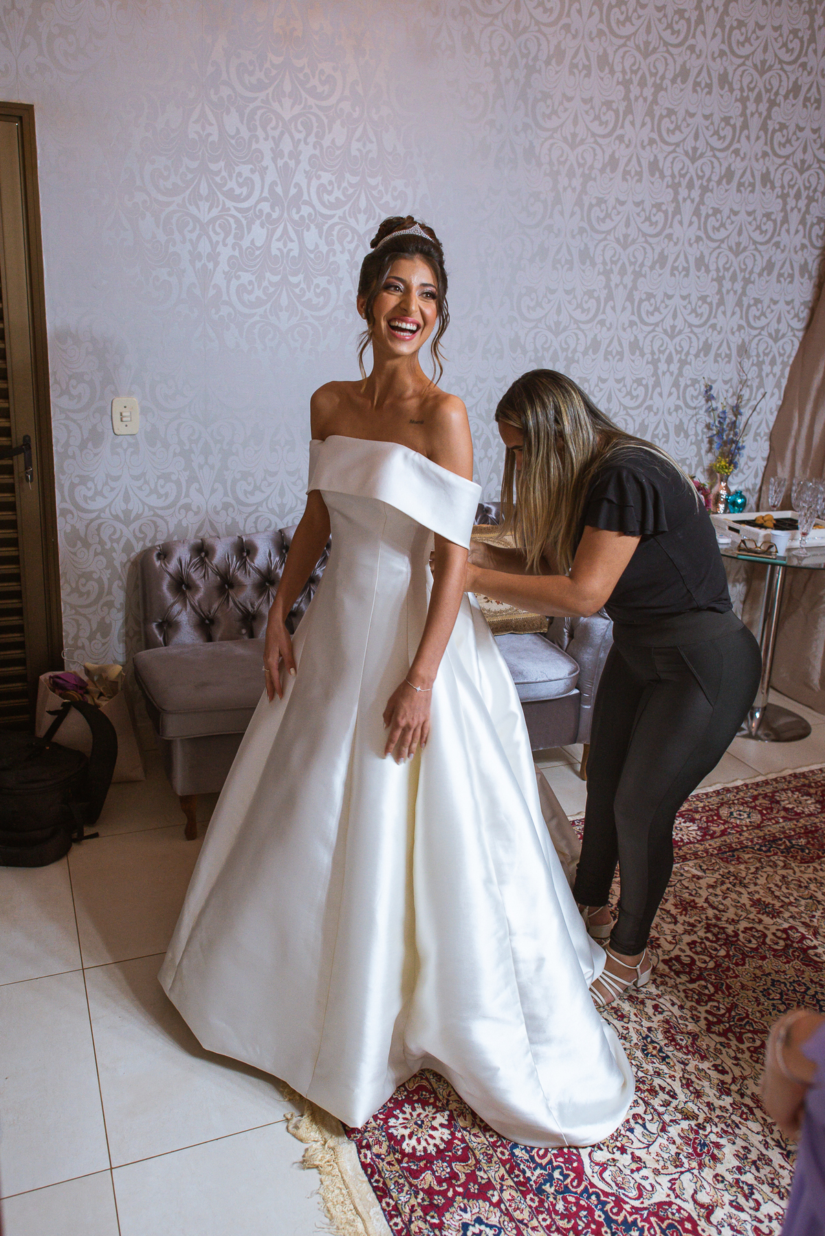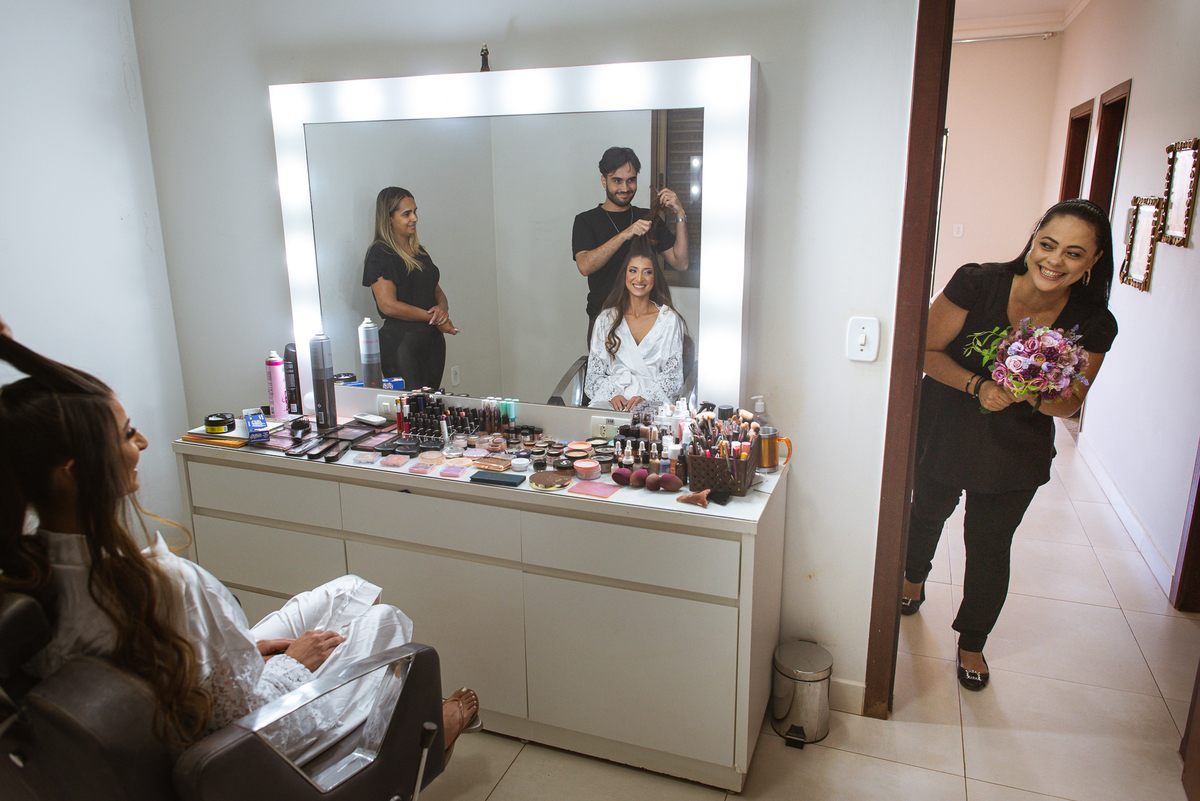 A cerimonialista Daniana, do Magnificat Cerimonial chegou toda sorridente e com o buquê da noiva em mãos. Detrás da porta, ela avisou que estava lindo e qual seria a ansiedade da noiva sobre esse buquê. Lembro direitinho que Isabella estava preparando o penteado, com a cabeça meio pra baixo por conta do cabelo e em meio ao processo ela veio com um sorriso encantador e sincero. Com as duas mãos, ela puxou duas mexas que a atrapalhavam ela contemplar a beleza do seu buquê, e assim sim o sorriso ficou ainda maior. Daniana confirmou que tudo estava organizado, o horário estava tranquilo e que ela poderia descansar e finalizar sua produção com toda tranquilidade...