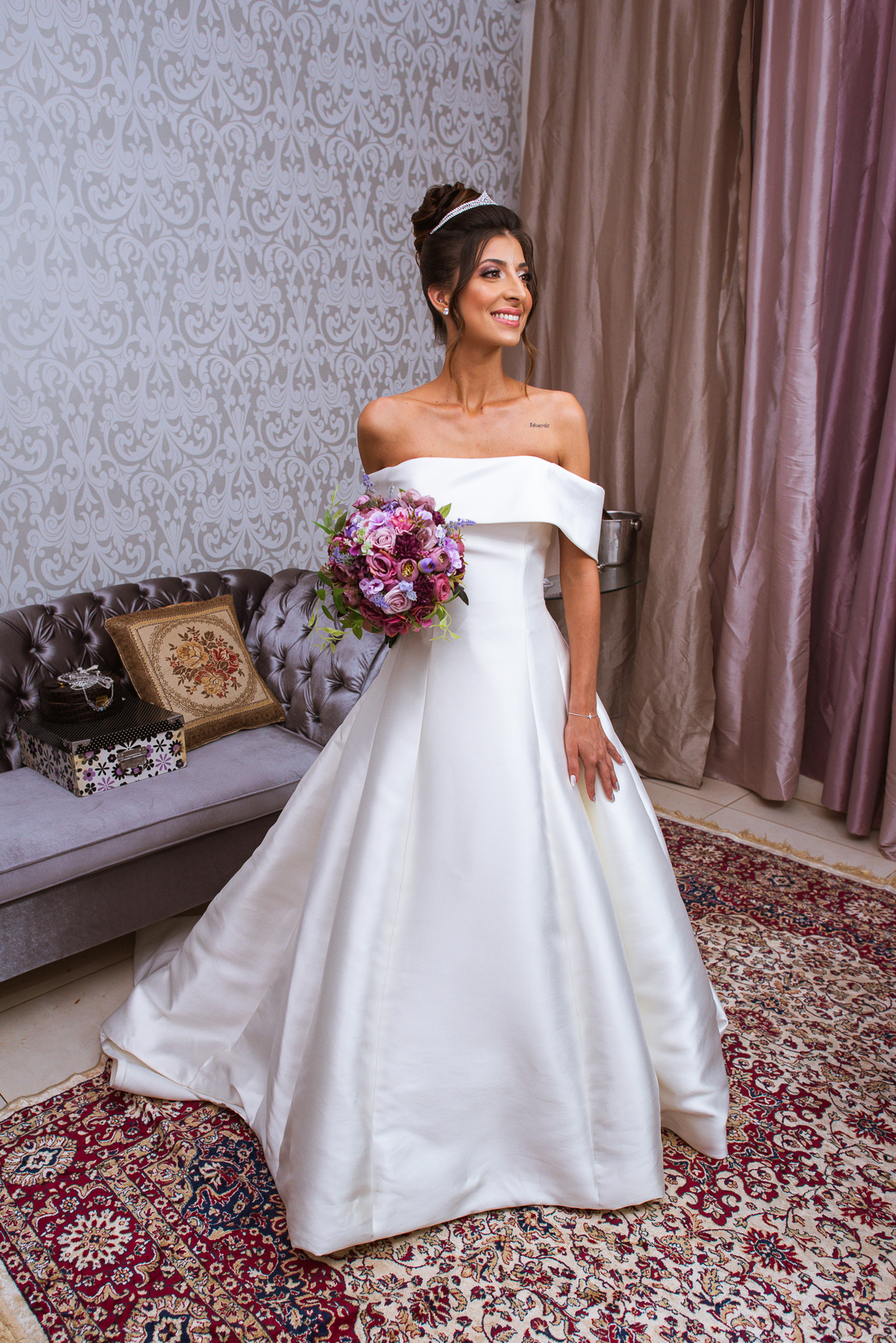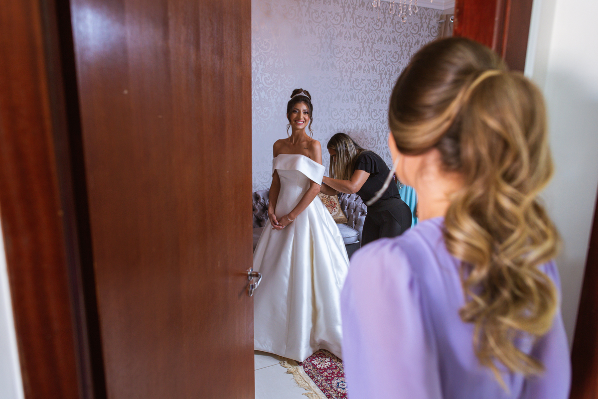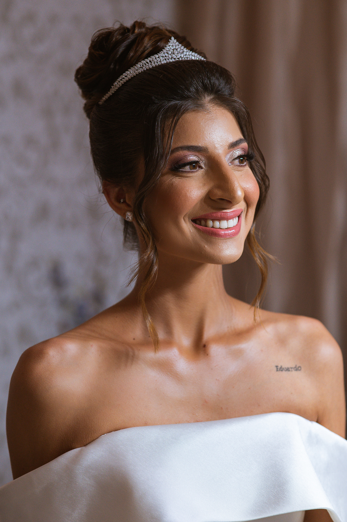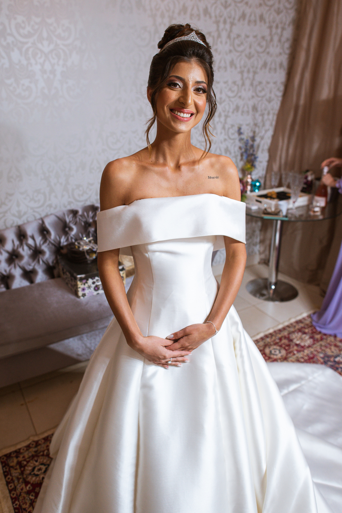 Lá no salão, Isabella estava finalizando a sua produção. Nos retiramos da sala para que ela pudesse colocar seu vestido. Quando abriram a porta novamente, todos ficamos atônitos com tamanha beleza. Aquele conjunto havia ficado tão lindo que não esperávamos que ficasse tão perfeito como ficou. Sabíamos que ficaria lindo, mas ao vê-la completamente pronta e vestida de noiva nos fez arregalar os olhos e surpreender com tanta beleza reunida. Sua irmã também ficou boquiaberta com aquela cena maravilhosa que vimos juntos. Tratamos de fazer muitas fotos com todos os acessórios que havia ali. Após colocar o seu véu que foi a cereja do bolo, finalizamos o making of e partimos para a Igreja.