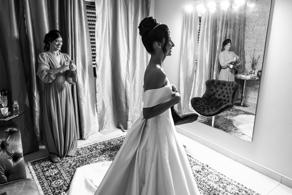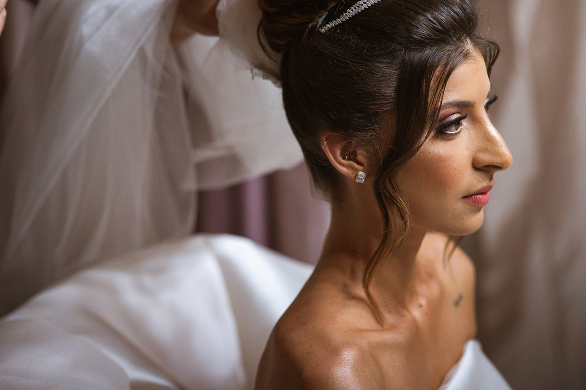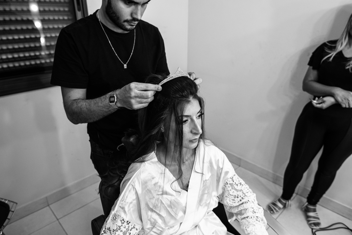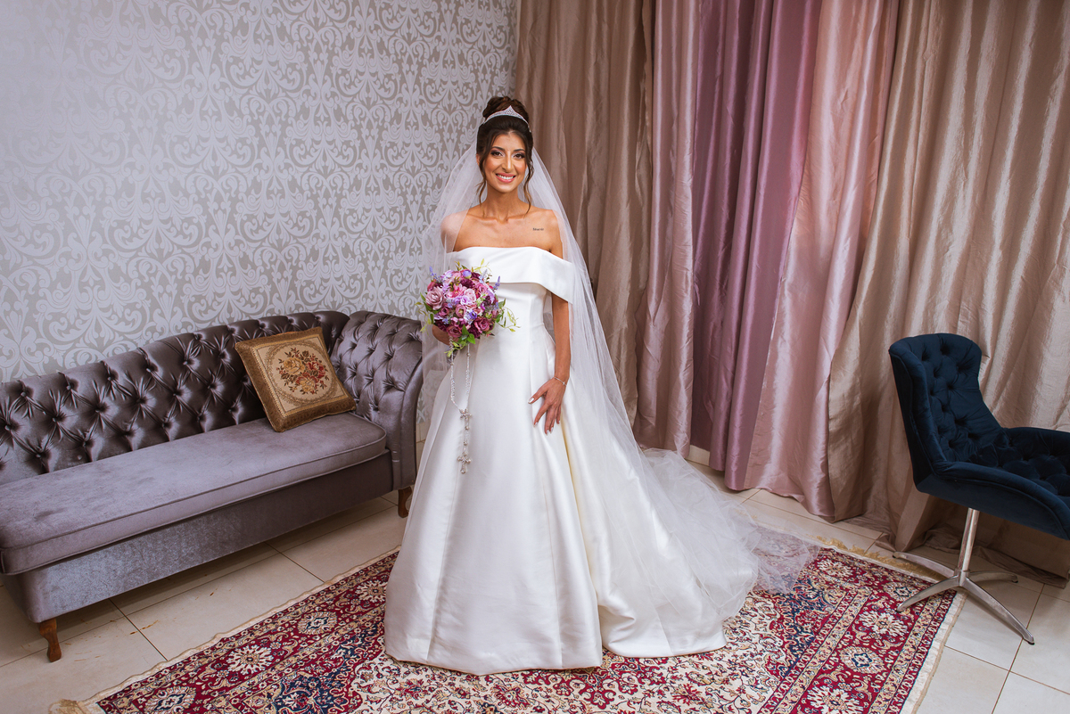 Lá no salão, Isabella estava finalizando a sua produção. Nos retiramos da sala para que ela pudesse colocar seu vestido. Quando abriram a porta novamente, todos ficamos atônitos com tamanha beleza. Aquele conjunto havia ficado tão lindo que não esperávamos que ficasse tão perfeito como ficou. Sabíamos que ficaria lindo, mas ao vê-la completamente pronta e vestida de noiva nos fez arregalar os olhos e surpreender com tanta beleza reunida. Sua irmã também ficou boquiaberta com aquela cena maravilhosa que vimos juntos. Tratamos de fazer muitas fotos com todos os acessórios que havia ali. Após colocar o seu véu que foi a cereja do bolo, finalizamos o making of e partimos para a Igreja.