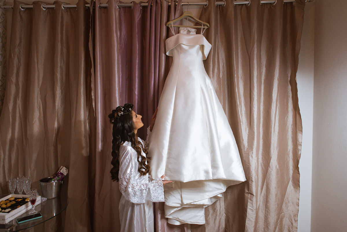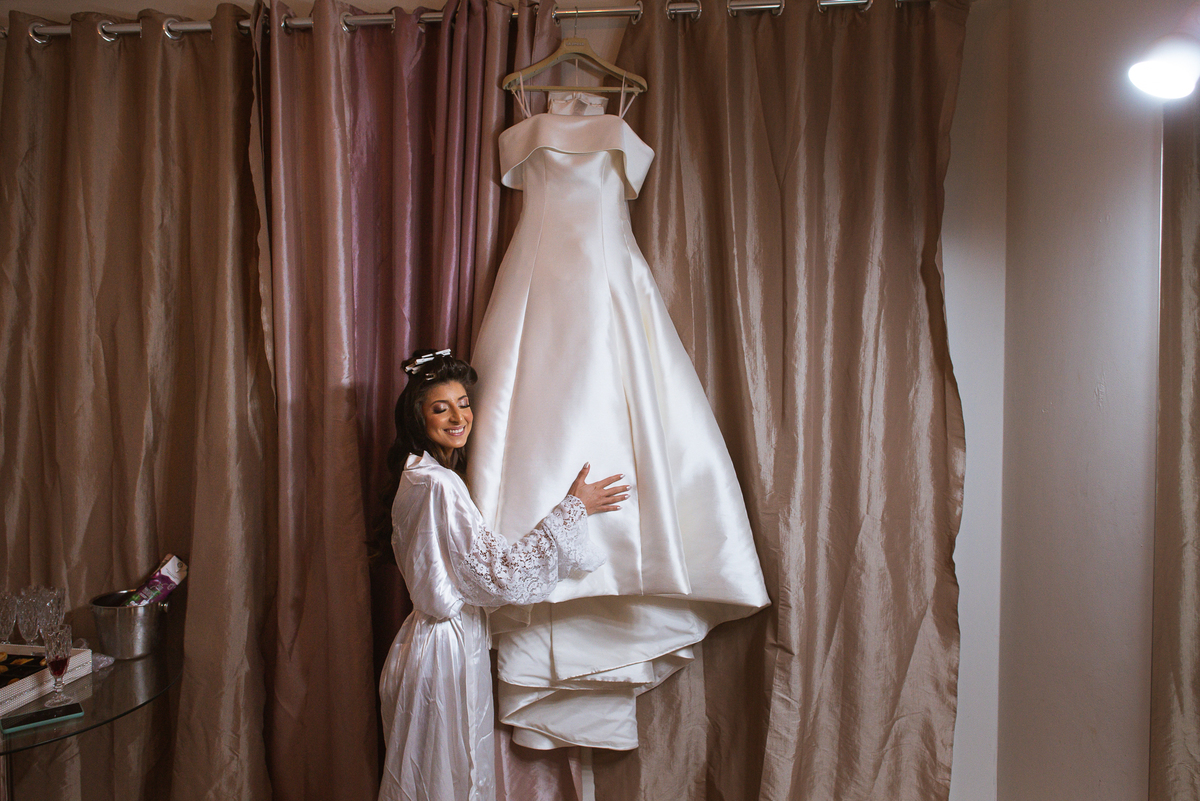 O vestido maravilhoso ainda estava guardado, até que eu solicitei à ela que me mostrasse onde ele estava. Precisava fazer as fotos com ele, claro. Quando tirei o vestido de sua capa, veio aquela surpresa maravilhosa... Que vestido meus amigos. Mas também, esperar o que da assinatura do Espaço WM? Só poderia vir algo sensacional mesmo. Fiquei imaginando o quanto esse vestido ficaria espetacular e sobre como Isabella ficaria impecável nesse traje. Enquanto pensava, fomos fazendo várias fotos, com a mamãe, irmã e com seus acessórios lindos que compunham a cena. A madeixas da noiva iam sendo modeladas e os minutos passando lentamente até aquele momento.