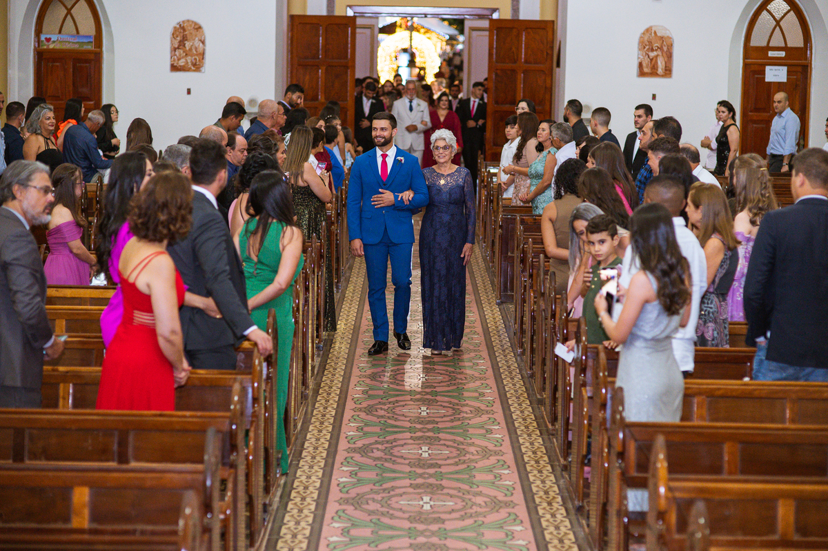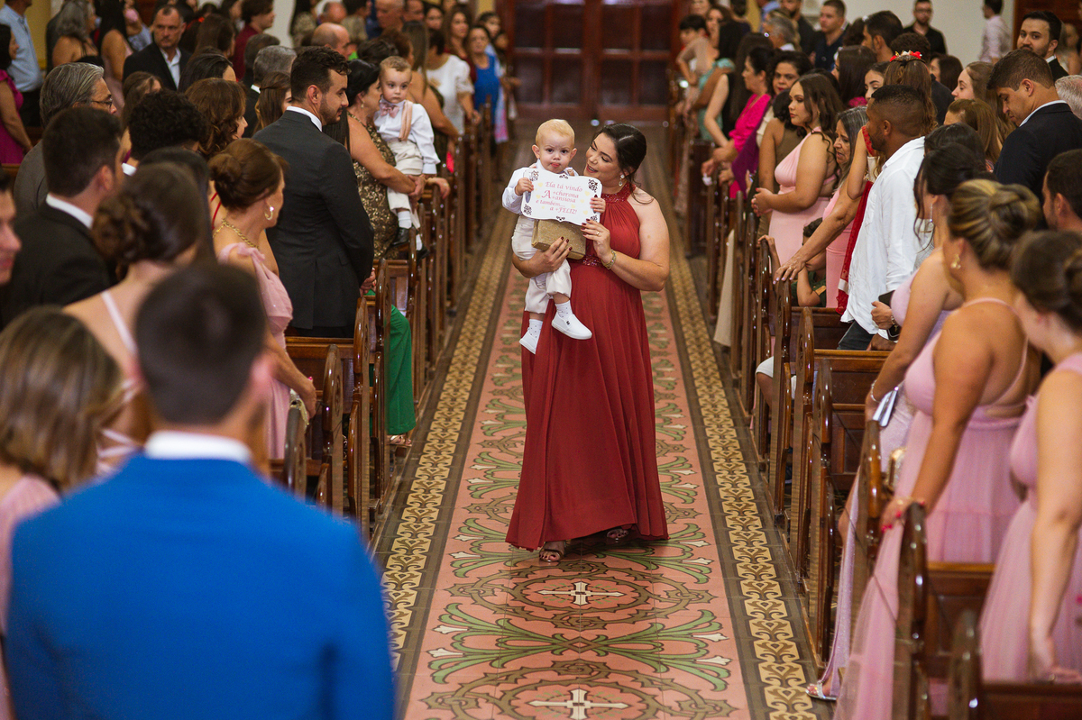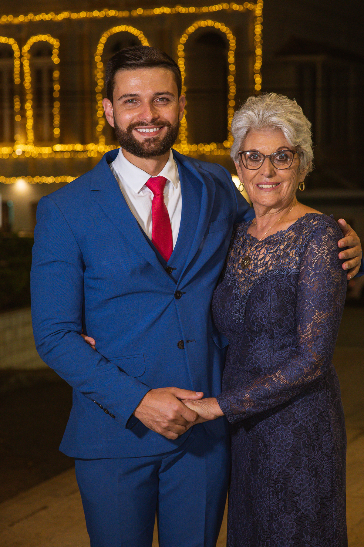 Depois desse momento maravilhoso, a noiva retocou sua make e partimos para a cerimônia. A Igreja escolhida pelos noivos é a belíssima Catedral de Santo Antônio de Pádua, nossa matriz. A praça da Getúlio Vargas estava tomada pelas pessoas e pela iluminação de natal. Tudo estava maravilhoso e enchia os olhos. Chegando na porta, me deparo com o noivo e sua mãe, registrei um abraço carinhoso e um beijo respeitoso entre os dois. Todos estavam prontos para que a cerimônia se iniciasse. Padrinhos todos alinhados, músicos prontos e fotógrafo posicionado. Tudo pronto. Fizemos as tradicionais fotografias no carro e parti para o altar. O padre já estava pronto e a celebração teve seu início.