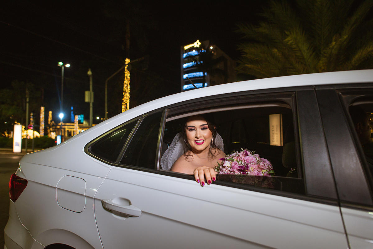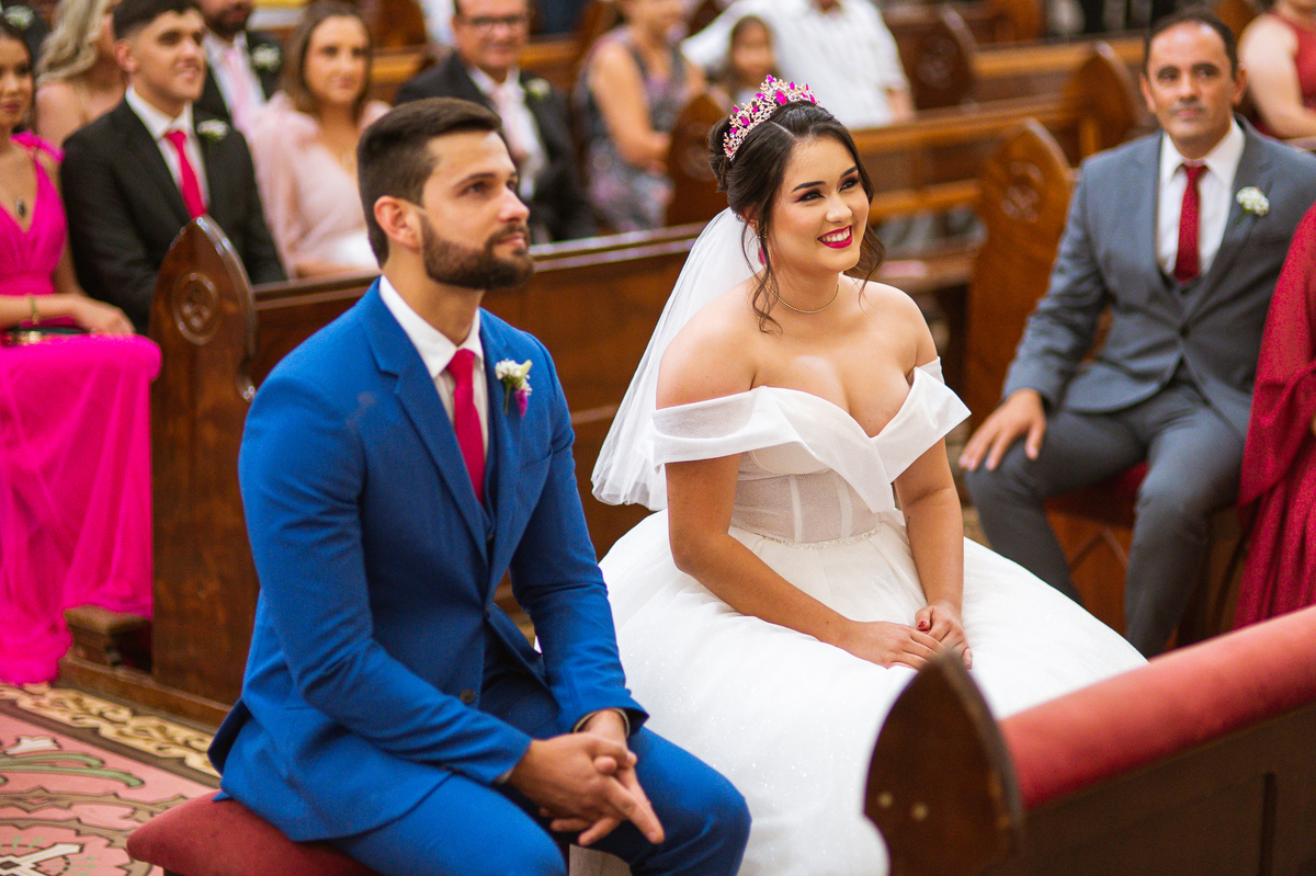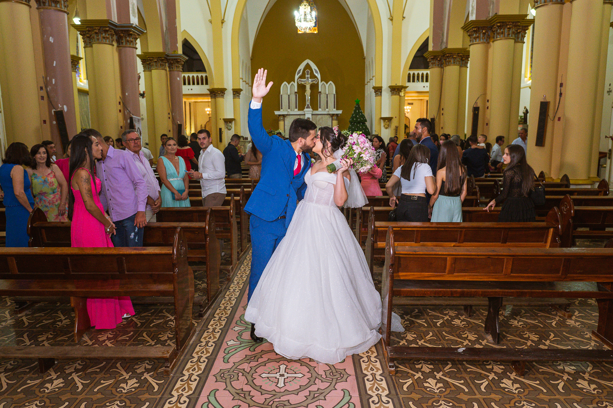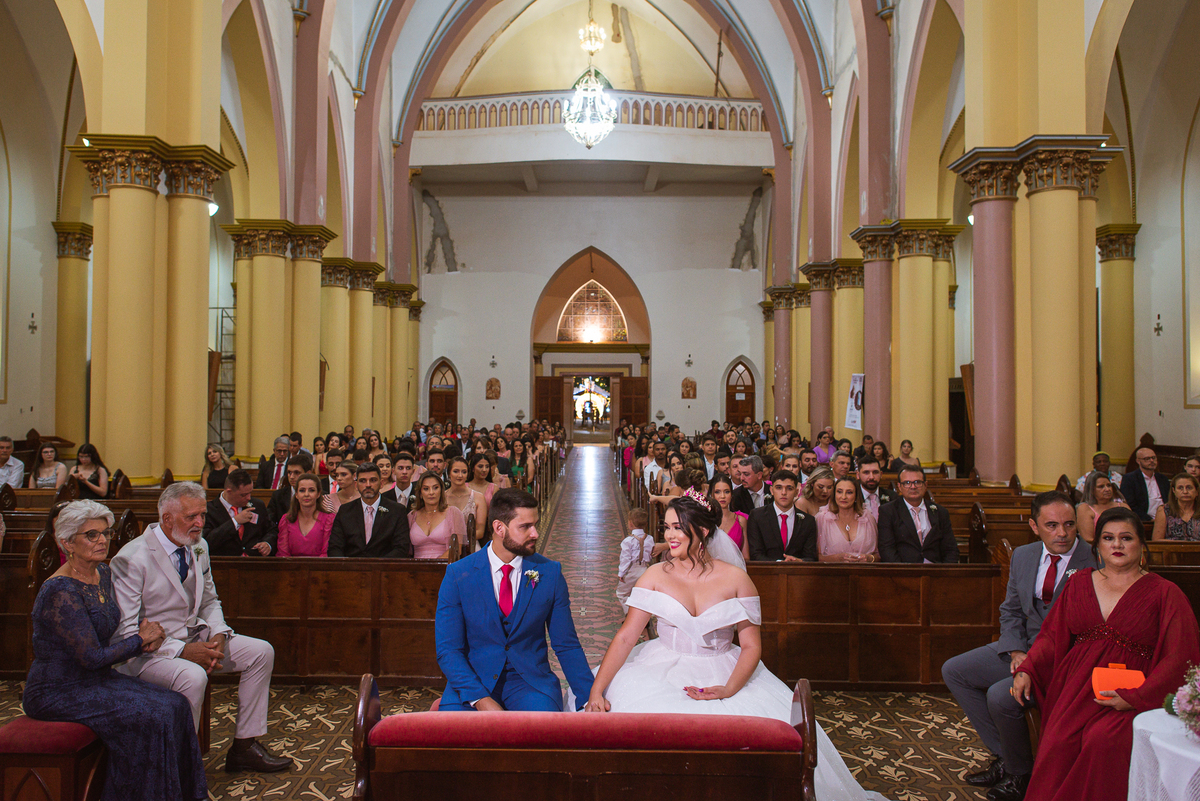 Depois desse momento maravilhoso, a noiva retocou sua make e partimos para a cerimônia. A Igreja escolhida pelos noivos é a belíssima Catedral de Santo Antônio de Pádua, nossa matriz. A praça da Getúlio Vargas estava tomada pelas pessoas e pela iluminação de natal. Tudo estava maravilhoso e enchia os olhos. Chegando na porta, me deparo com o noivo e sua mãe, registrei um abraço carinhoso e um beijo respeitoso entre os dois. Todos estavam prontos para que a cerimônia se iniciasse. Padrinhos todos alinhados, músicos prontos e fotógrafo posicionado. Tudo pronto. Fizemos as tradicionais fotografias no carro e parti para o altar. O padre já estava pronto e a celebração teve seu início.