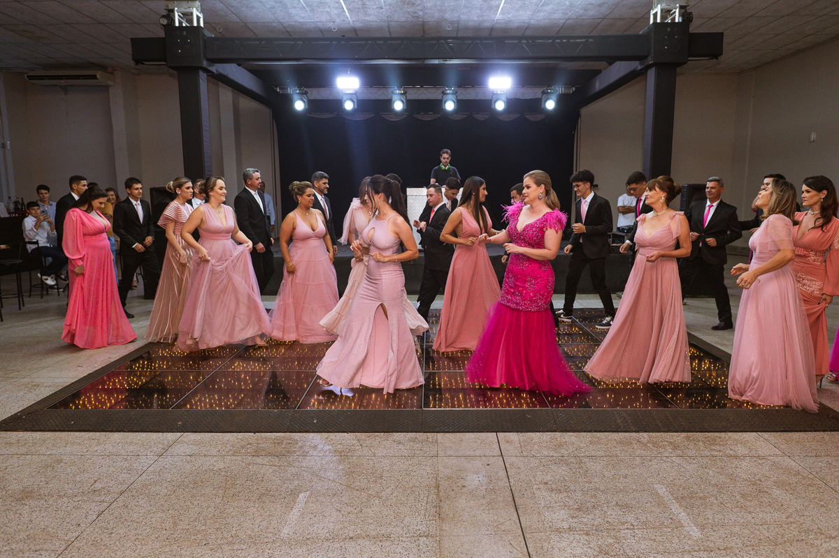 Maria Clara e João já aguardavam o início da recepção e os padrinhos já se posicionaram para iniciar a entrada e dança. Cada um entrou com seu par e na pista de dança eles realizaram uma dança toda planejada só para recepcionar o novo casal. Assim que finalizaram, era a vez de receber os recém-casados. Eles caminharam em meio aos aplausos e claro, não poderiam deixar de fazer uma dança toda especial, pois a dança está no sangue da noiva que é bailarina. Fizeram uma apresentação de tirar o fôlego e logo após fizemos as fotos com as madrinhas e padrinhos. No bolo, fizemos as fotos do brinde e liberamos os dois para curtir a noite que só estava começando. Ao som do sanfoneiro e cantor Angelo Oliveira, eles dançaram e festejaram muito. Inclusive preciso deixar registrado aqui que a foto lá em baixo de um pano rasgado é a cueca do noivo ok? Sim, a gravata rendeu tanto que conseguiram destruir a cueca dele.