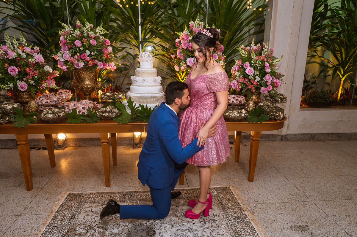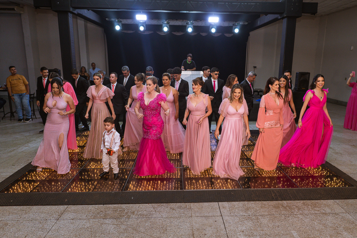 O Padre os recebeu carinhosamente, e realizou uma celebração inesquecível. Os noivos receberam a palavra, foram abençoados pelos seus pais e pelo Padre e trocaram as alianças. Os dois fizeram seus votos e foram declarados casados perante Deus e as testemunhas. Fizemos as fotos de praxe, com todos os padrinhos e familiares e a saída dos recém-casados. Do lado de fora da Catedral, os padrinhos já aguardavam o casal com os Sparkles nas mãos. Os noivos saíram e foram recepcionados com muita festa pelos seus convidados. E de lá, partimos para a recepção. O local escolhidos pelos noivos para sua recepção foi o belíssimo e requintado House Fest. Chegando lá, a decoração já enchia os olhos dos convidados. A pista de dança já aguardava a chegada dos noivos e os padrinhos haviam preparado uma dança para realizar na entrada deles.