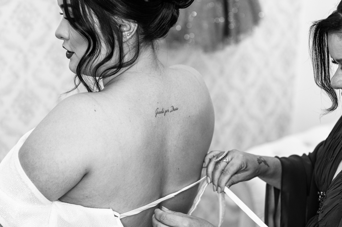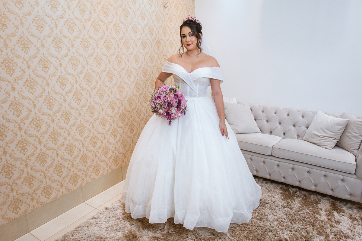 Do lado de cá, Clarinha me contou que ama a cor rosa. E não é brincadeira. O esmalte era rosa, sua coroa com pedras rosas, vestido da festa rosa e o mais legal de tudo é que a maquiadora dela se chama... Rosa! Quer coincidência maior do que essa? Nós brincamos lá que ela só fechou seu dia de noiva no salão porque era a Rosa que a produziria. Depois de muitas risadas e diversão, o tempo foi passando e as madrinhas foram aos poucos sendo liberadas. Fizemos várias fotos com todas elas e enfim, chegava a hora de a noiva colocar seu vestido. Dentro de alguns minutos, ela estava prontinha, vestida maravilhosamente com o seu vestido assinado pela Hermanas Noivas. Já nesse momento, sentimos que a noiva estava bem ansiosa. O horário ainda estava dentro do controle, tudo organizado e faltava apenas finalizar os detalhes e ela estaria liberada.