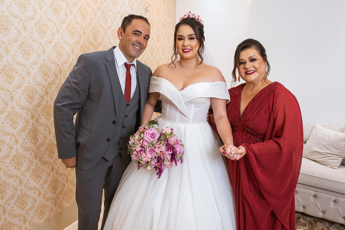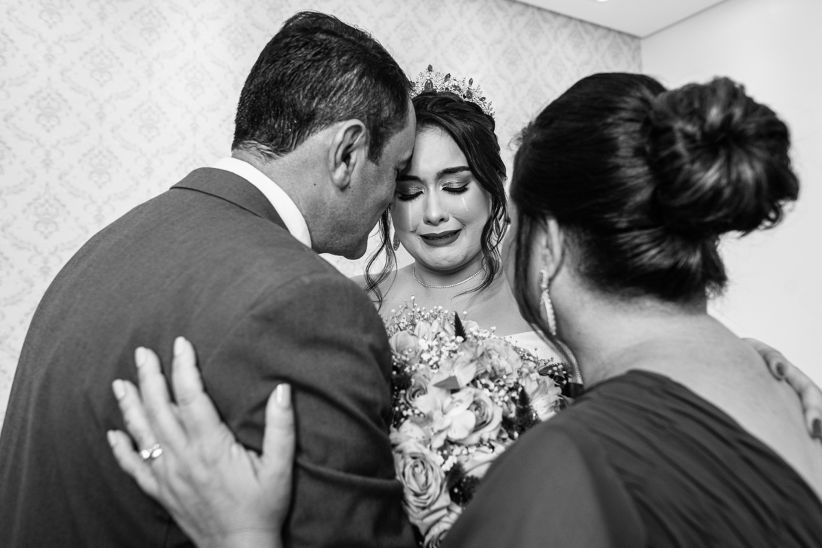 Enquanto os detalhes iam sendo finalizados, o pai da noiva chegou. A mãe da noiva me disse que queria muito que eu fotografasse o momento do encontro dos dois pela primeira vez, ela vestida de noiva. Eu me prontifiquei, aguardei o momento e me posicionei. A porta que separava os dois estava fechada, e do lado de cá eu já podia sentir a emoção no ar. Quando a porta se abriu e o pai da noiva a viu pela primeira vez, o brilho nos seus olhos ficou nítido. Aquele sentimento de surpresa, felicidade e amor se agruparam em um só. Aqueles poucos segundos pareciam intermináveis e enquanto ele caminhava para abraçar sua filha, ainda teve tempo para lhe enviar um beijinho com a mão. Foi o suficiente para fazer TODOS que estavam ali chorar horrores. Clarinha mal conseguia falar, só conseguia exalar gratidão. E eu ali registrando aquilo tudo acontecendo, os pai, a mãe e a noiva se abraçando e declarando amor e gratidão uns pelos outros me fez segurar o choro com as lágrimas nos olhos já. Respirei fundo, concentrei em registrar tudinho mas ao mesmo tempo com o coração emocionado com aquela cena. É inexplicável.