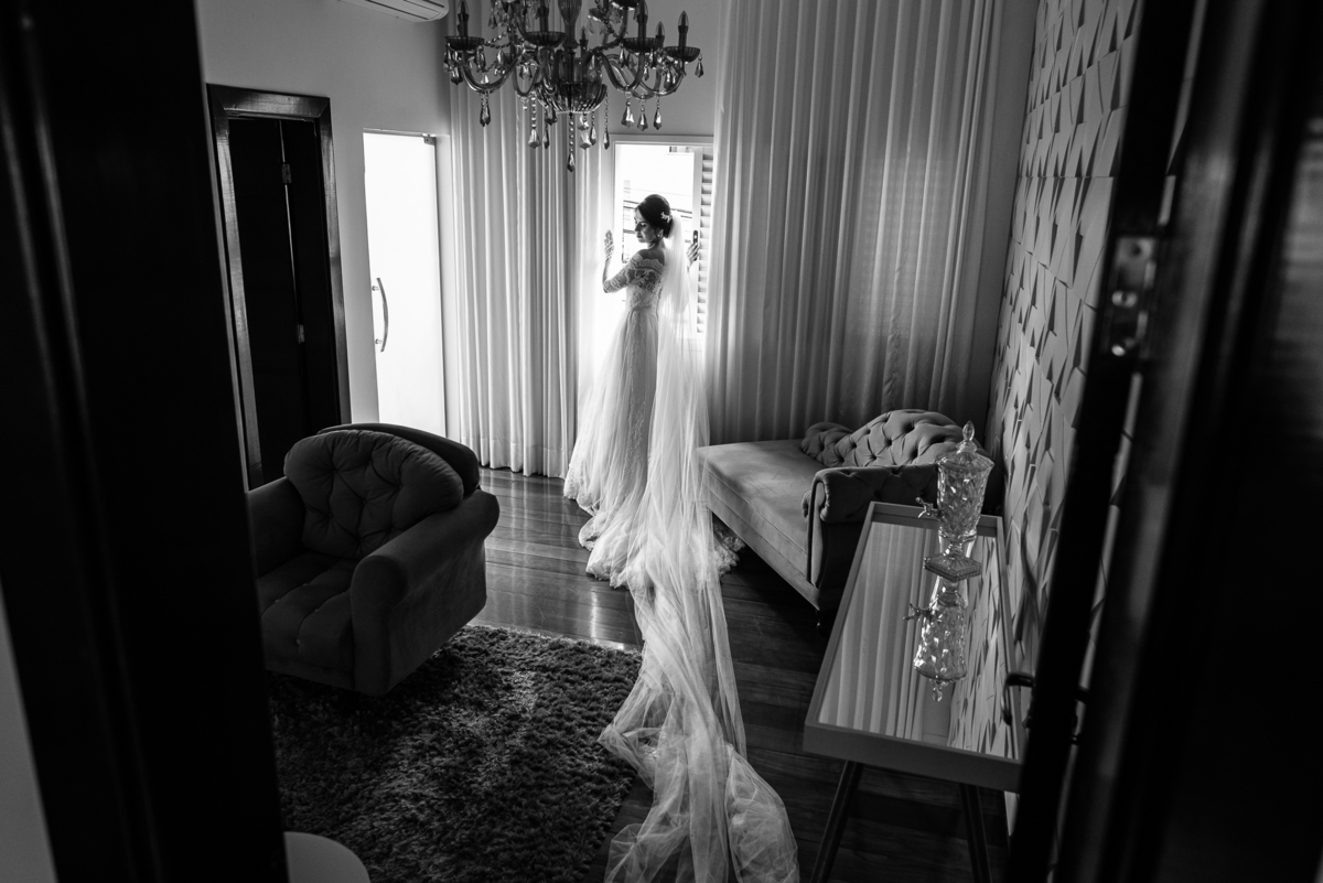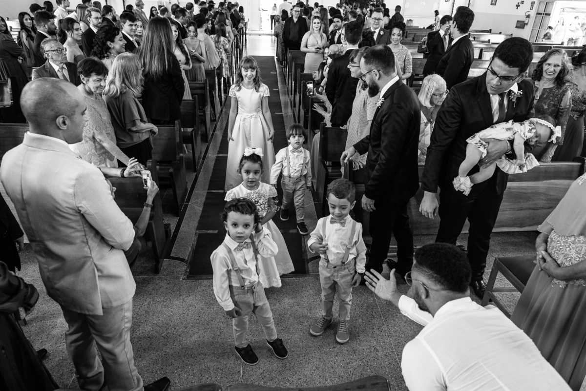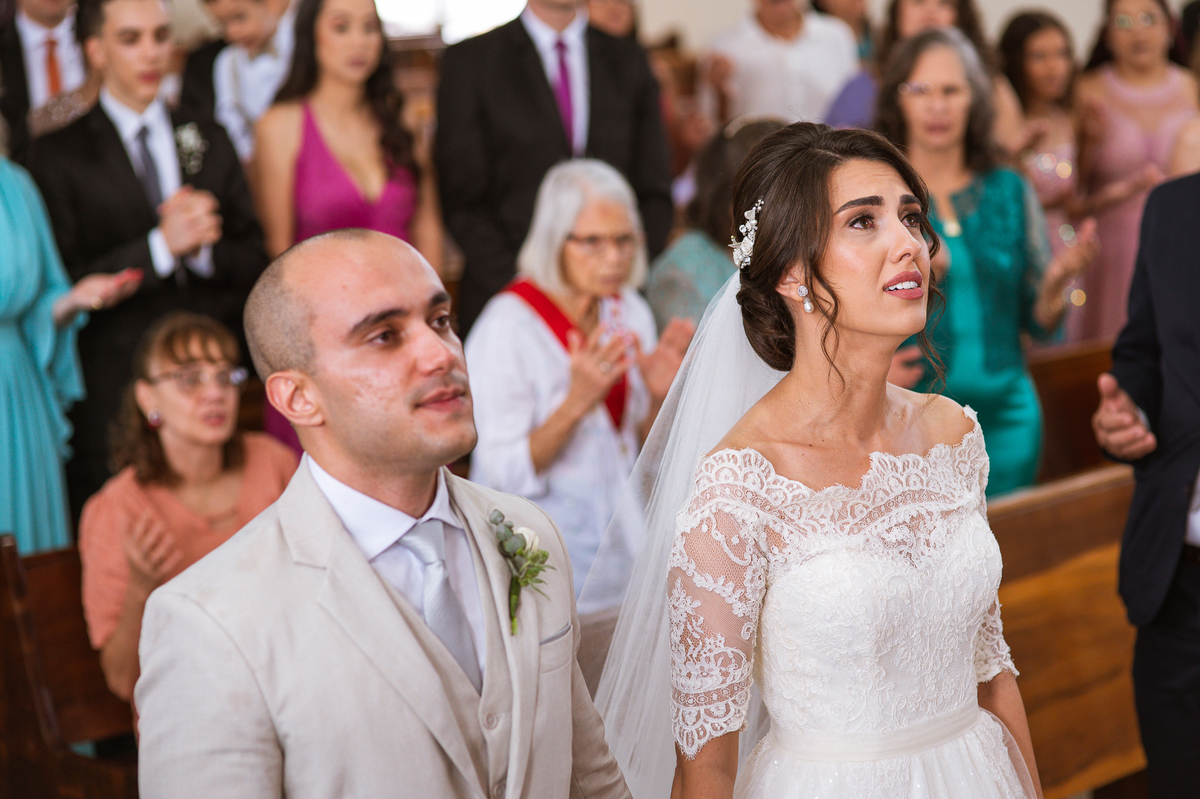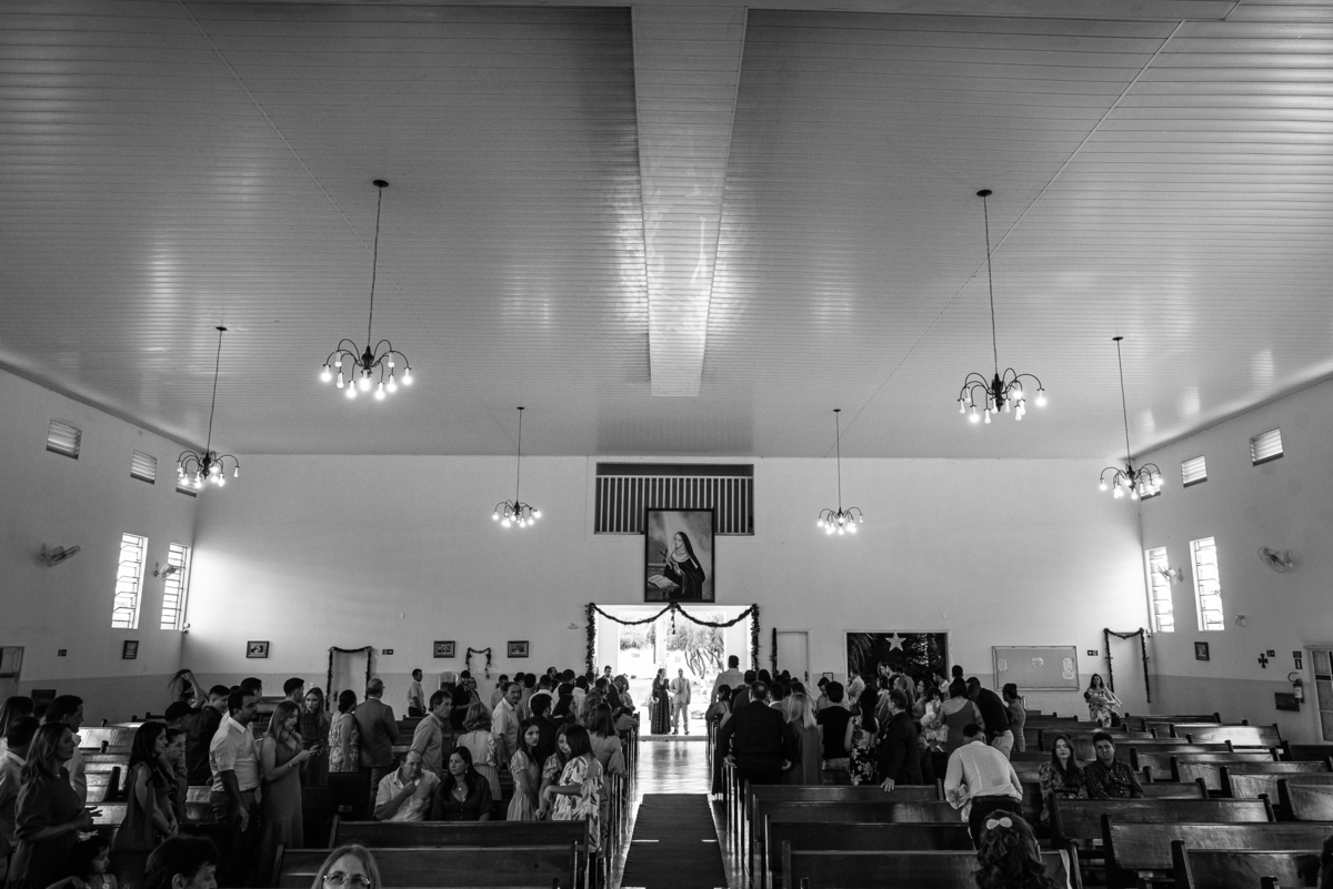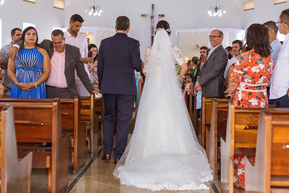 As portas da Igreja foram fechadas e o as emoções ficaram ainda mais fortes. Imagino que o coração do noivo estava apertado, ansiando que aquelas portas se abrissem e sua noiva caminhasse rumo ao seu encontro. A marcha nupcial foi iniciada e cada segundo parecia uma eternidade. Todos muito ansiosos para ver finalmente a noiva aparecer. Enfim, depois de alguns segundos de aguardo, as portas se abriram e o a luz do sol refletia no vestido da noiva e adornava a silhueta do vestido. Sempre digo que esse momento é muito especial. Consigo sentir a emoção de todo mundo, dando aquela respirada e também se virando para olhar a reação de Luciano com aquela cena.