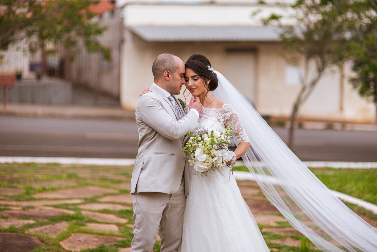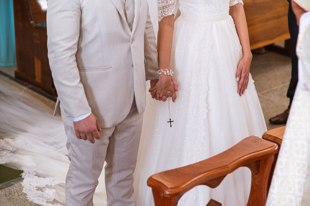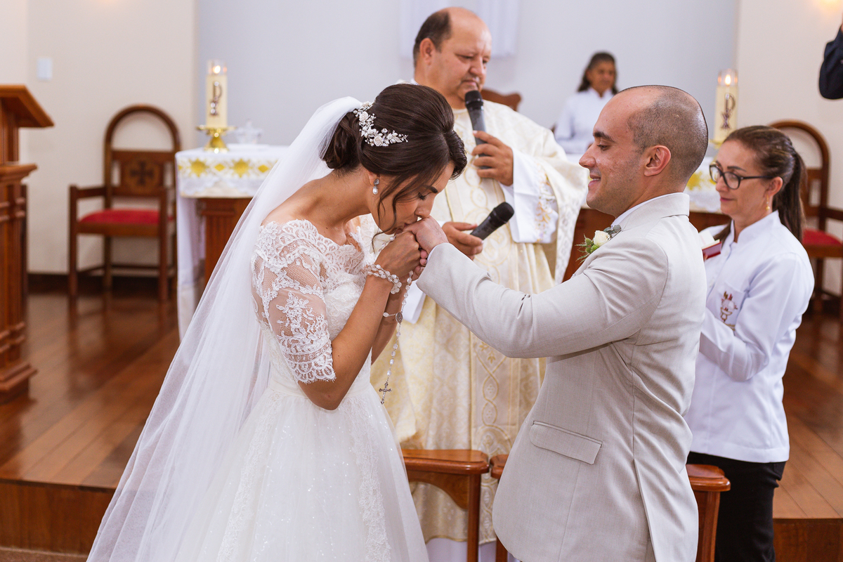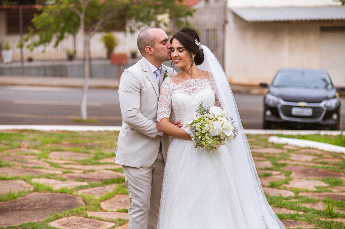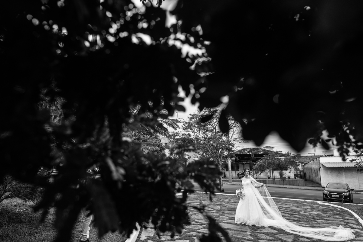 O padre trouxe uma mensagem maravilhosa. Exortou os noivos à continuarem servindo na igreja e participando ativamente das celebrações. Ele abençoou os noivos, as alianças e os declarou casados perante Deus e as testemunhas. Eles assinaram o termo de casamento junto com as testemunhas e fizemos todas as fotos de praxe. Na saída, os noivos foram recebidos com muita festa pelos padrinhos. Fizemos fotos lindas! Saímos da celebração e fizemos um mini ensaio dos noivos. O dia estava lindo, a praça da cidade estava vazia e nós fizemos boa parte das fotos por lá mesmo. Ao finalizar, os noivos me perguntaram se ainda tinha tempo para fazermos uma última foto. Lhes perguntei qual foto seria e me disponibilizei imediatamente. Foi quando eles me contaram que o primeiro beijo deles aconteceu numa determinada pracinha, e que gostariam muito de retornar lá e fazer uma foto naquele local.
