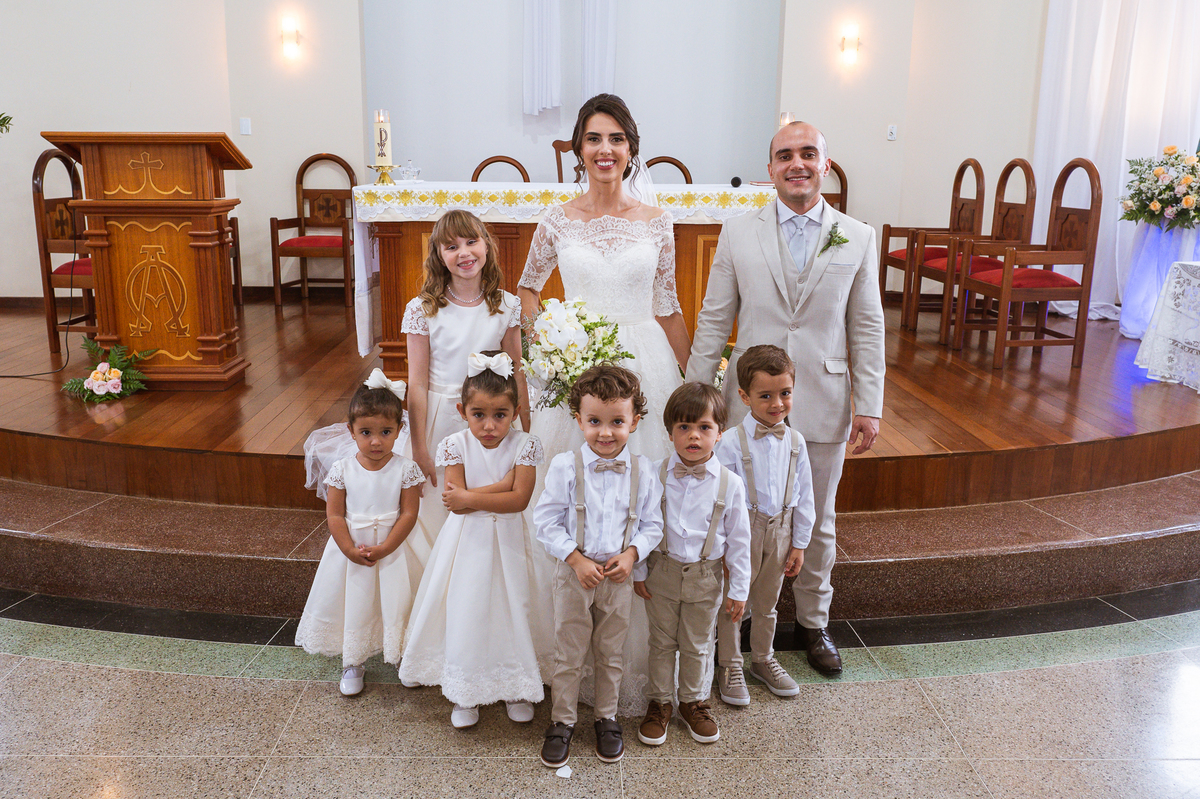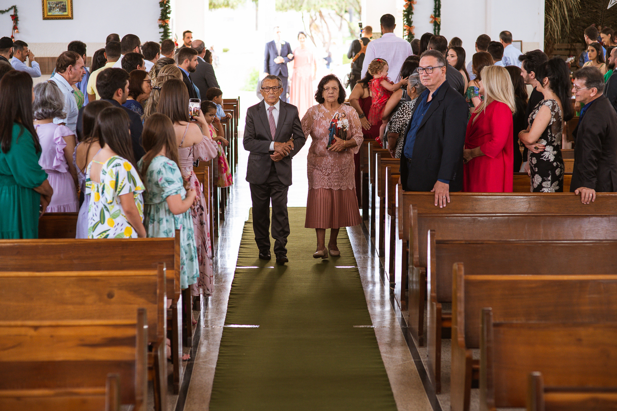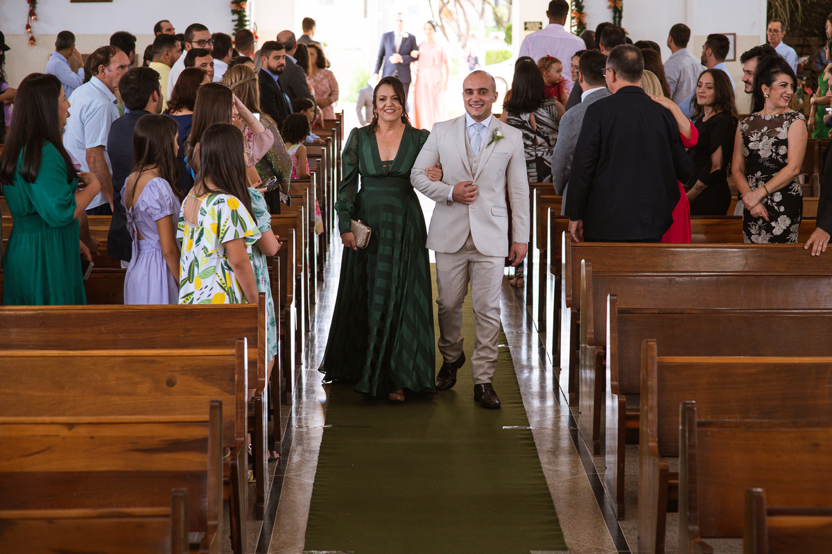 Já era possível ouvir os músicos afinando os instrumentos para dar início. O padre estava posicionado e então tudo estava pronto. A cerimônia iniciou e as entradas foram acontecendo. Parecia um grande desfile de pessoas muito especiais que fariam daquele momento um dia inesquecível. Luciano entrou acompanhado de sua mãe e fez questão de agradecê-la com um forte abraço e também em seu pai. Lá no altar, o noivo esperava ansiosamente pela chegada de sua noiva. Os padrinhos também adentraram desfilando toda beleza e simpatia. Os pajens deram seu show à parte, entrando e arrancando sorrisos de todos que estavam ali.