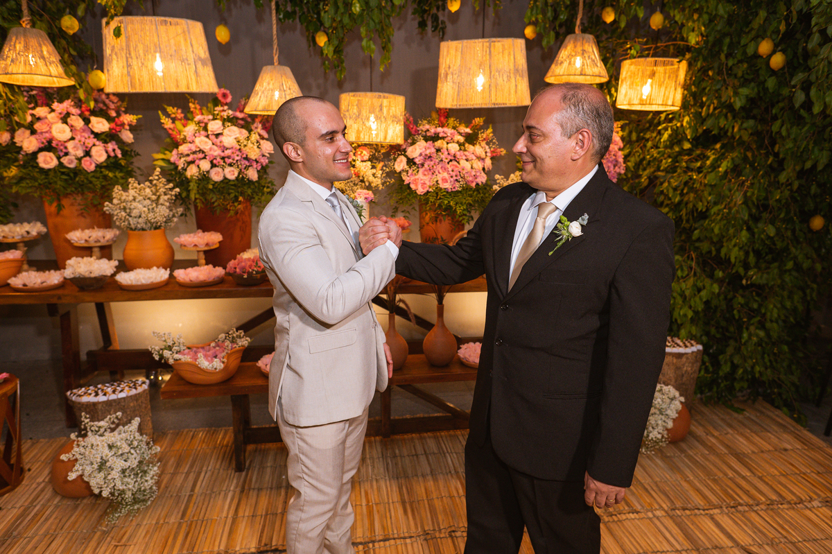 Assim, chegando na cidade já não havia sequer sinal de chuva. O sol estava lá fazendo sua parte. Os padrinhos e o noivo estavam se organizando para iniciarmos a celebração. O cerimonial Pedro Marra estava deixando tudo perfeitamente arranjado. Milleny chegou e fizemos várias fotos no carro, com toda calma do mundo. Seu pai também compareceu, apesar de estar com os olhos marejados de lágrimas, pela emoção daquele momento. Do outro lado estava Luciano, acompanhado de seus pais e padrinhos. Com semblante tranquilo, aguardava o início da cerimônia, cumprimentando todos os amigos que fizeram questão de estar ali com eles.