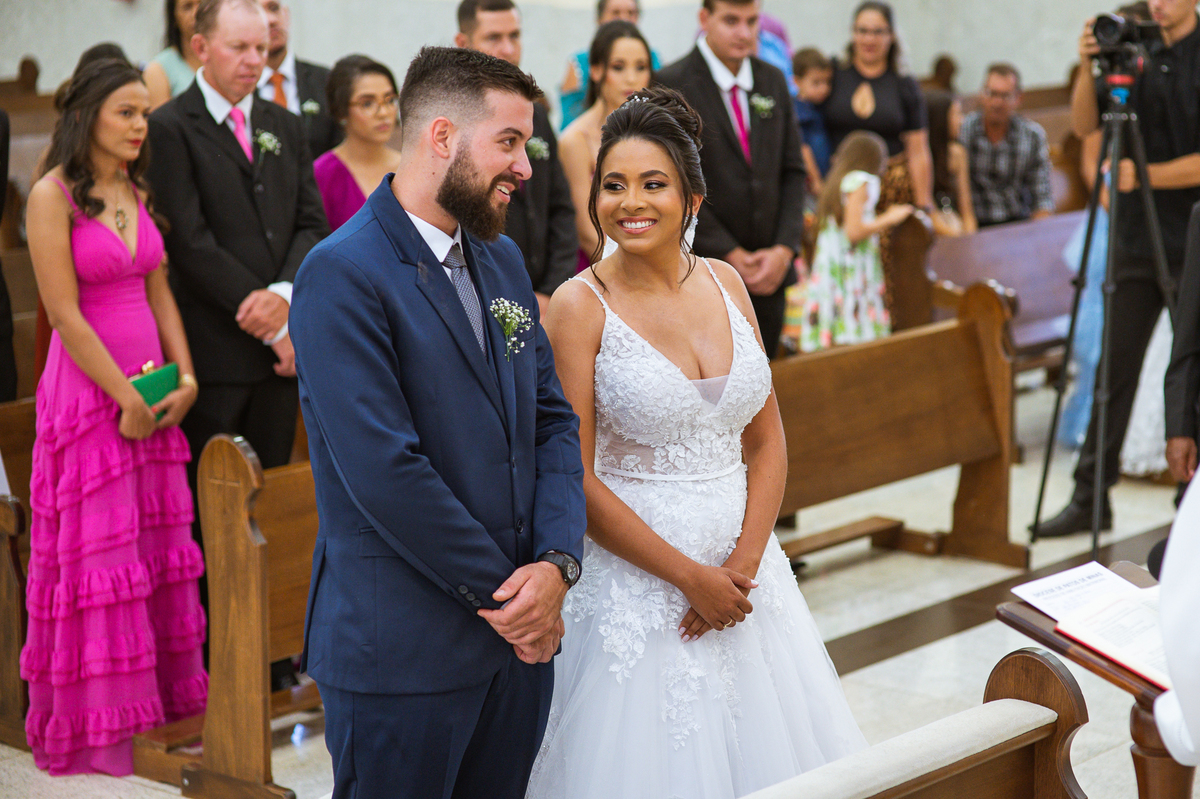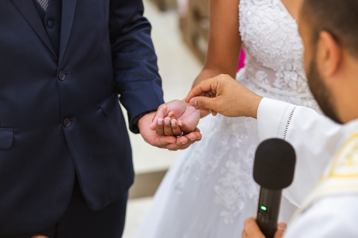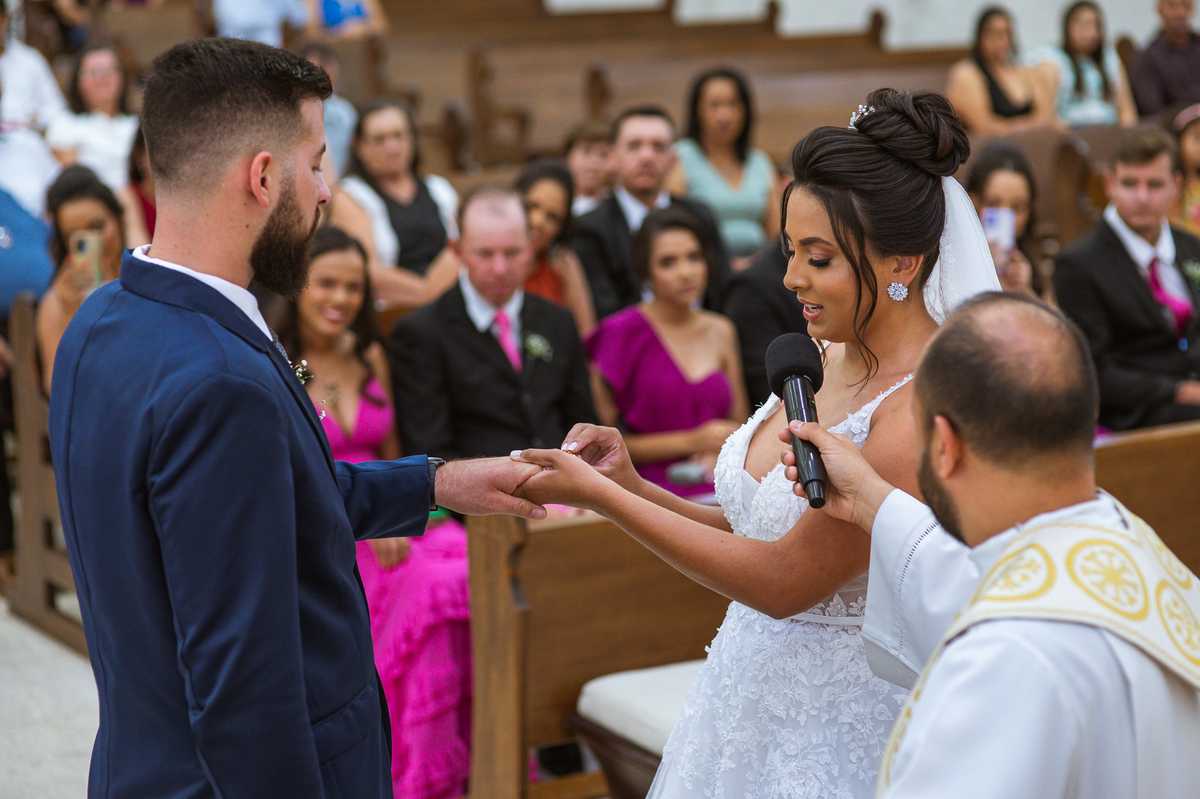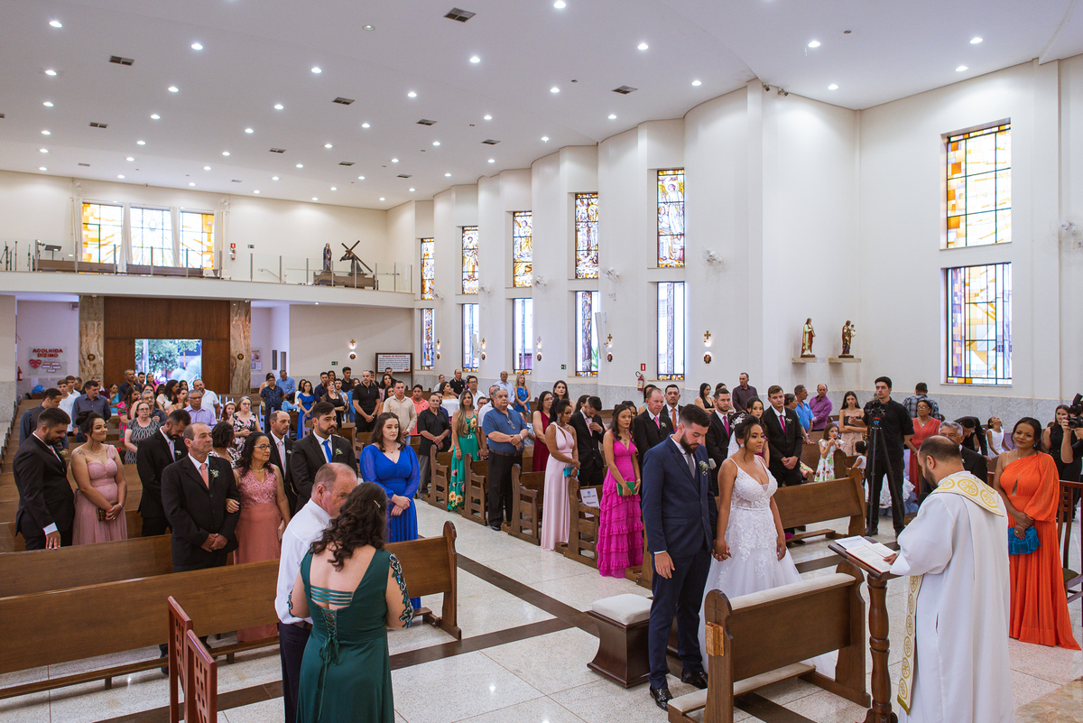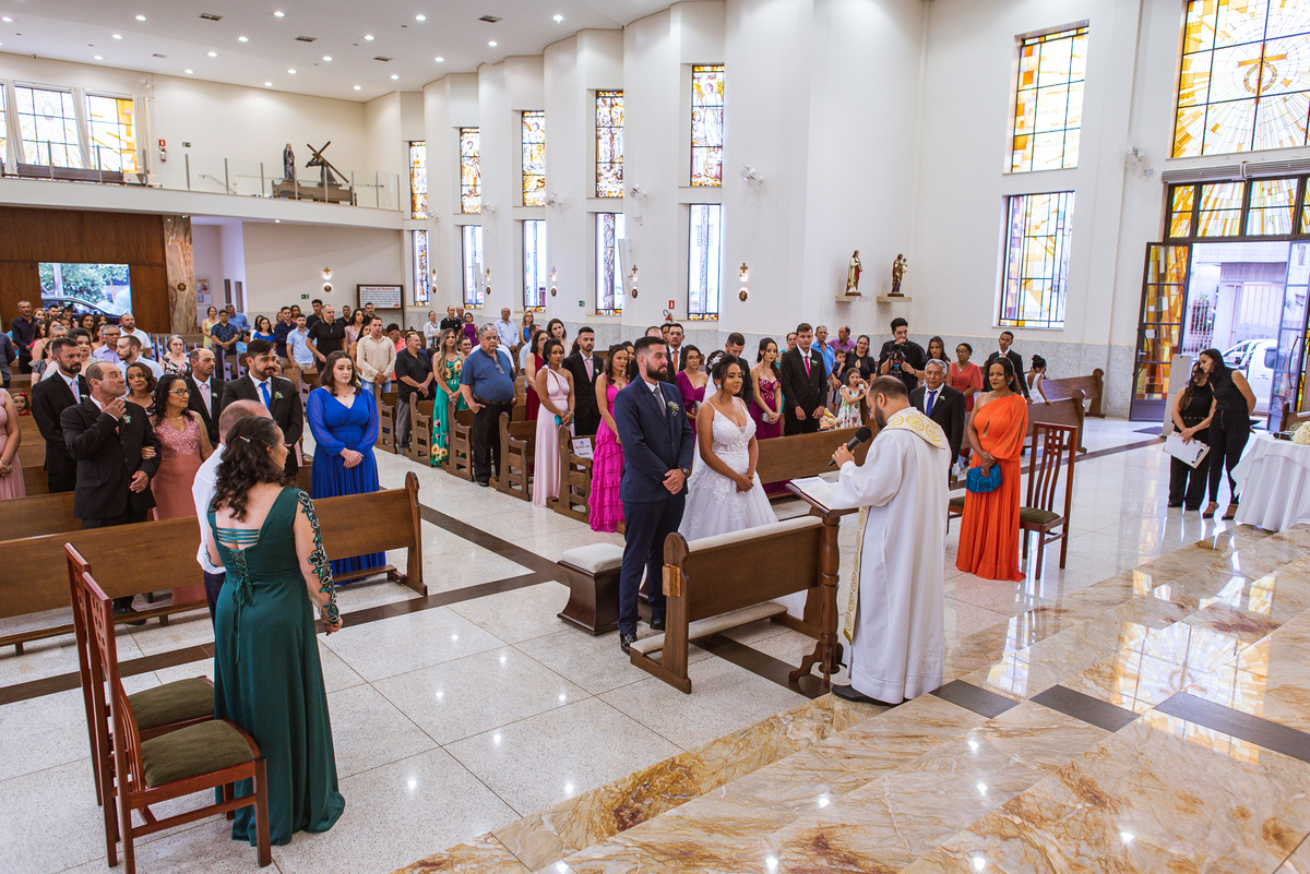 Recepcionados pelo padre celebrante, eles foram agraciados com a homilia. Receberam as palavras que com toda certeza ficarão para sempre em seus corações. Declararam seus votos, receberam a bênção das alianças e as trocaram. Assim, perante Deus e todos convidados e testemunhas, eles foram declarados casados. Assinaram todos os papéis que fazem parte de todo o processo, fizemos nossas tradicionais fotografias com os padrinhos e familiares e encerramos a celebração. Já do lado de fora, os padrinhos formaram a fila para recepcionar o recém-casados. Com um festival de bolinhas de sabão, André e Nathalia foram recebidos e comemoraram junto com todos.