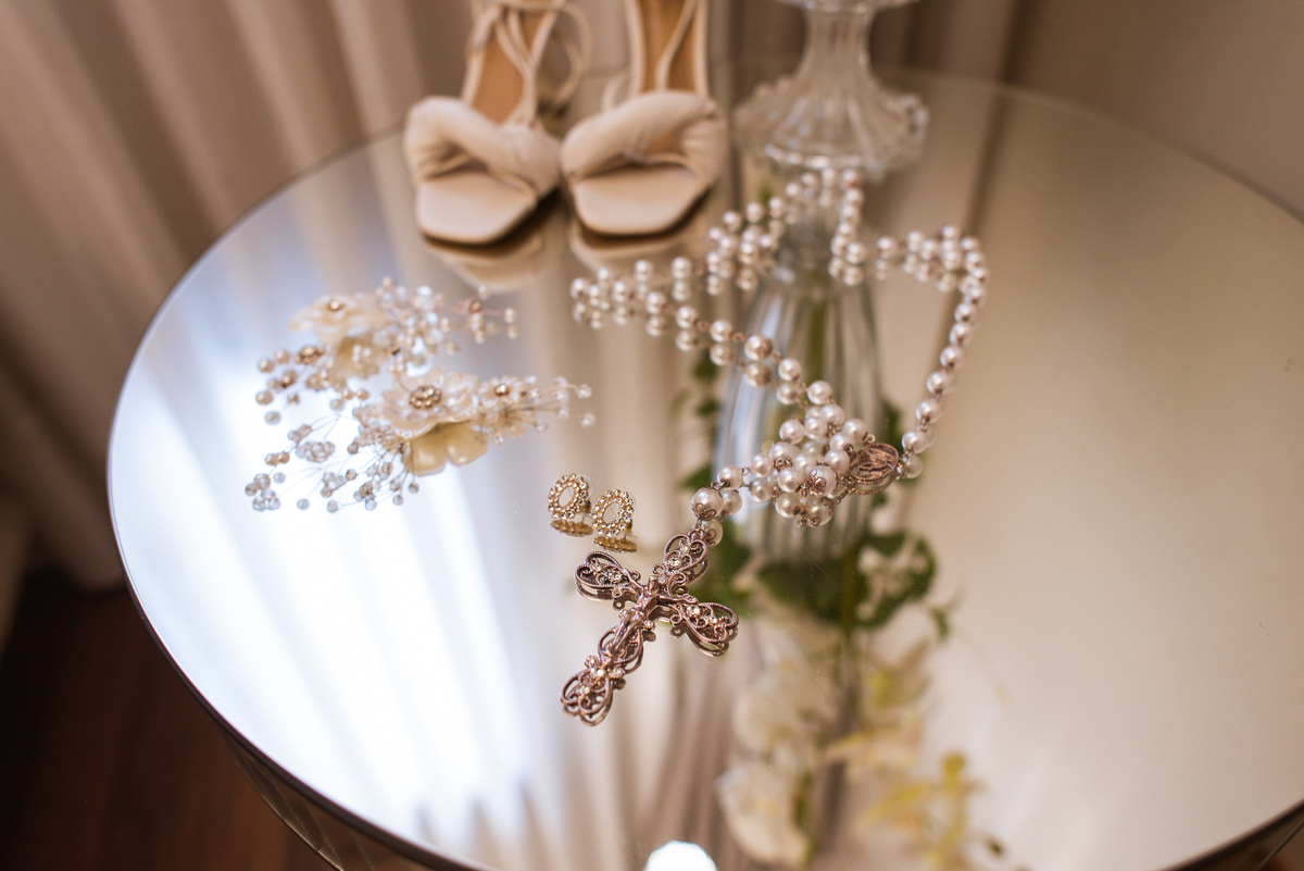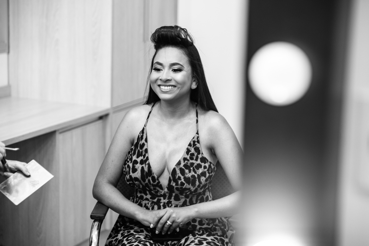 Chegando lá, encontramos a noiva finalizando a make, com um sorriso de canto a canto do rosto. Ao se olhar no espelho e ver o trabalho da profissional finalizado, ela ficou encantada. Partimos para a produção do cabelo. Enquanto a produção foi sendo feita, nós registramos todos os detalhes. A mãe da noiva, sua vovó e as madrinhas se fizeram presentes em todo o tempo, animando a noiva e tranquilizando sobre qualquer detalhe que ela precisasse. Até a daminha de honra se fez presente na produção. Claro que não deixamos passar nenhum dos registros desses momentos.