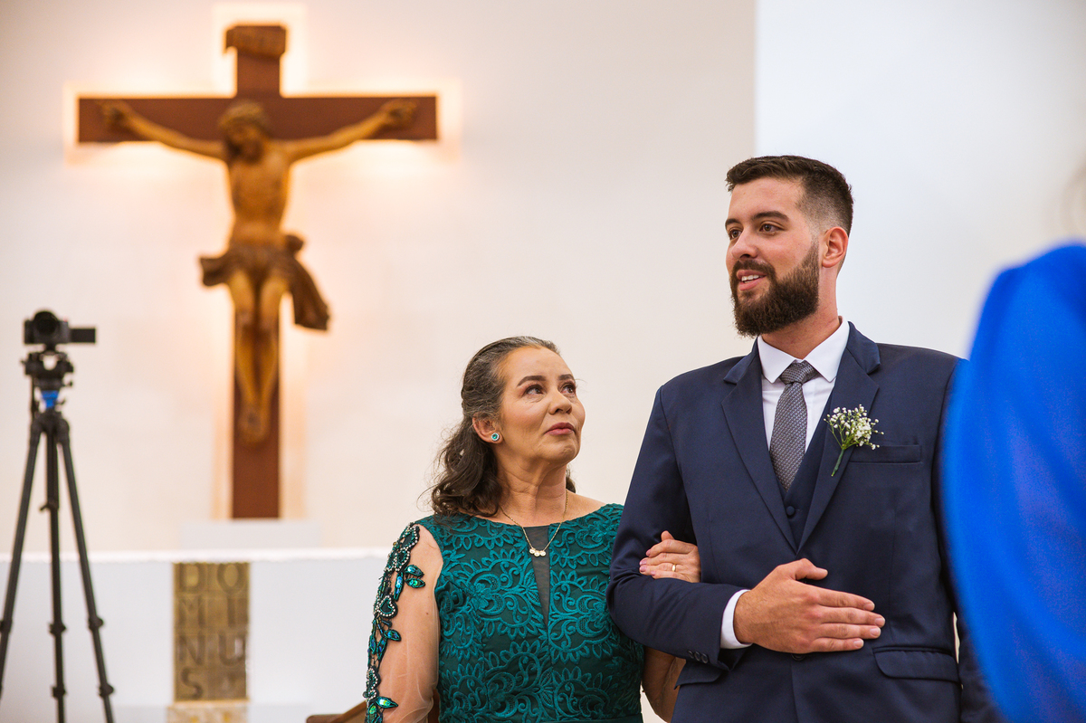 Sabendo disso, fiz questão de envolver ele o quanto pude nas fotografias. E foi ele também que a levou ao altar. A celebração se iniciava naquele momento, com os músicos já entoando seus cânticos e anunciando que tudo estava pronto. Os padrinhos já estavam alinhados para entrar, as crianças que foram escolhidos pajens também estavam lá prontinhas aguardando. As entradas ocorreram todas conforme o planejado. Os pais dos noivos, padrinhos, pajens e o noivo. André caminhou de braços dados com sua mãe até o altar, onde seu pai já os aguardava. As portas foram fechadas e a marcha nupcial começou a ser tocada. Nesse momento, até o coração mais duro se abranda. As notas musicais fazem com que os olhos se voltem todos para o noivo e a porta onde a noiva está por detrás.