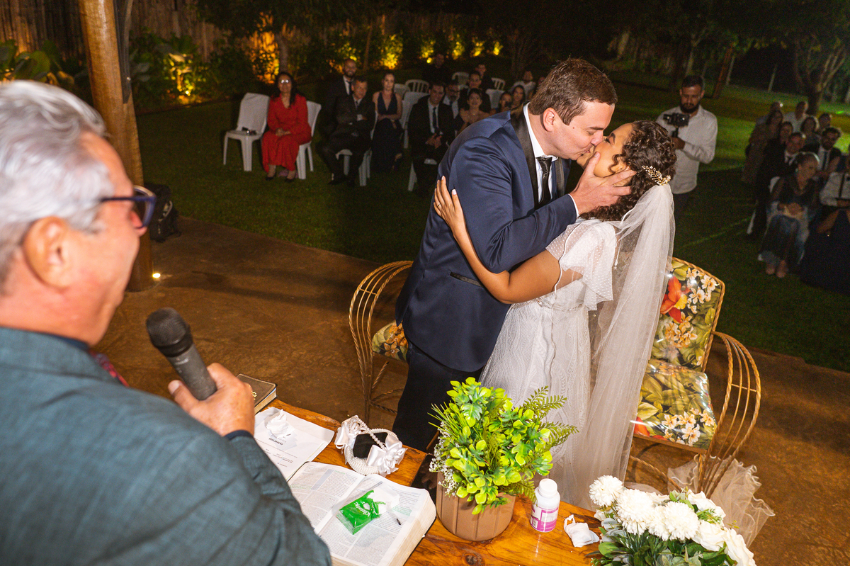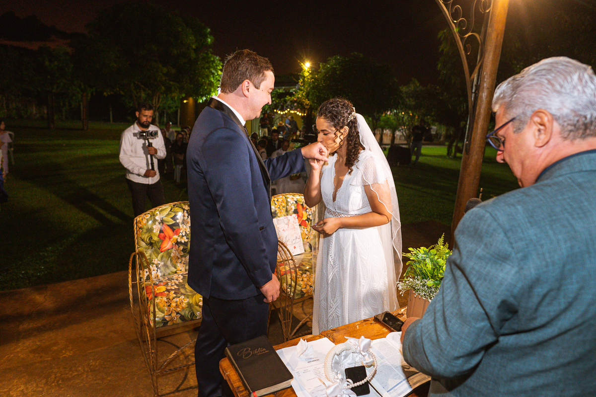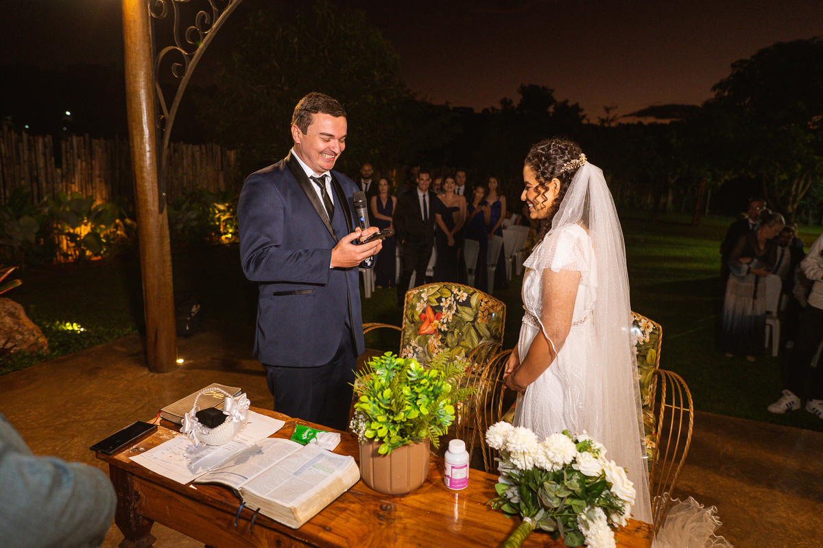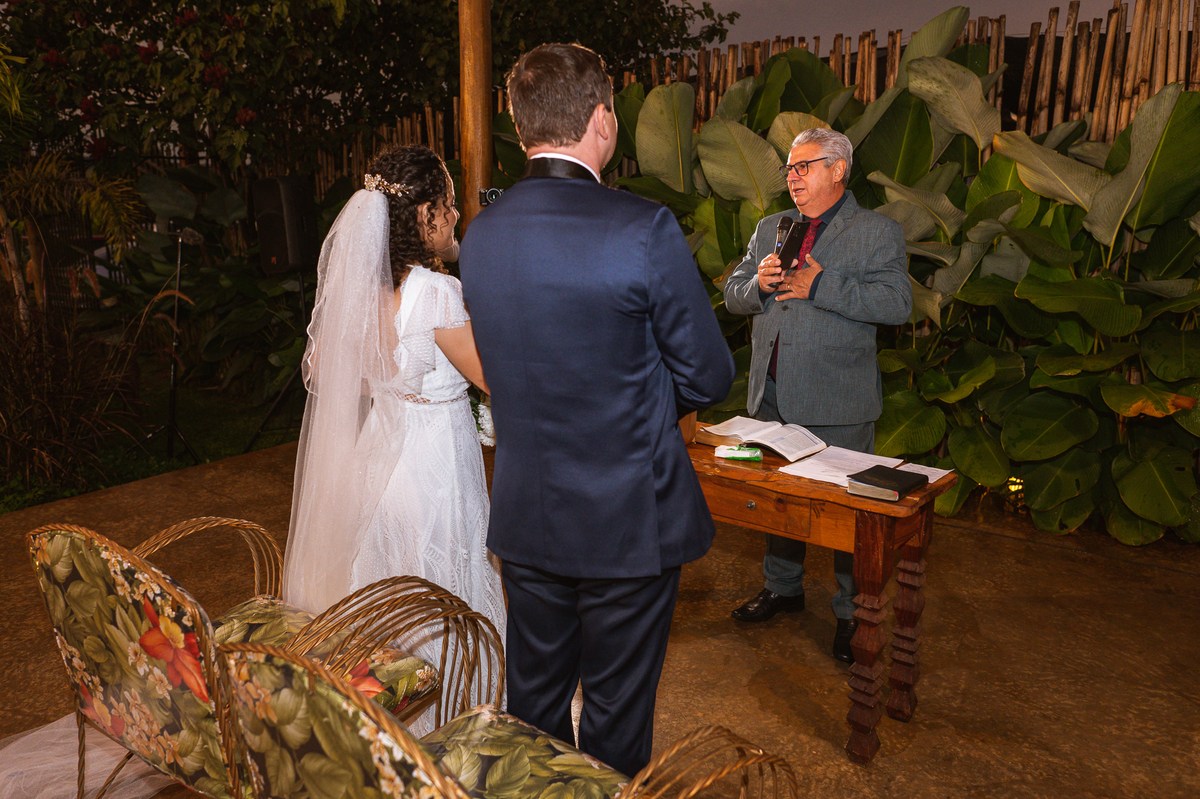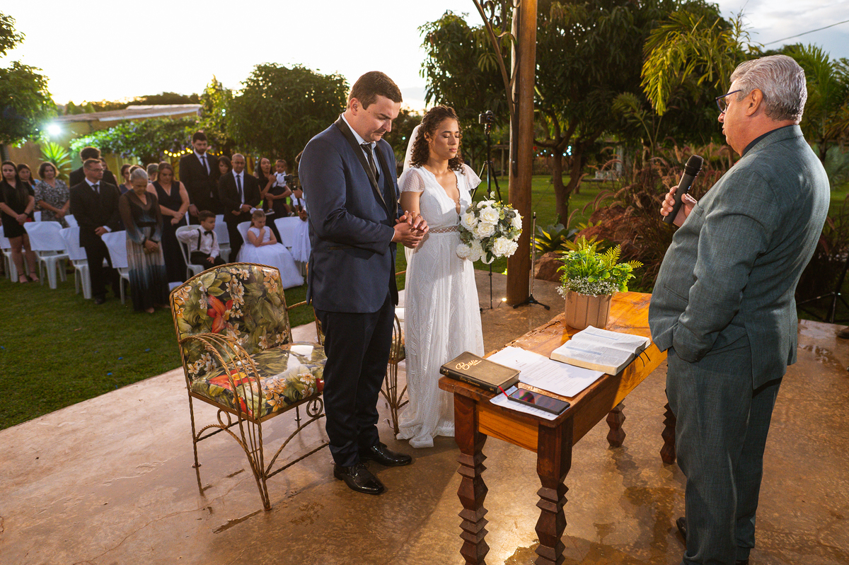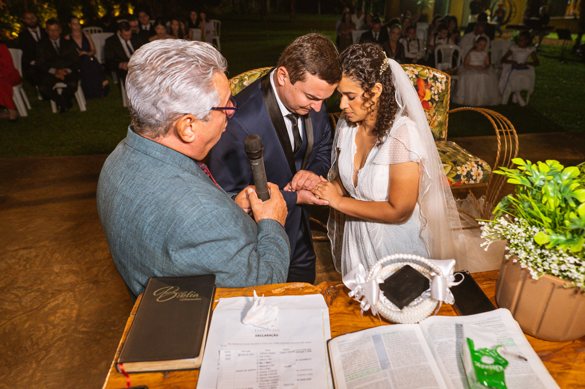 Eles despediram-se uns dos outros e agora juntos caminharam para o altar. Foram recepcionados pelo pastor celebrante que fez questão de tirar uma foto dos noivos antes de iniciar sua palavra. Toda a celebração foi emocionante do início ao final. O pastou preparou uma liturgia impecável, que uniu o trabalho dos noivos com a bíblia e o casamento. Foi incrível e muito especial. Ao final, os noivos fizeram seus votos super emocionantes, Holmes novamente surpreendeu sua noiva com uma música especial para presenteá-la na celebração. Os dois foram abençoados e declarados casados perante a lei dos homens e de Deus. Fizemos as fotografias de praxe e já preparamos a saída.