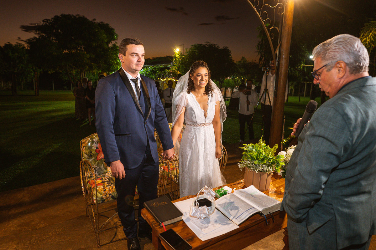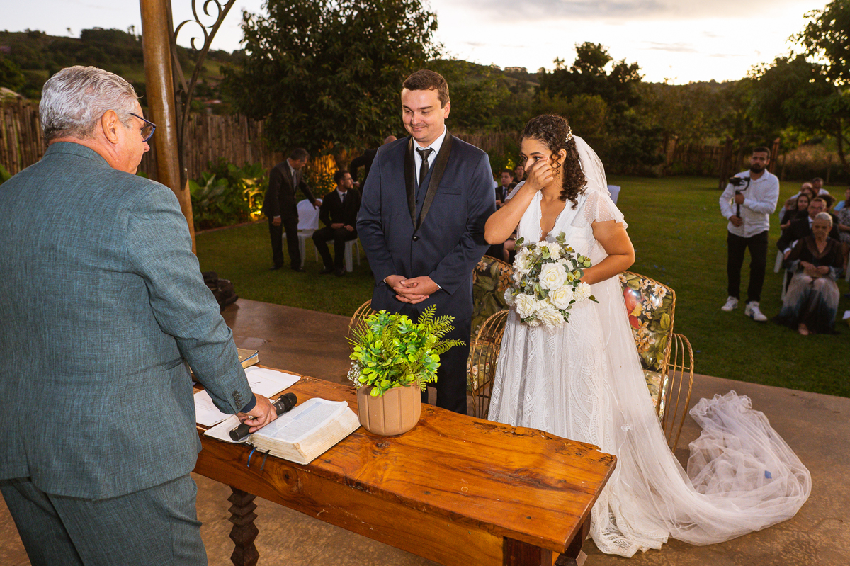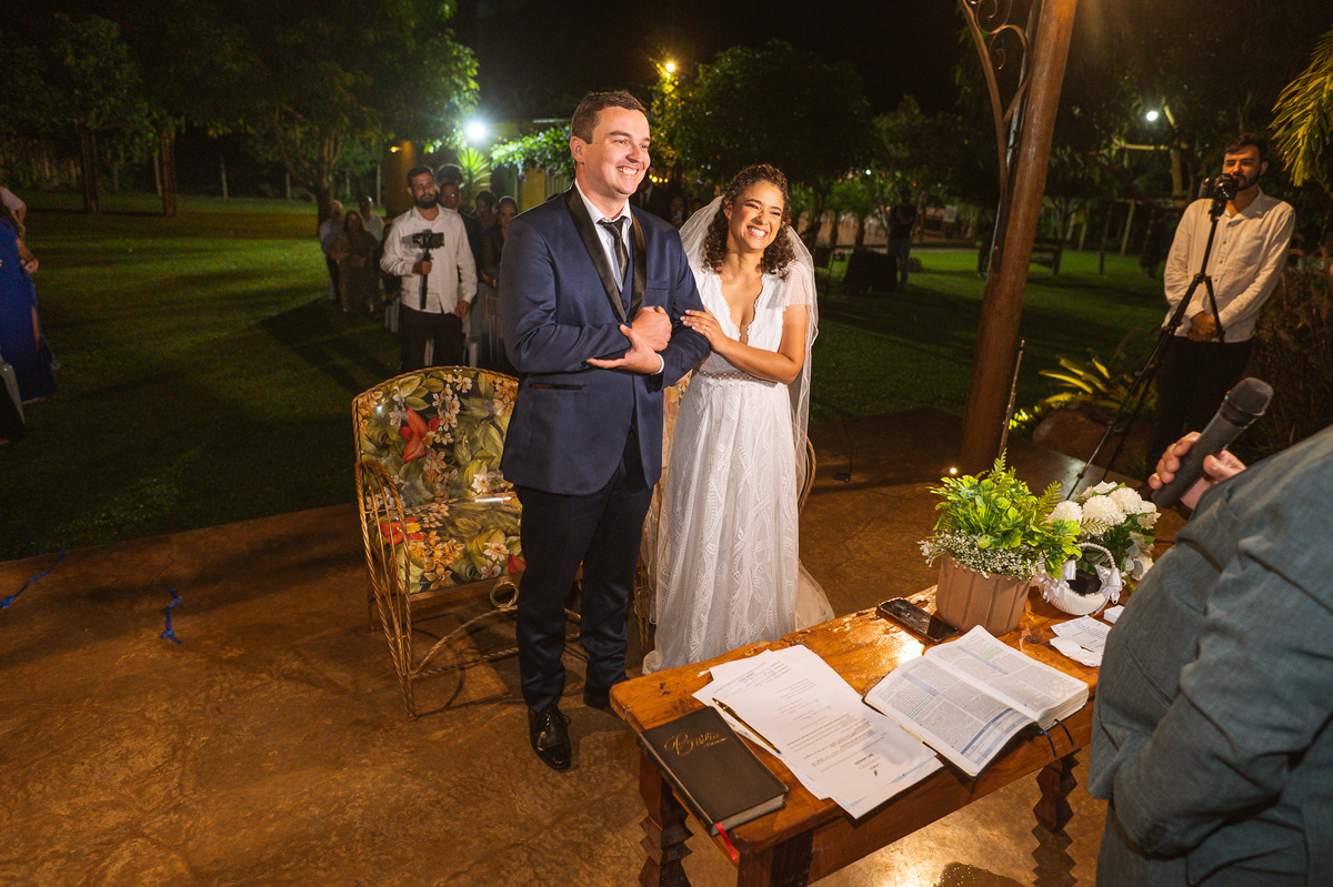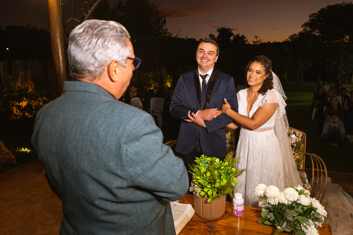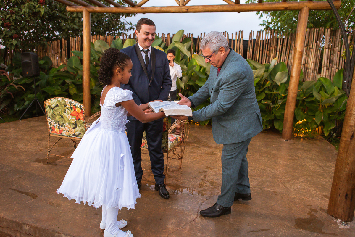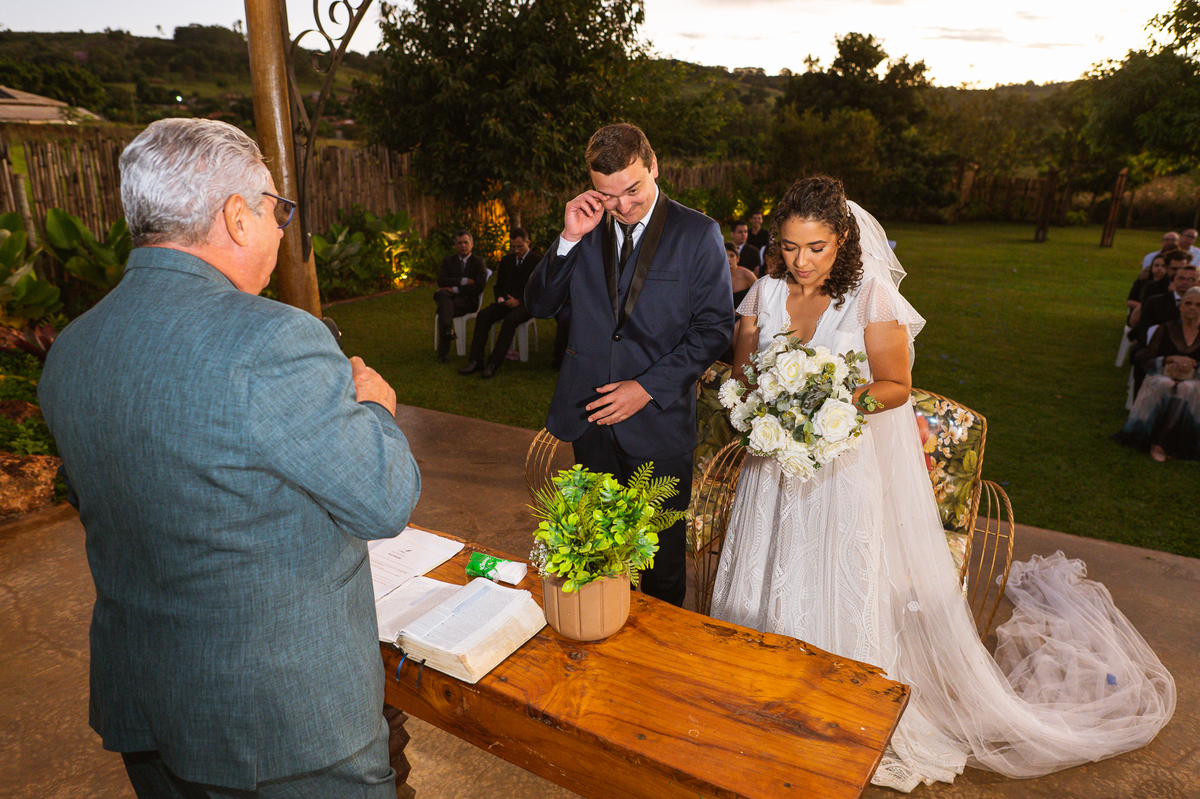 Eles despediram-se uns dos outros e agora juntos caminharam para o altar. Foram recepcionados pelo pastor celebrante que fez questão de tirar uma foto dos noivos antes de iniciar sua palavra. Toda a celebração foi emocionante do início ao final. O pastou preparou uma liturgia impecável, que uniu o trabalho dos noivos com a bíblia e o casamento. Foi incrível e muito especial. Ao final, os noivos fizeram seus votos super emocionantes, Holmes novamente surpreendeu sua noiva com uma música especial para presenteá-la na celebração. Os dois foram abençoados e declarados casados perante a lei dos homens e de Deus. Fizemos as fotografias de praxe e já preparamos a saída.