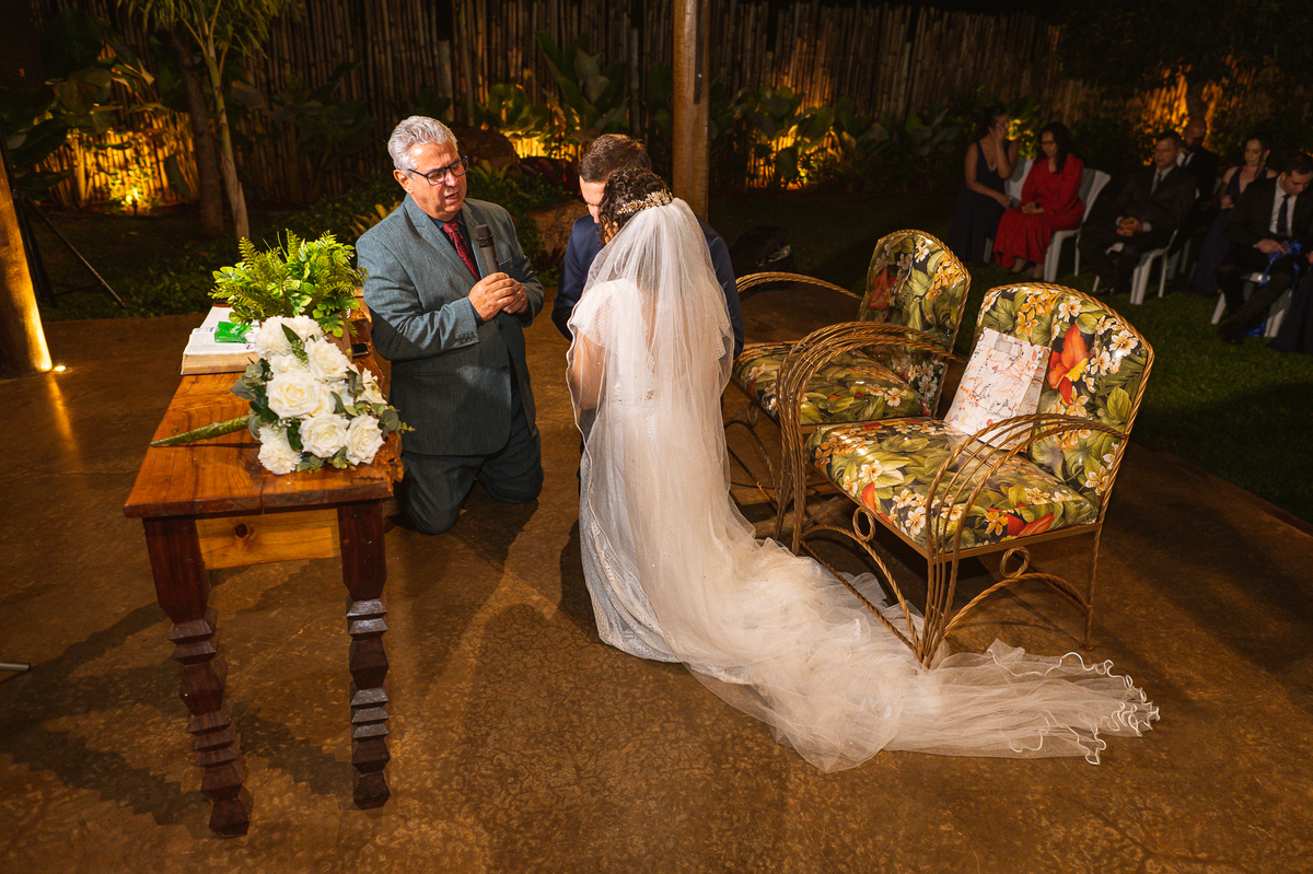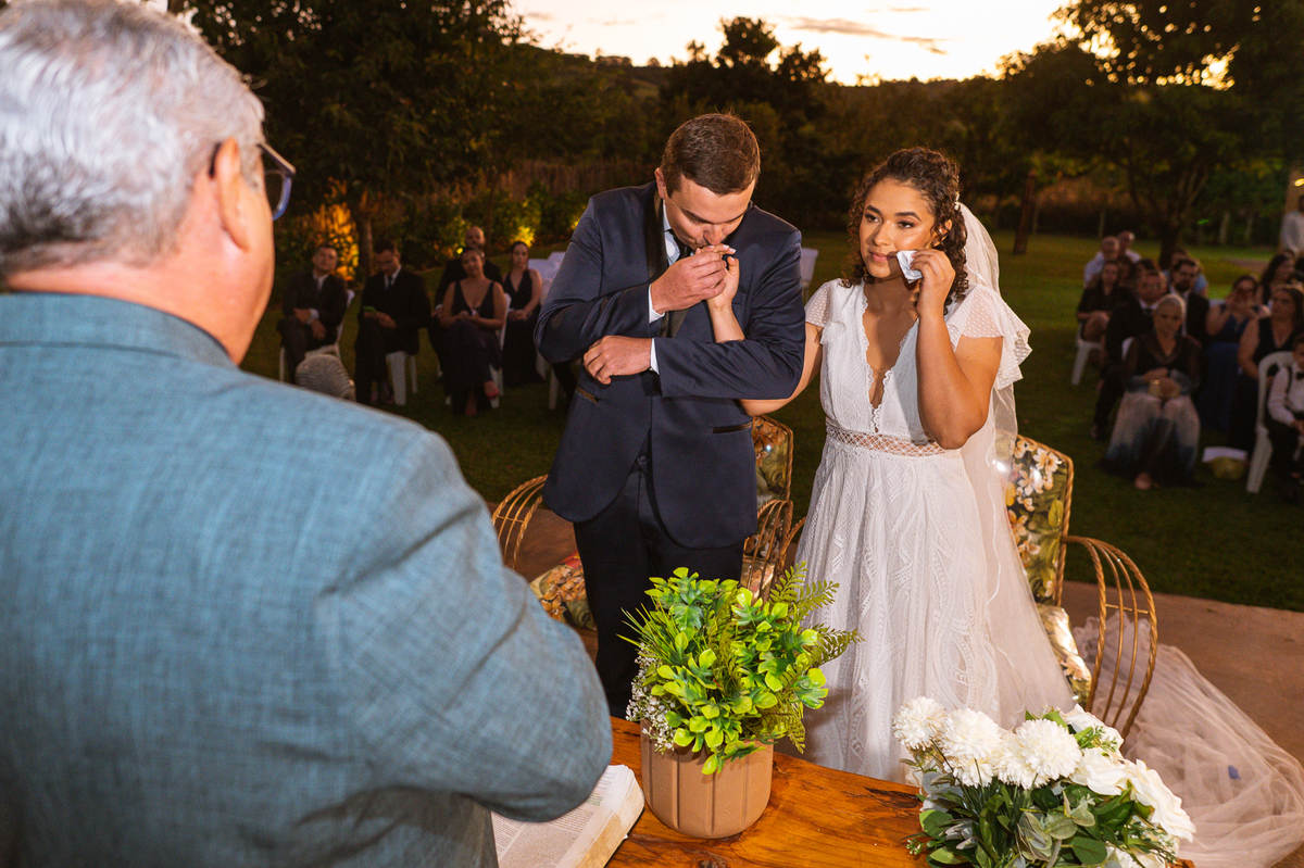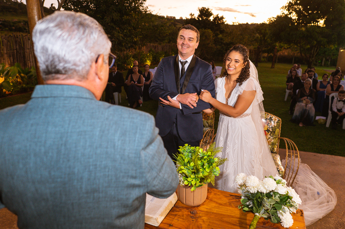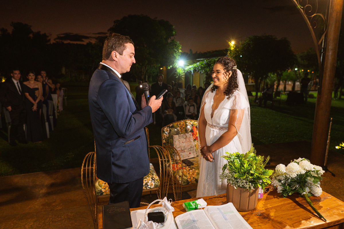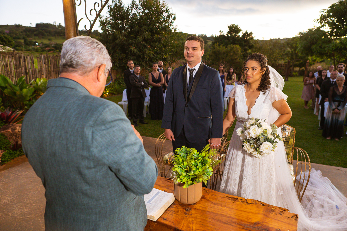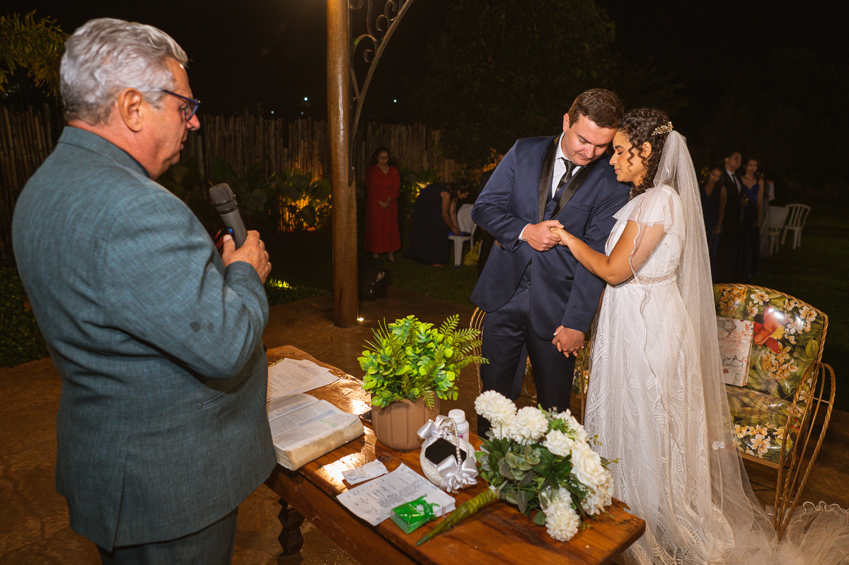 Eles despediram-se uns dos outros e agora juntos caminharam para o altar. Foram recepcionados pelo pastor celebrante que fez questão de tirar uma foto dos noivos antes de iniciar sua palavra. Toda a celebração foi emocionante do início ao final. O pastou preparou uma liturgia impecável, que uniu o trabalho dos noivos com a bíblia e o casamento. Foi incrível e muito especial. Ao final, os noivos fizeram seus votos super emocionantes, Holmes novamente surpreendeu sua noiva com uma música especial para presenteá-la na celebração. Os dois foram abençoados e declarados casados perante a lei dos homens e de Deus. Fizemos as fotografias de praxe e já preparamos a saída.