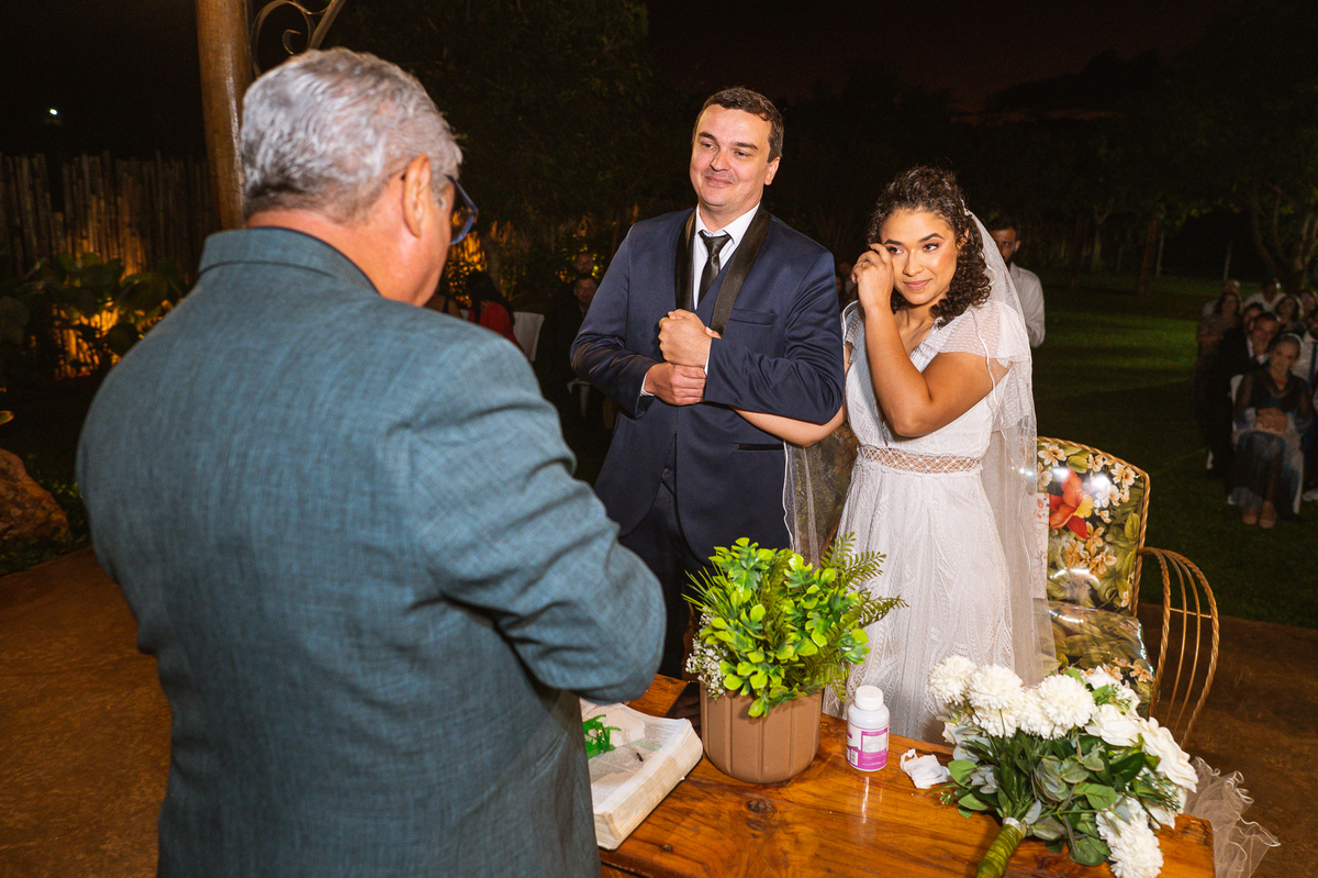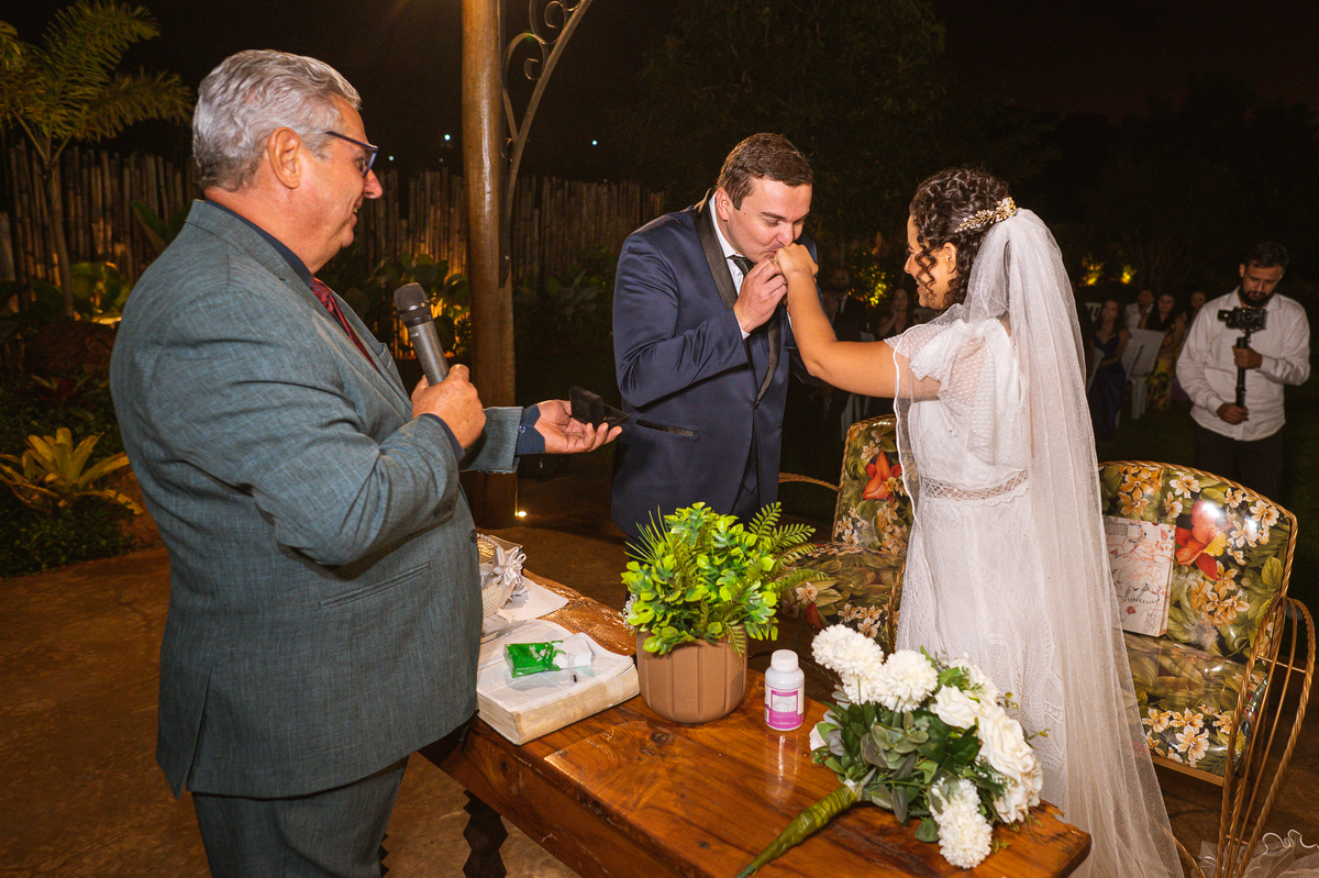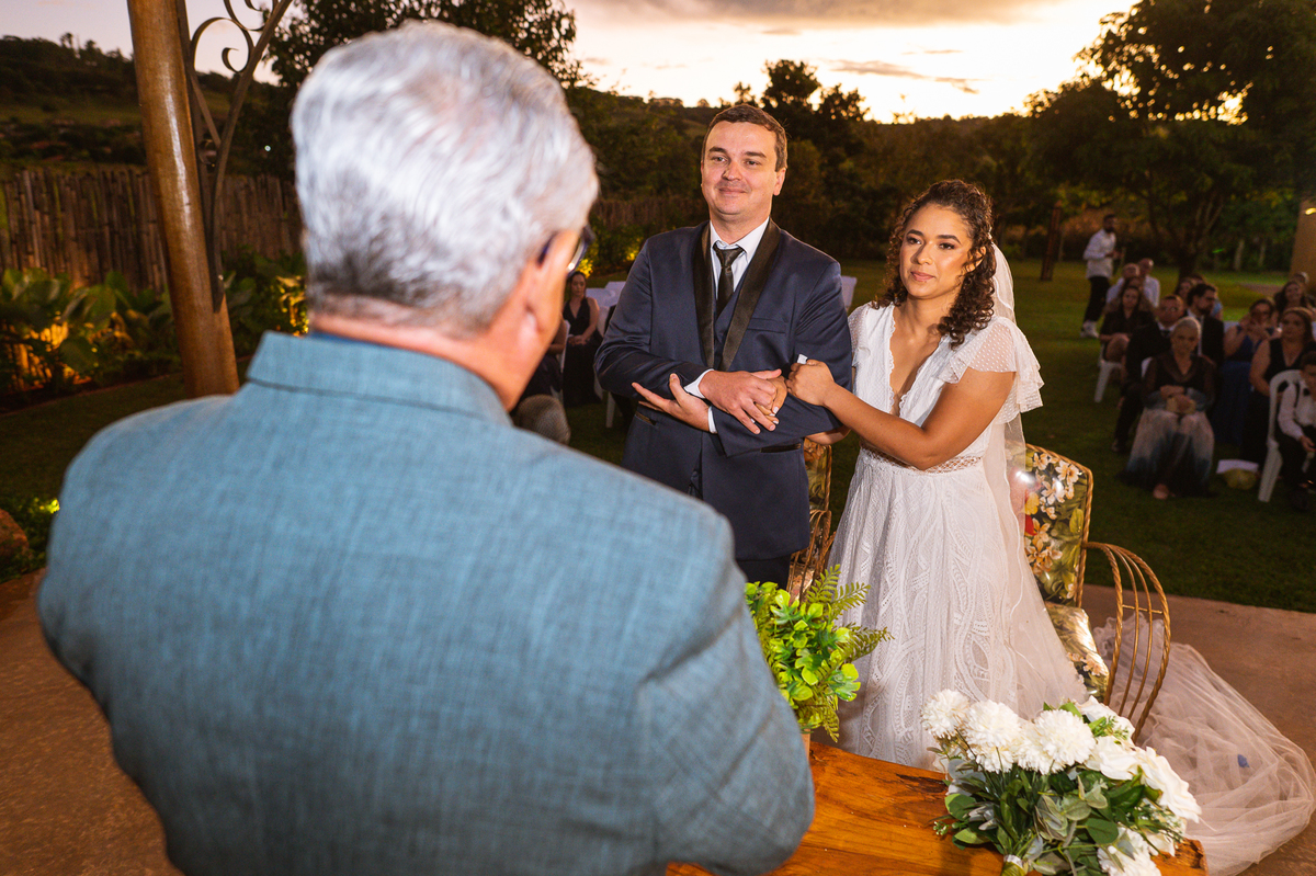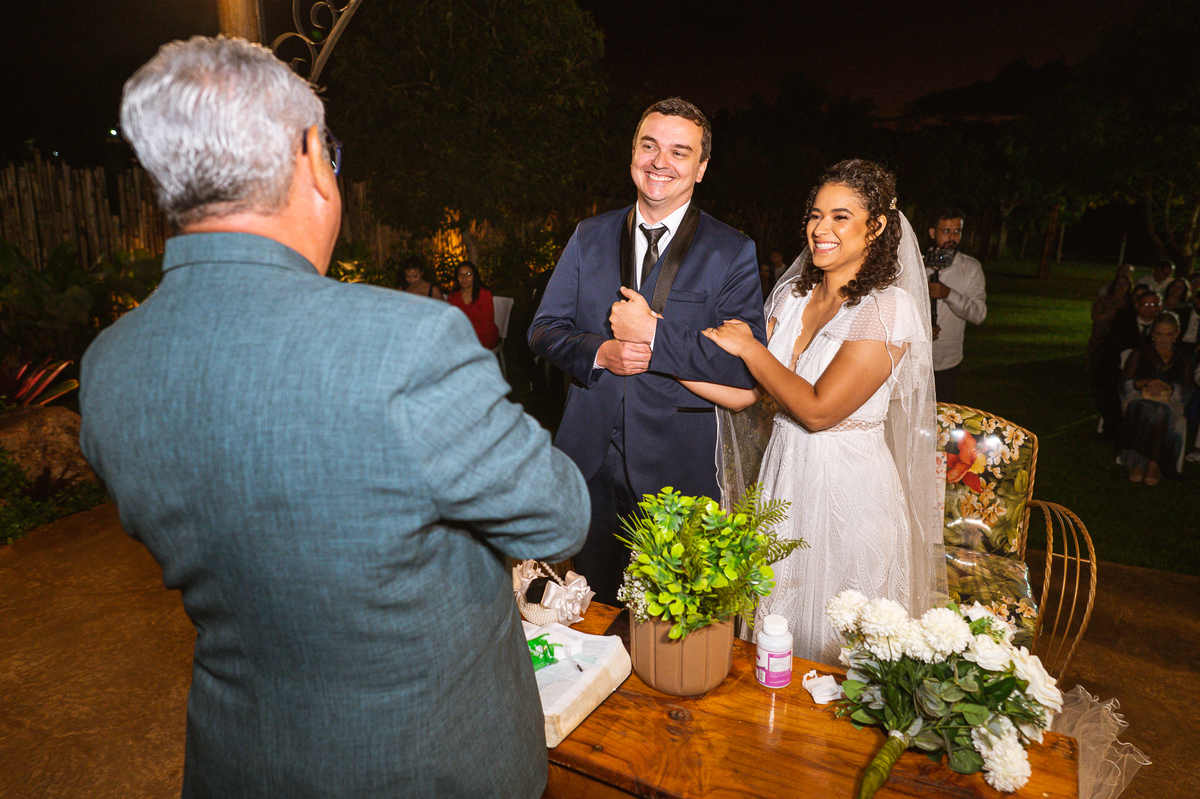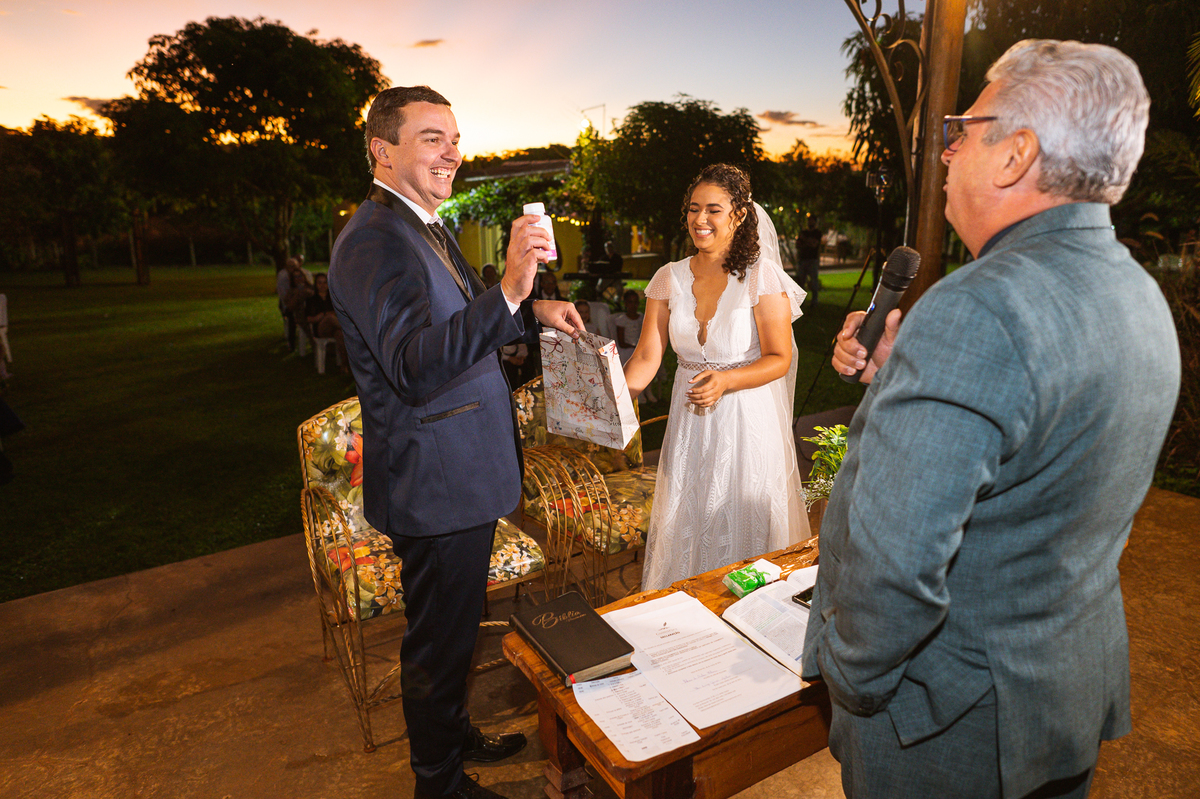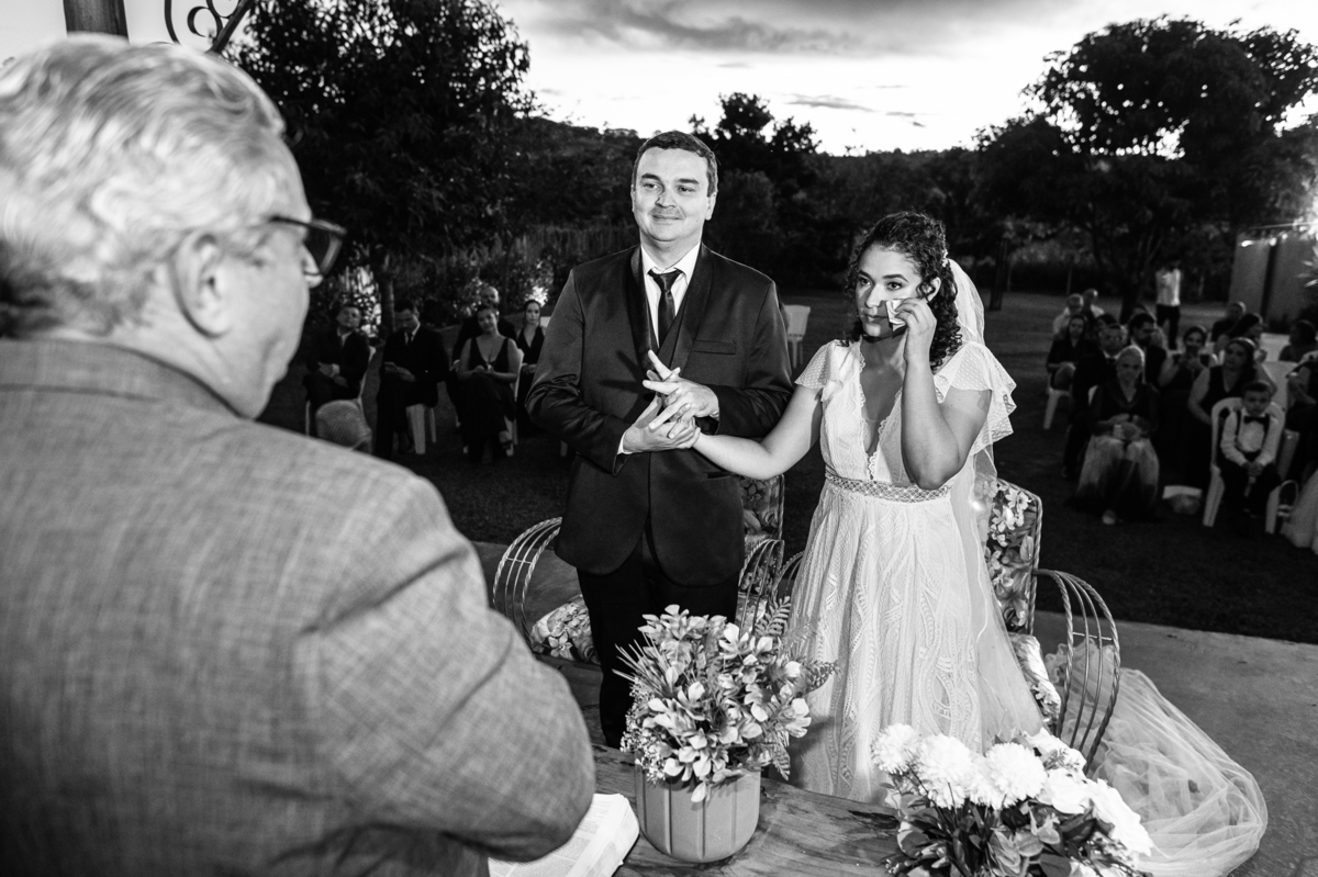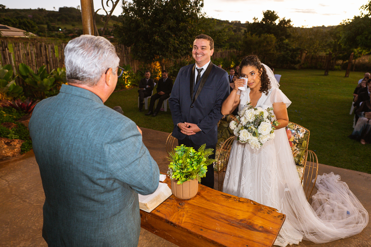 Eles despediram-se uns dos outros e agora juntos caminharam para o altar. Foram recepcionados pelo pastor celebrante que fez questão de tirar uma foto dos noivos antes de iniciar sua palavra. Toda a celebração foi emocionante do início ao final. O pastou preparou uma liturgia impecável, que uniu o trabalho dos noivos com a bíblia e o casamento. Foi incrível e muito especial. Ao final, os noivos fizeram seus votos super emocionantes, Holmes novamente surpreendeu sua noiva com uma música especial para presenteá-la na celebração. Os dois foram abençoados e declarados casados perante a lei dos homens e de Deus. Fizemos as fotografias de praxe e já preparamos a saída.