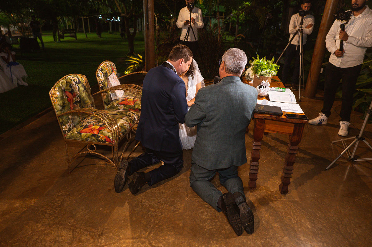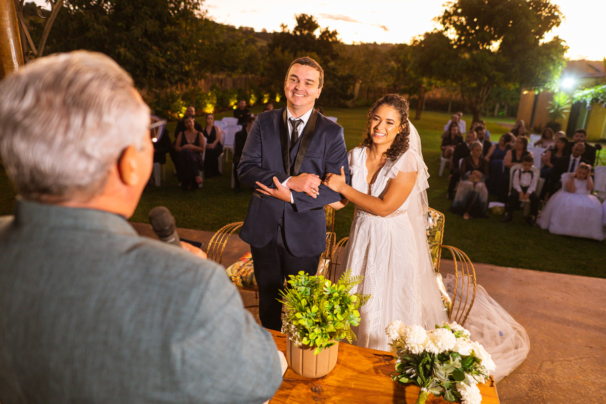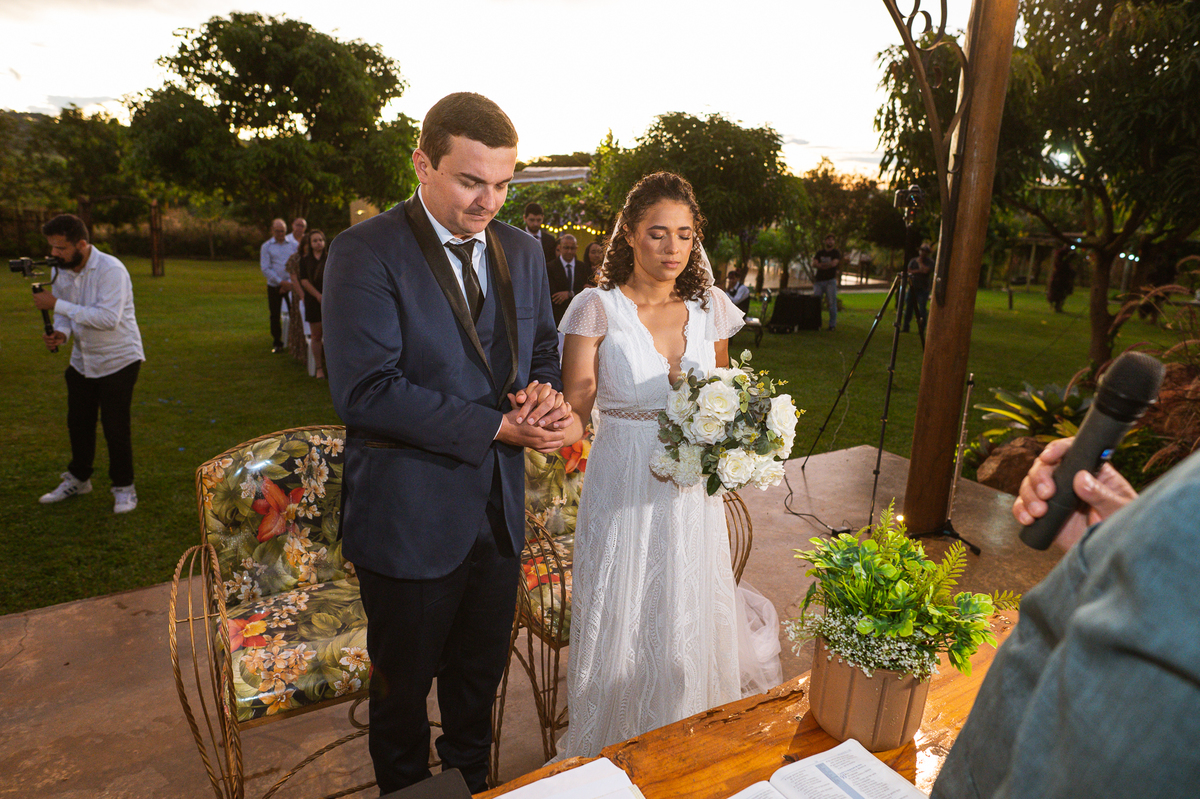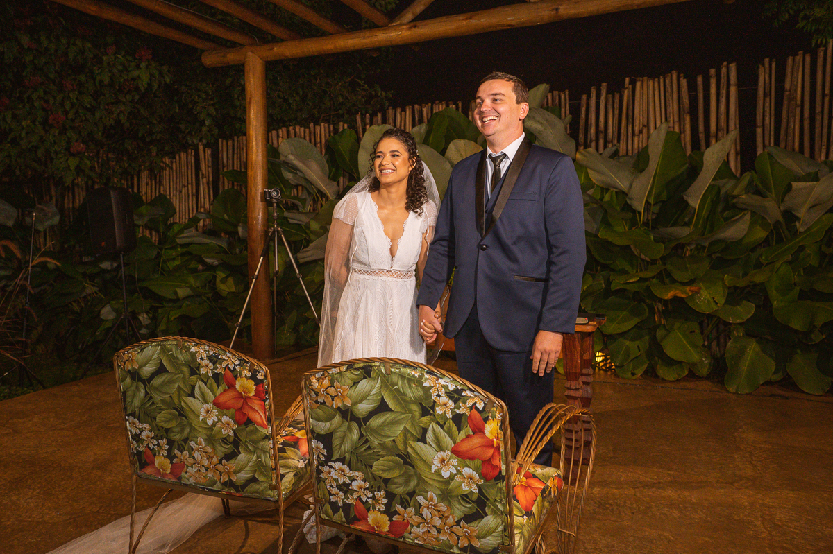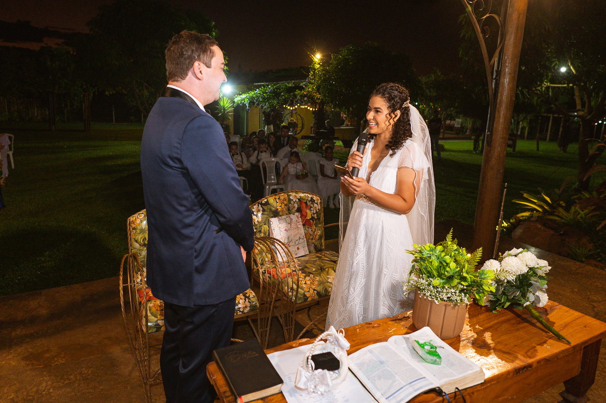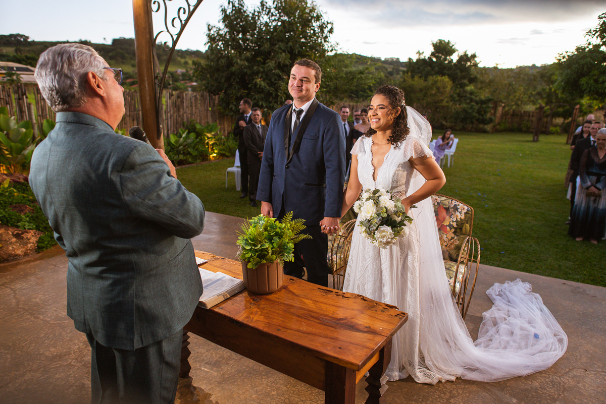 Eles despediram-se uns dos outros e agora juntos caminharam para o altar. Foram recepcionados pelo pastor celebrante que fez questão de tirar uma foto dos noivos antes de iniciar sua palavra. Toda a celebração foi emocionante do início ao final. O pastou preparou uma liturgia impecável, que uniu o trabalho dos noivos com a bíblia e o casamento. Foi incrível e muito especial. Ao final, os noivos fizeram seus votos super emocionantes, Holmes novamente surpreendeu sua noiva com uma música especial para presenteá-la na celebração. Os dois foram abençoados e declarados casados perante a lei dos homens e de Deus. Fizemos as fotografias de praxe e já preparamos a saída.
