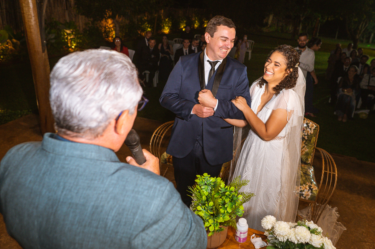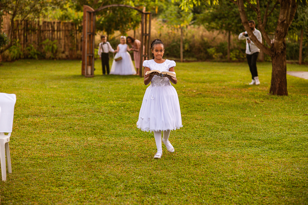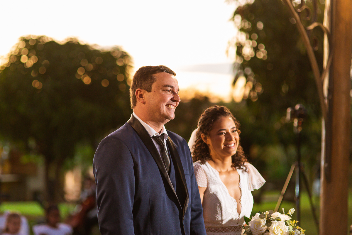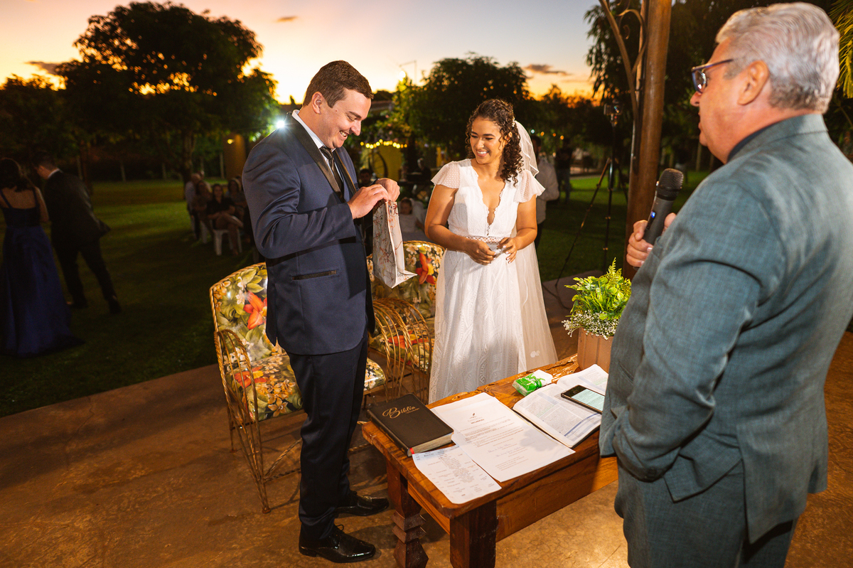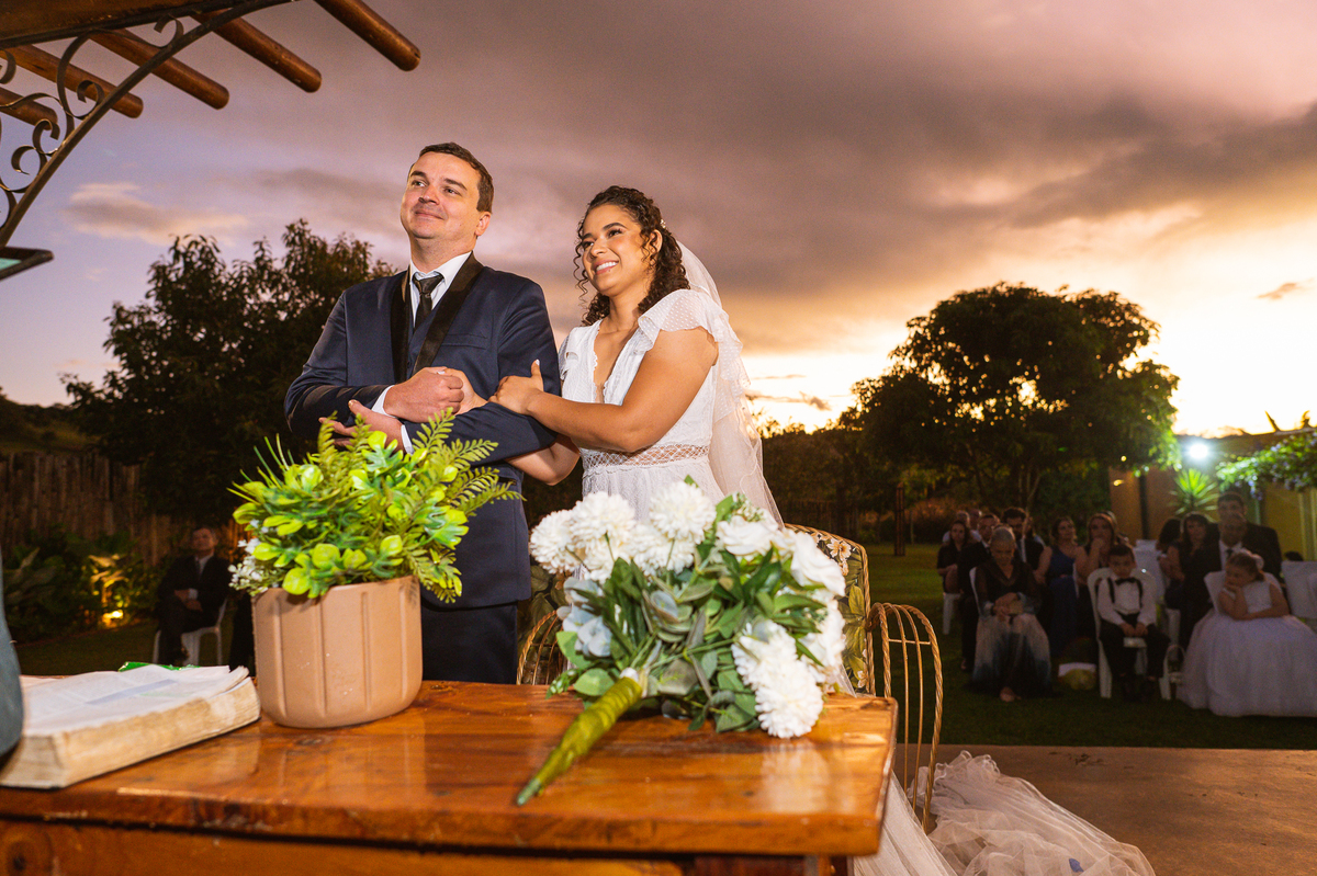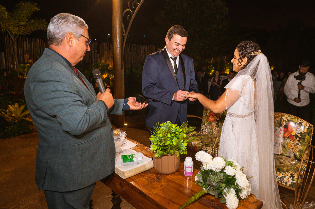 Eles despediram-se uns dos outros e agora juntos caminharam para o altar. Foram recepcionados pelo pastor celebrante que fez questão de tirar uma foto dos noivos antes de iniciar sua palavra. Toda a celebração foi emocionante do início ao final. O pastou preparou uma liturgia impecável, que uniu o trabalho dos noivos com a bíblia e o casamento. Foi incrível e muito especial. Ao final, os noivos fizeram seus votos super emocionantes, Holmes novamente surpreendeu sua noiva com uma música especial para presenteá-la na celebração. Os dois foram abençoados e declarados casados perante a lei dos homens e de Deus. Fizemos as fotografias de praxe e já preparamos a saída.
